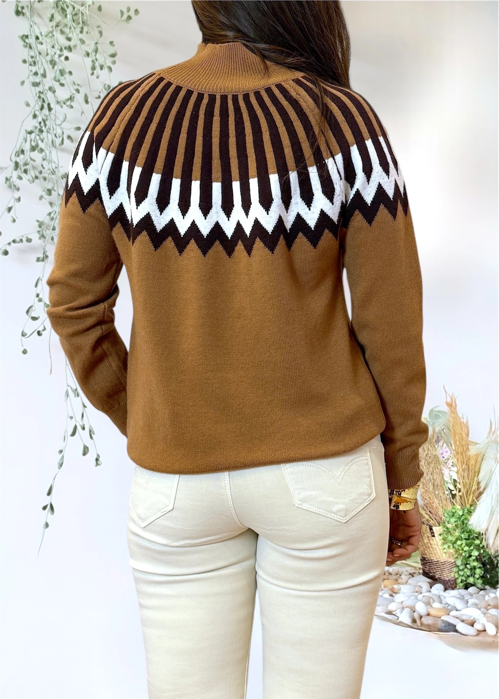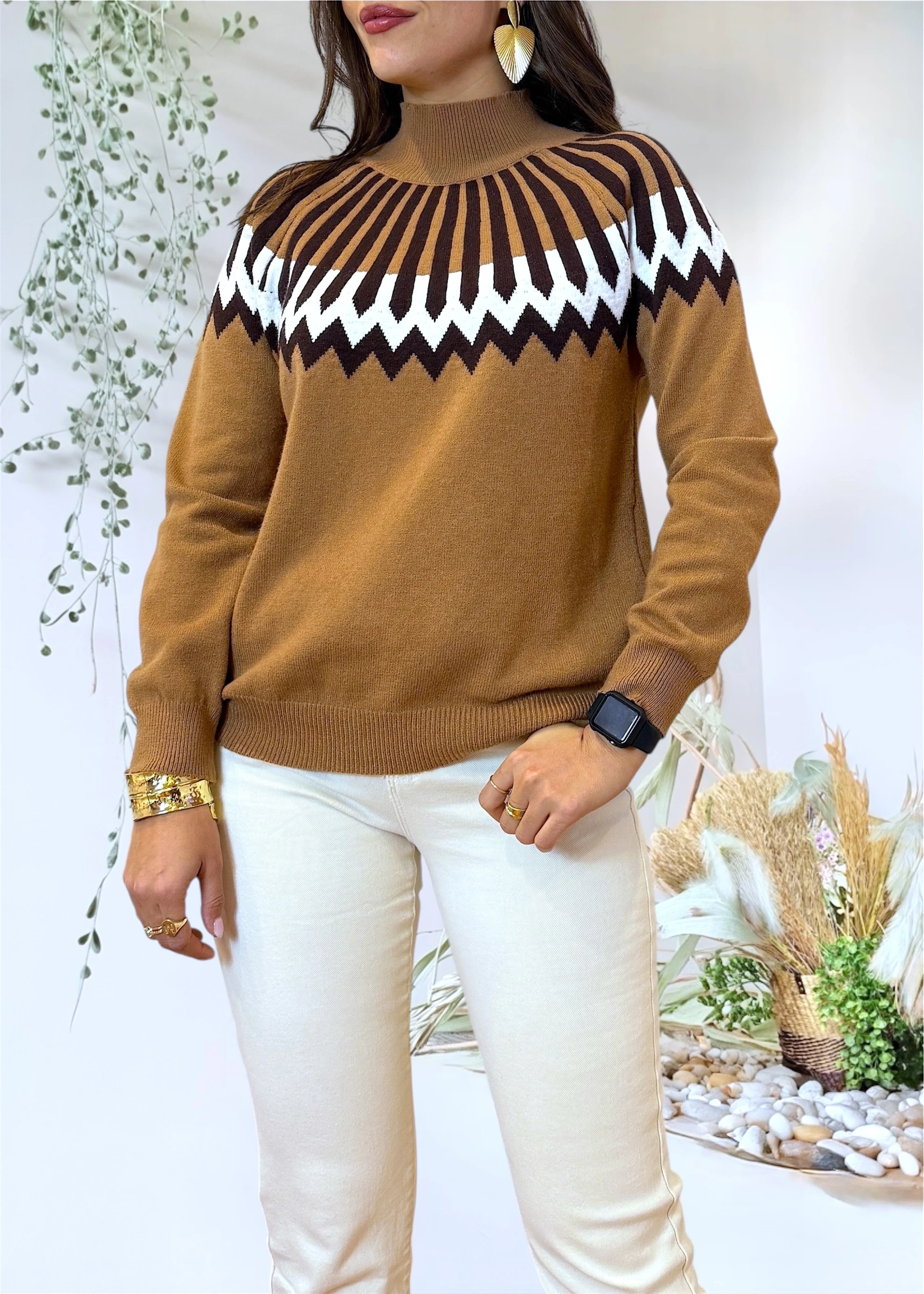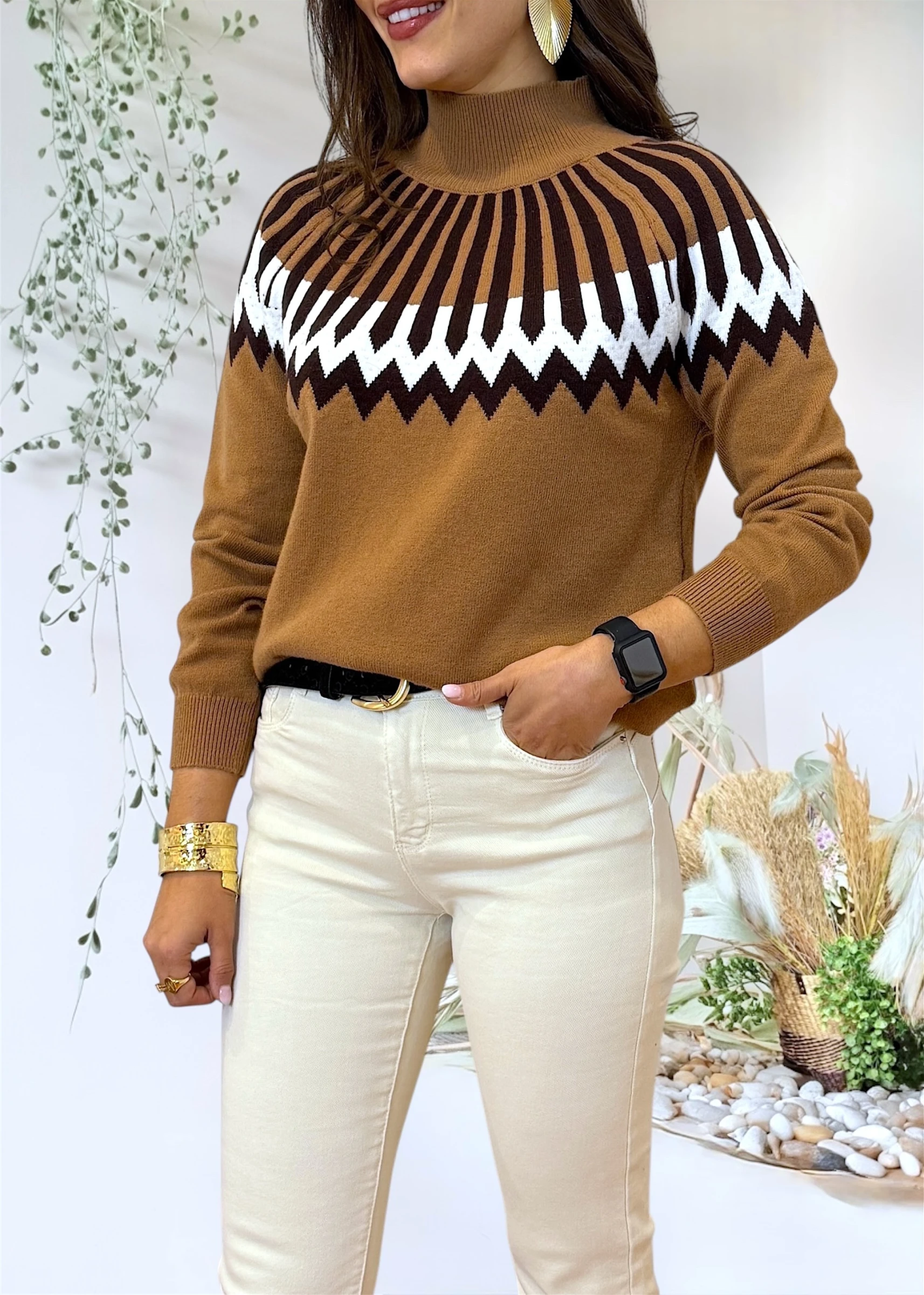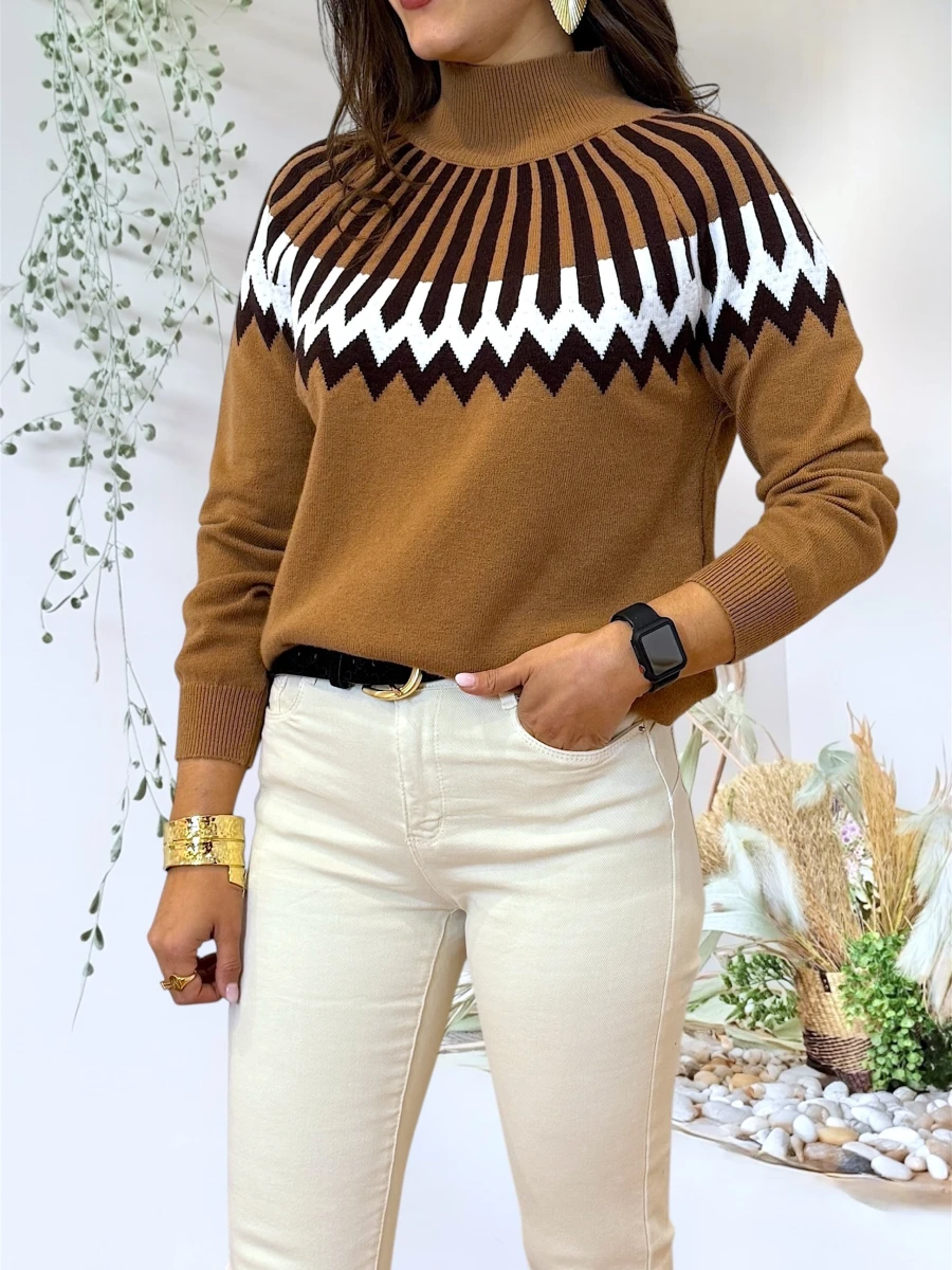 Jersey de punto en color camel con cenefas geométricas en negro y blanco, diseñado para combinar comodidad y diseño gráfico con un ajuste fluido.