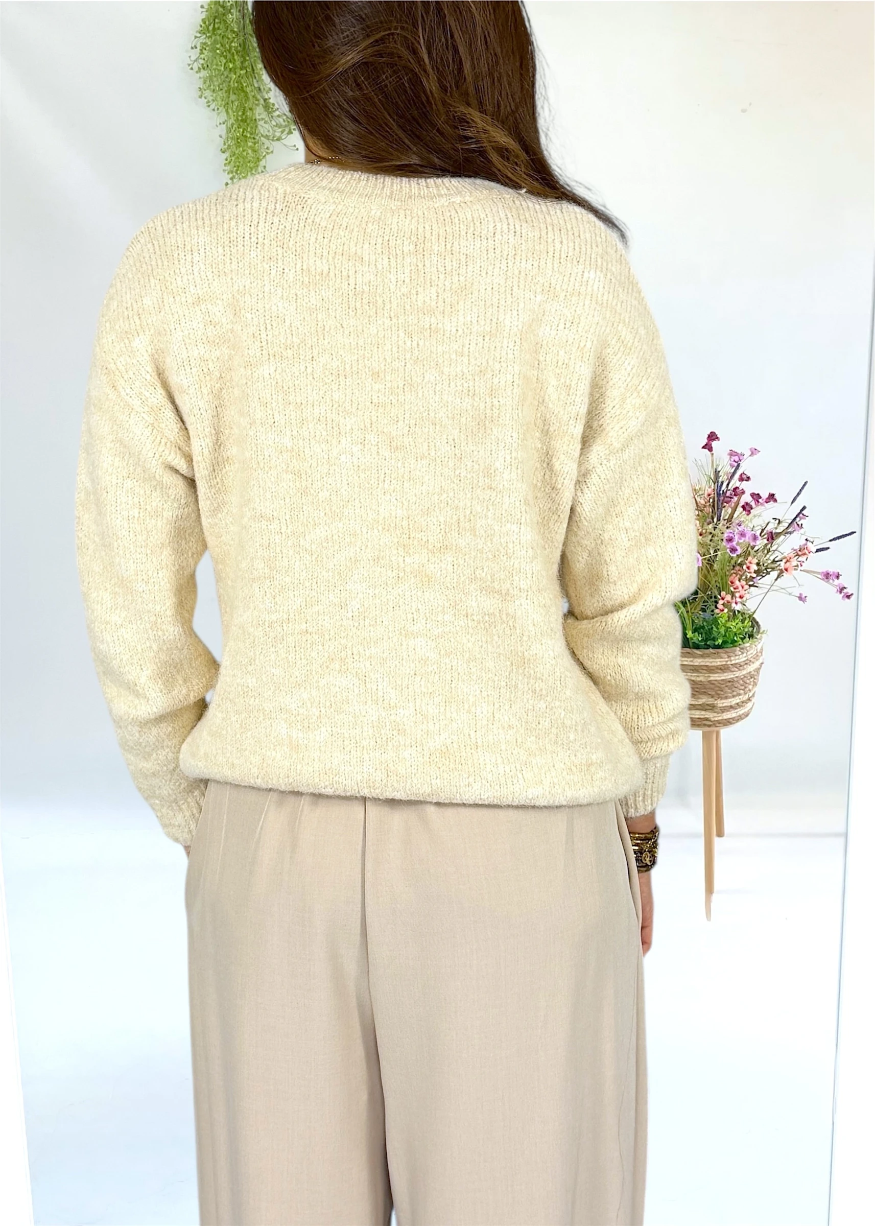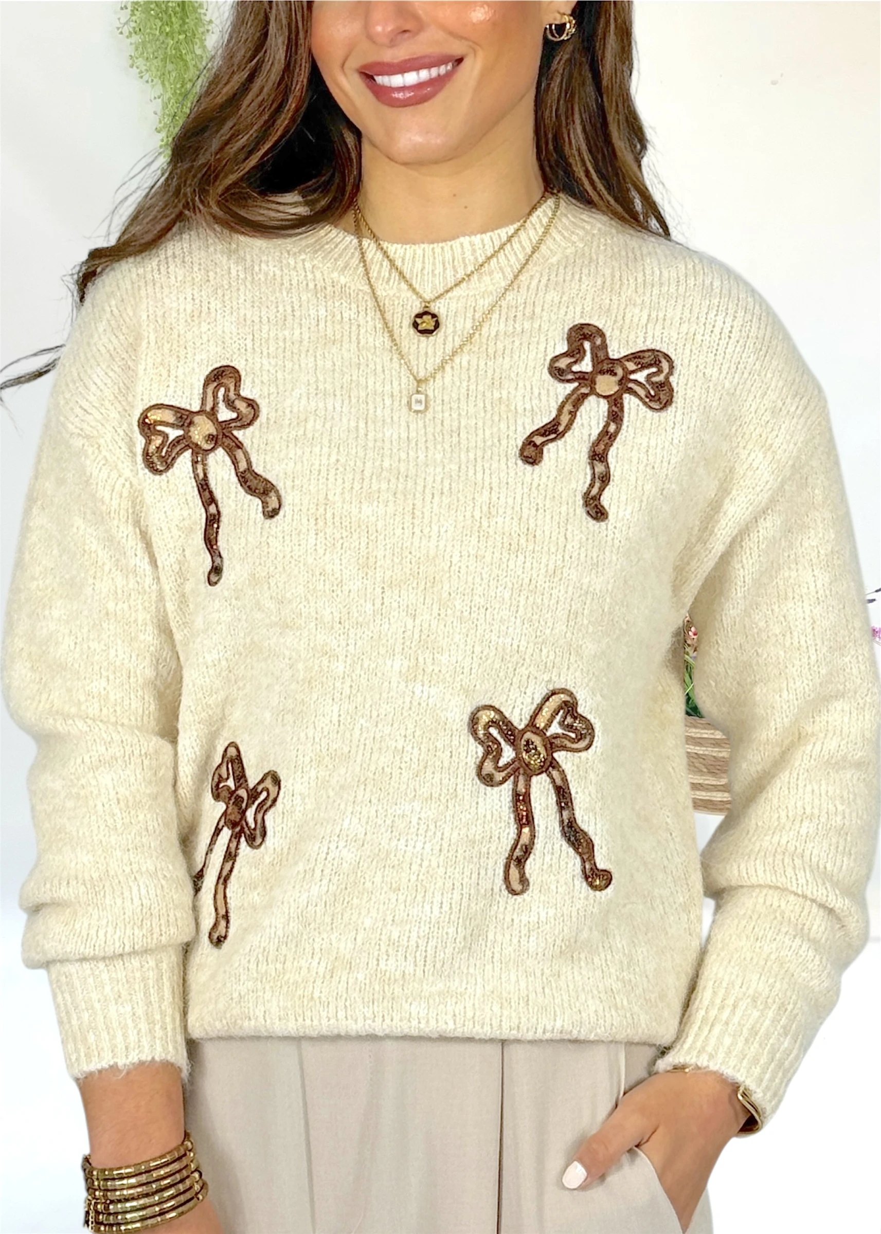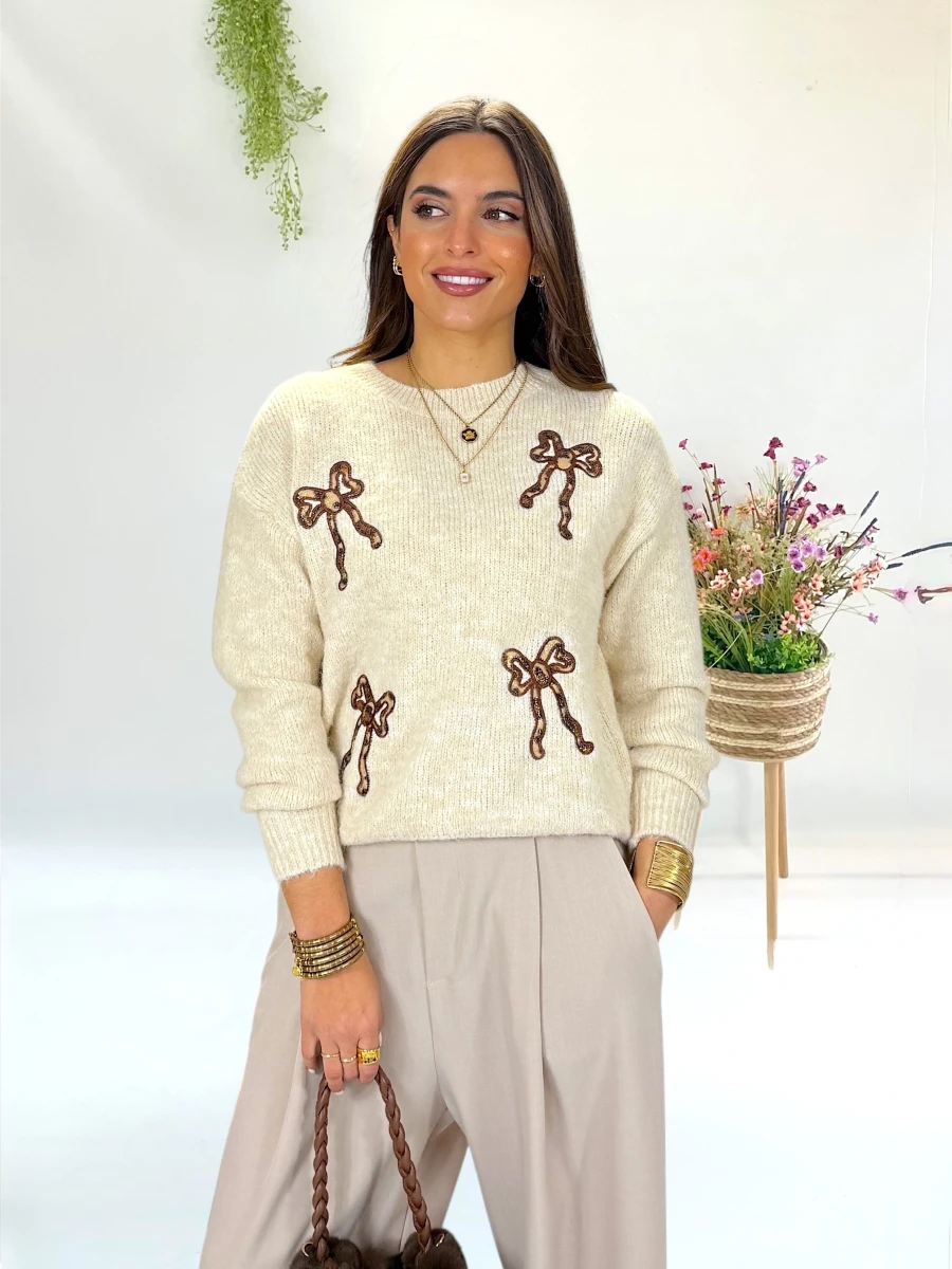 Jersey color beige con lazos animal print en beige y marrón. Corte cómodo y suave.