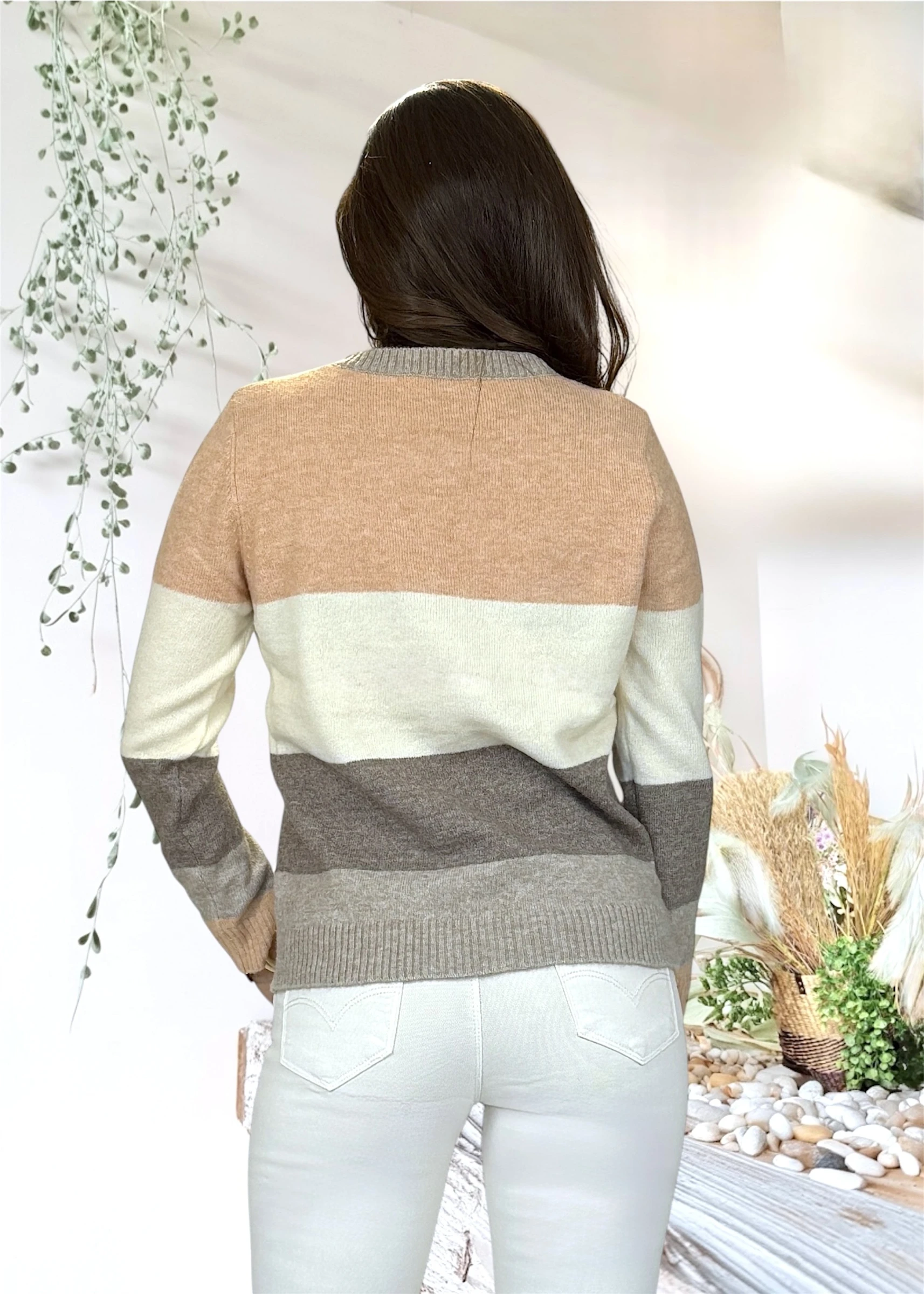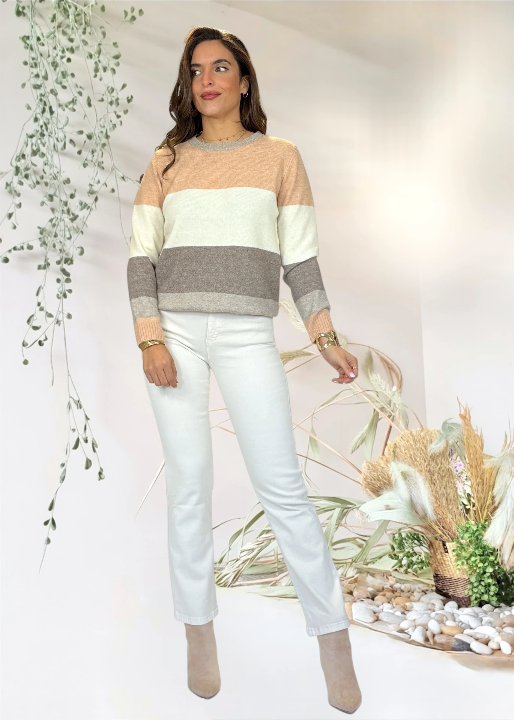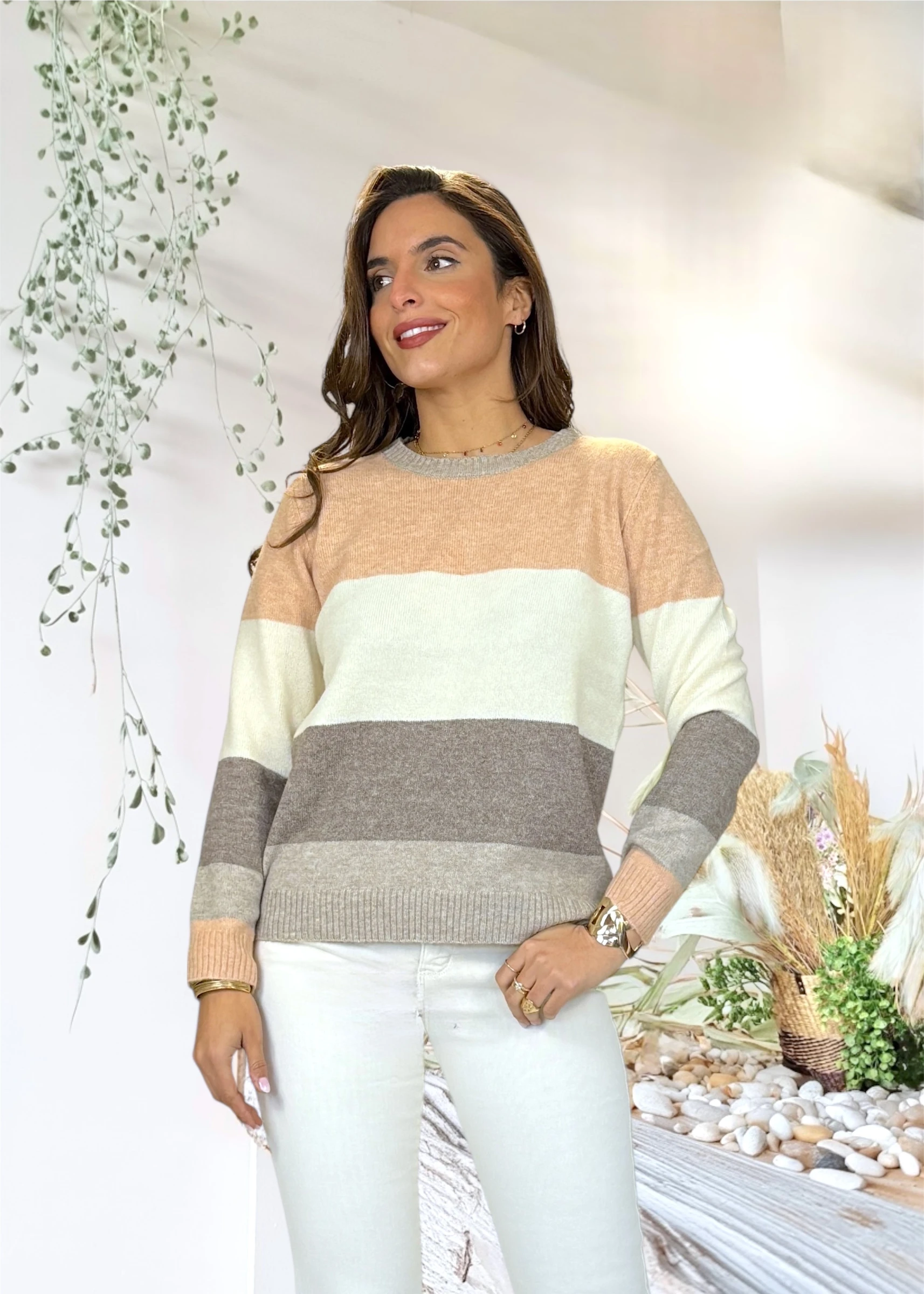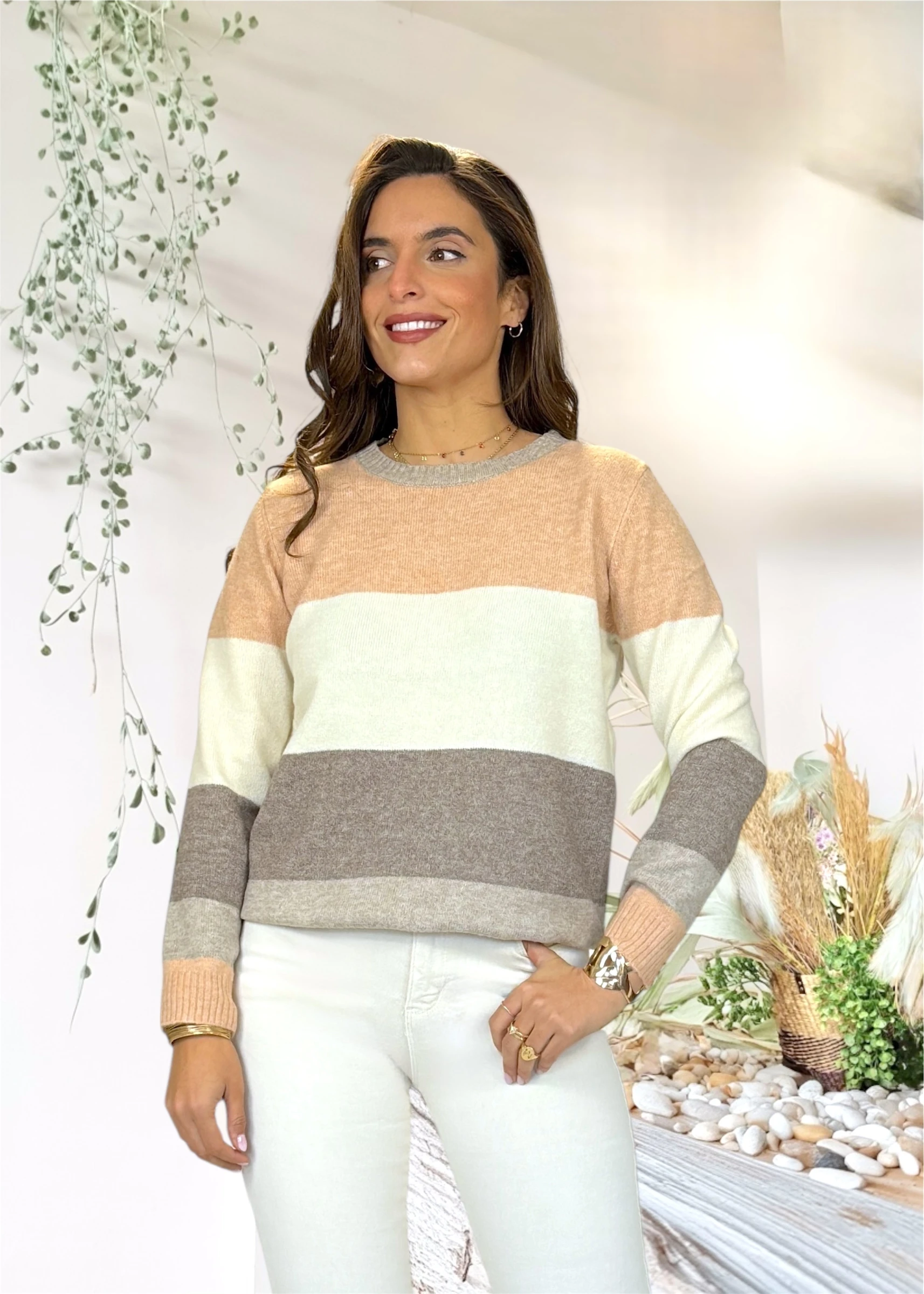 Jersey Eva de punto suave con diseño en bloques de color tierra, crudo, gris y melocotón, perfecto para looks relajados con un toque actual.