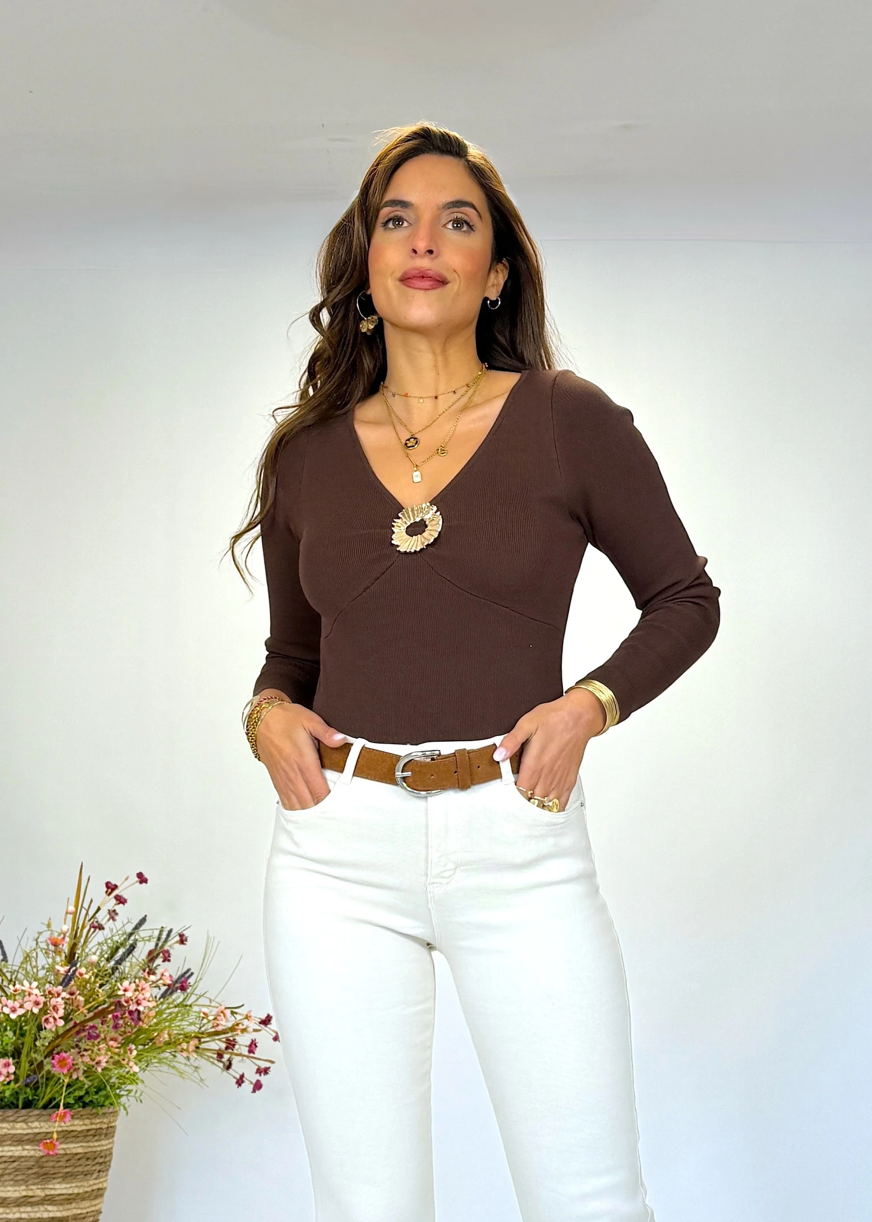 Jersey marrón de punto fino con broche dorado y escote pico que favorece y estiliza. Diseño ajustado que se adapta a la figura