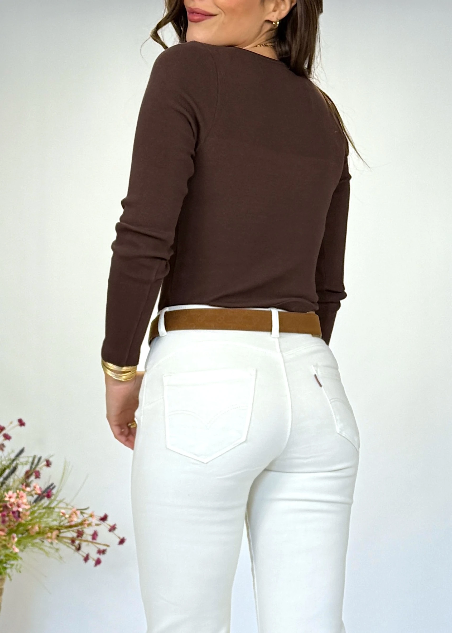 Jersey Fiore Marrón, una prenda femenina y versátil confeccionada en punto fino elástico que se adapta al cuerpo con suavidad.
