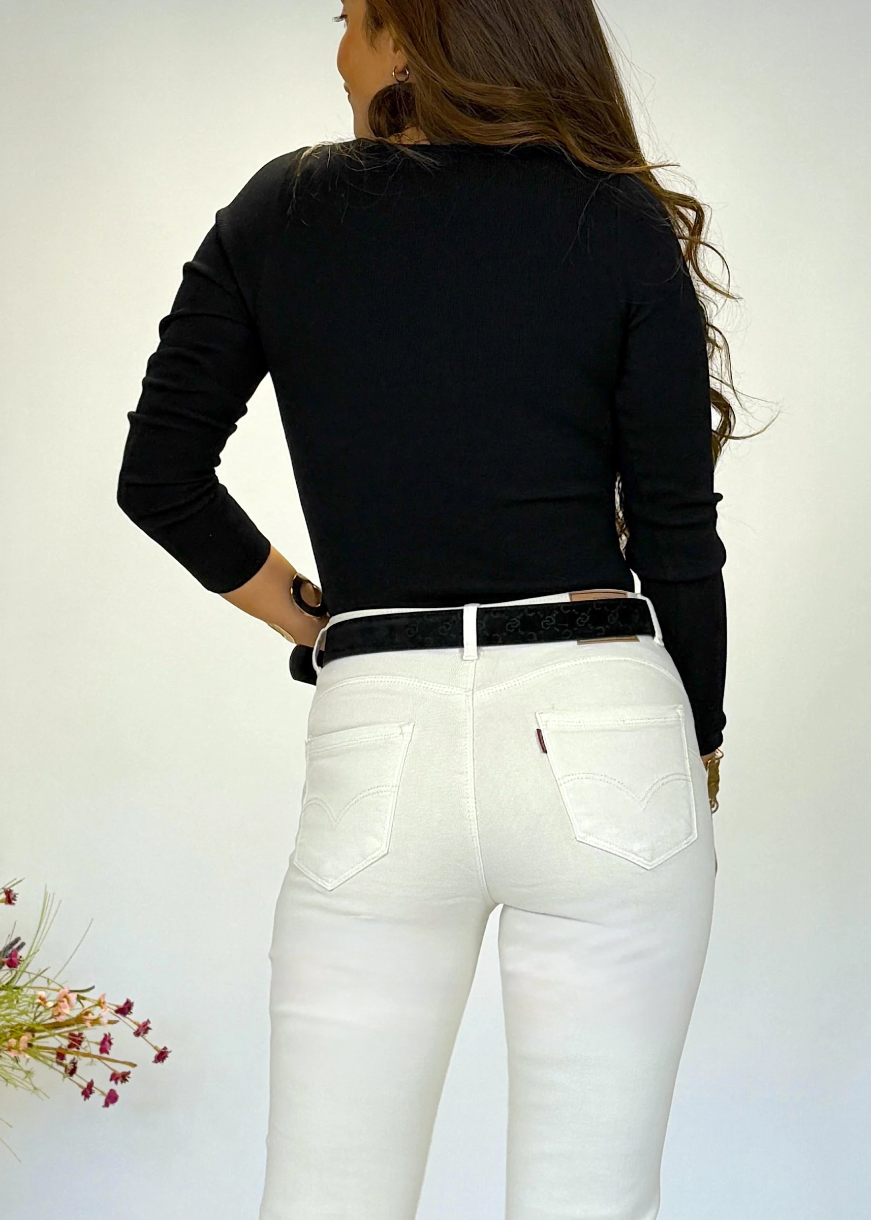 Jersey negro de punto fino con broche dorado y escote pico que favorece y estiliza. Diseño ajustado que se adapta a la figura