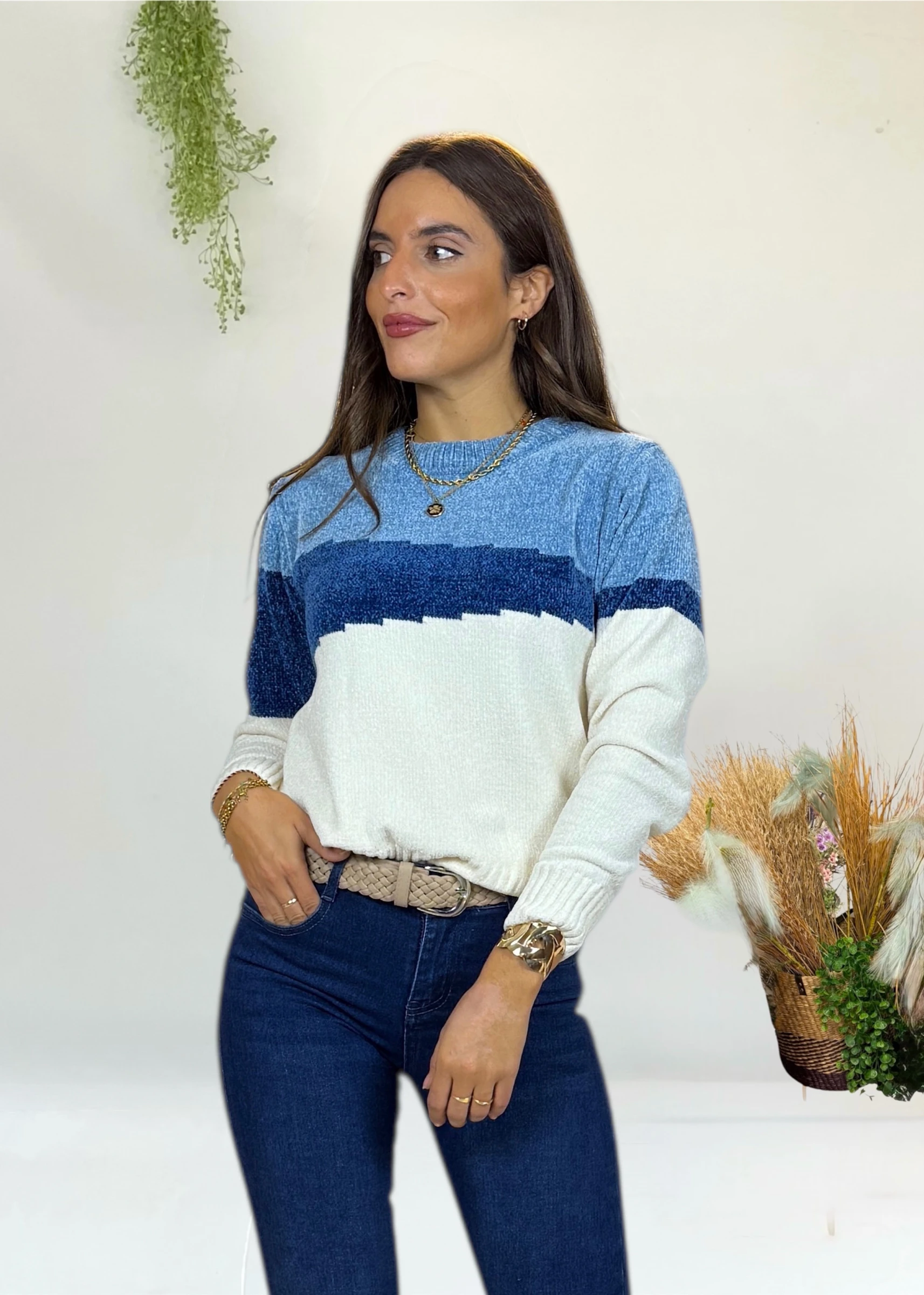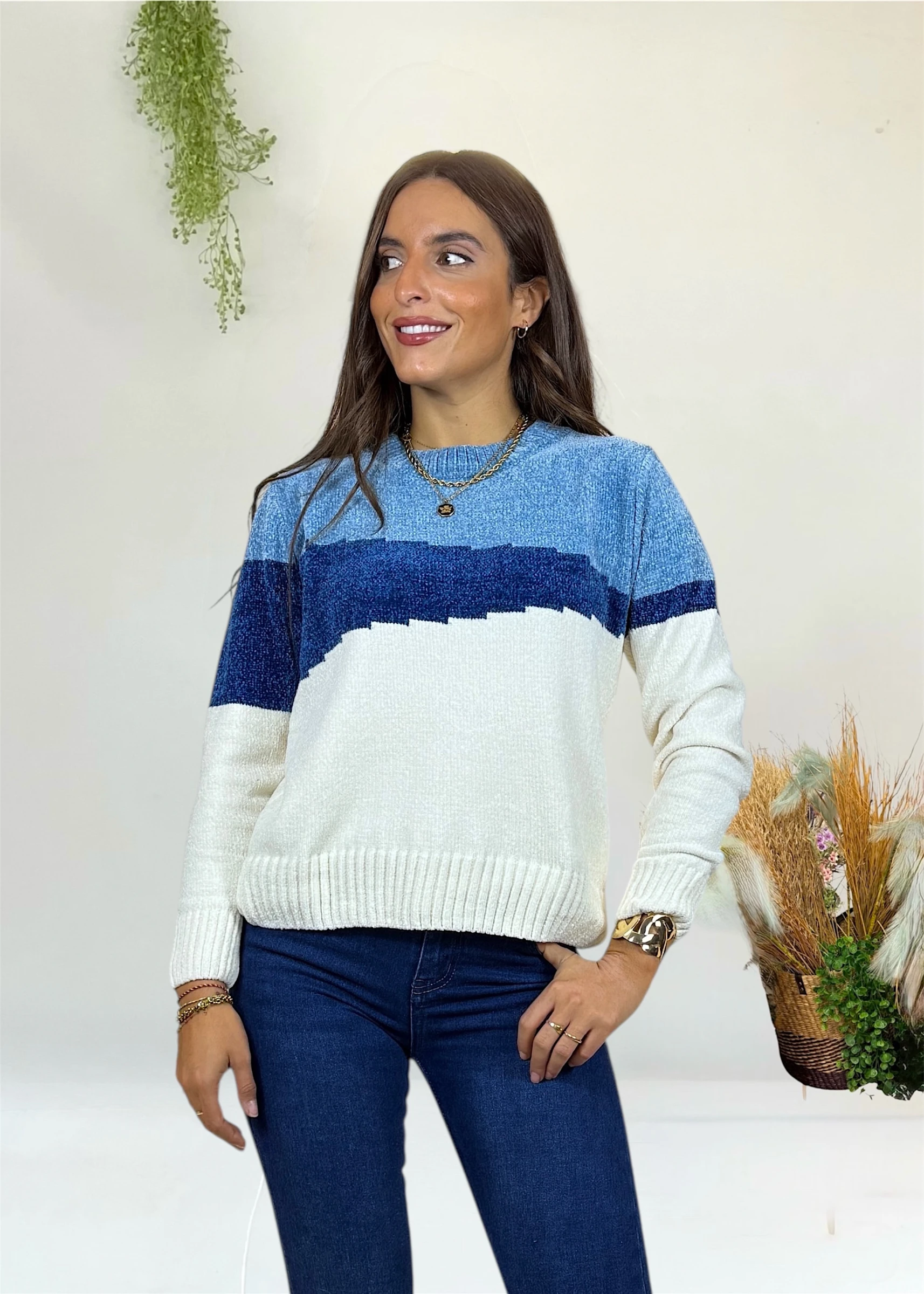 El contraste entre el beige y diferentes tonos de azul crea un efecto visual muy favorecedor, ideal para destacar en looks de diario con un aire sofisticado. Su textura extrasuave y caída relajada lo convierten en un básico con personalidad.