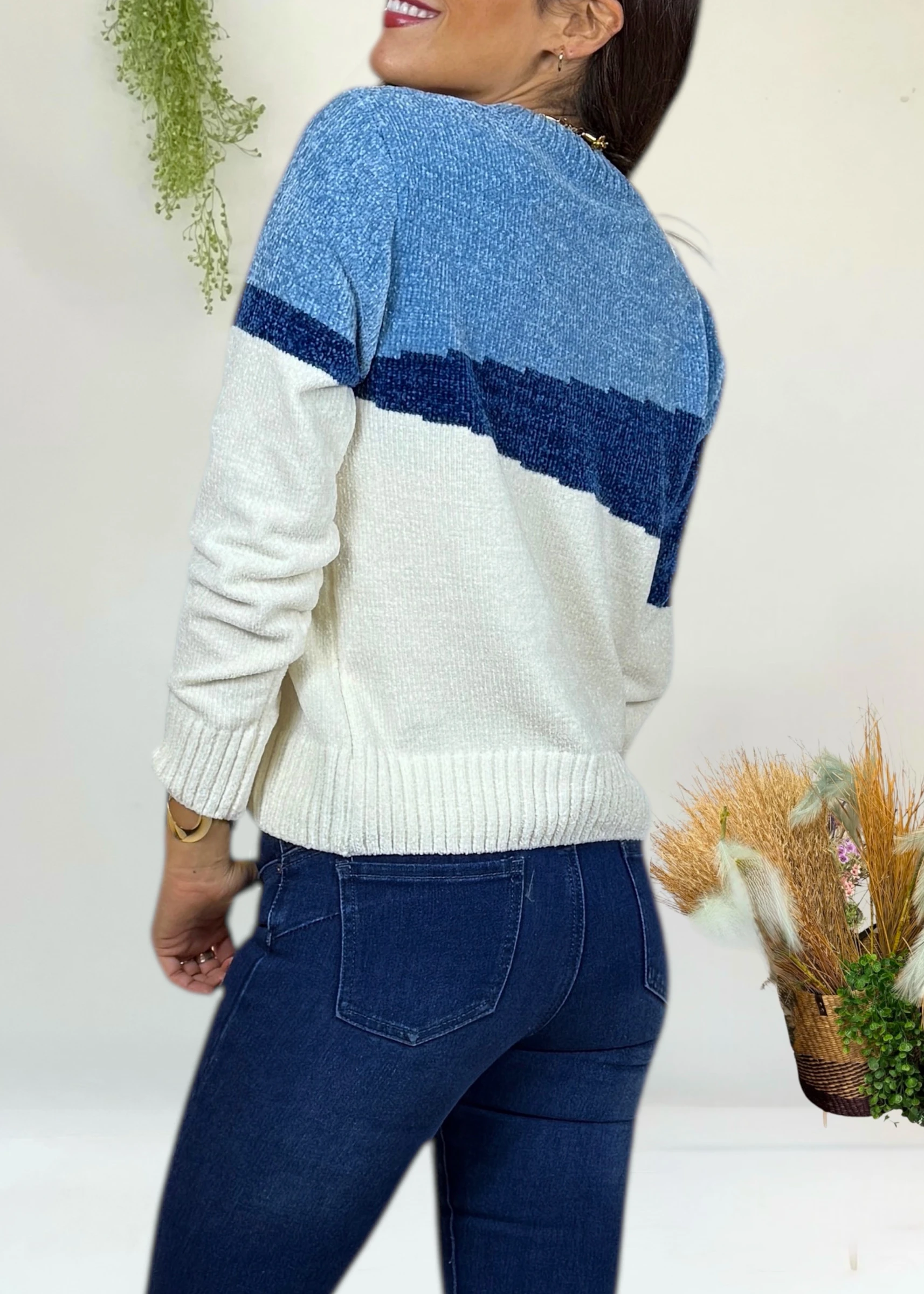 Jersey de chenilla con diseño geométrico en azules. Suave, original y cómodo: el toque perfecto para un look con estilo y personalidad.