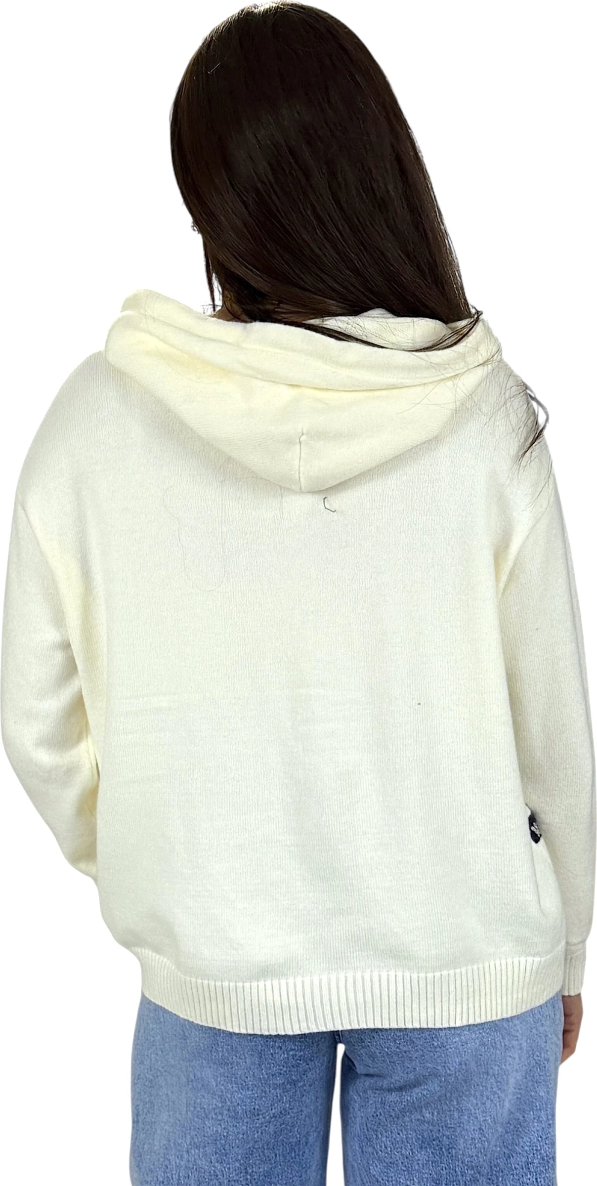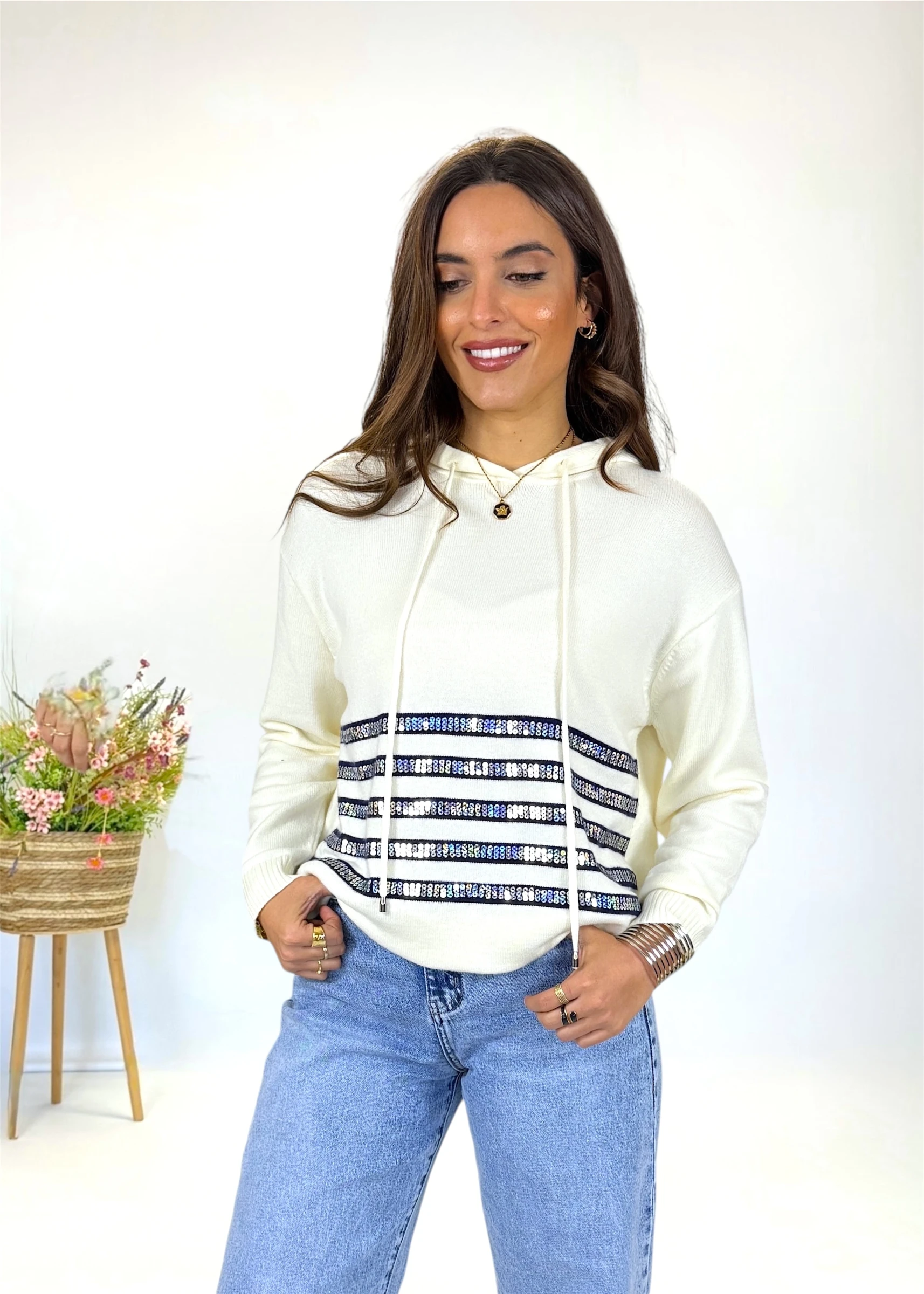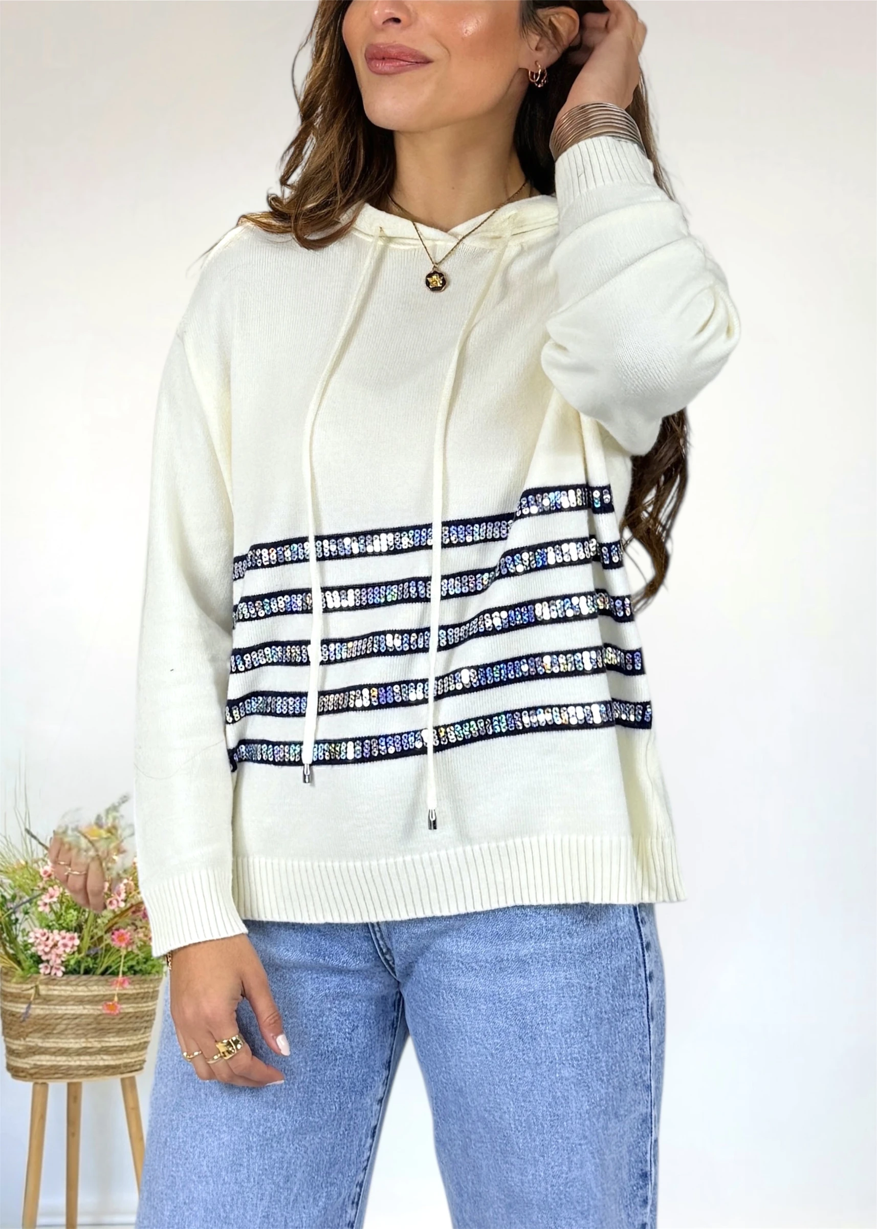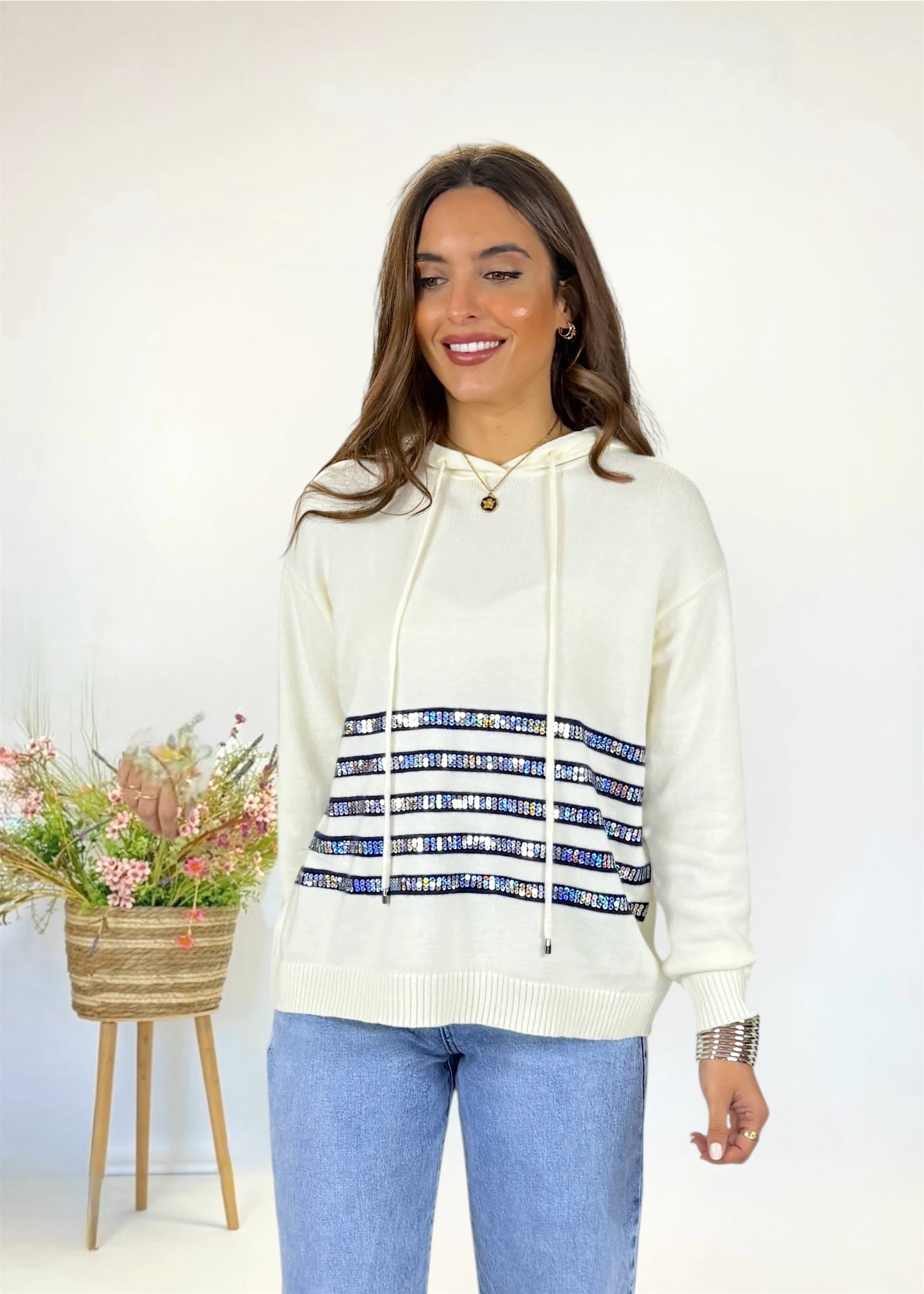 Jersey crudo con rayas horizontales en azul marino decoradas con lentejuelas. Corte recto, suelto y cómodo. Lleva capucha ajustable con cordones y acabados en canalé. Ideal para combinar estilo y confort.