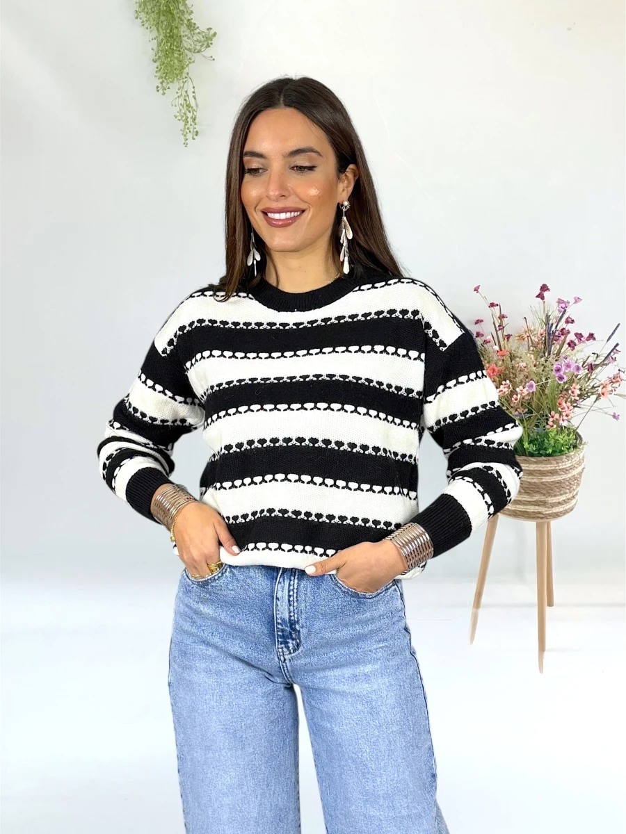 Jersey de rayas blanco y negro, corte recto, punto muy agradable. Disponible en S/M y L/XL. Comodidad y estilo en una sola prenda.