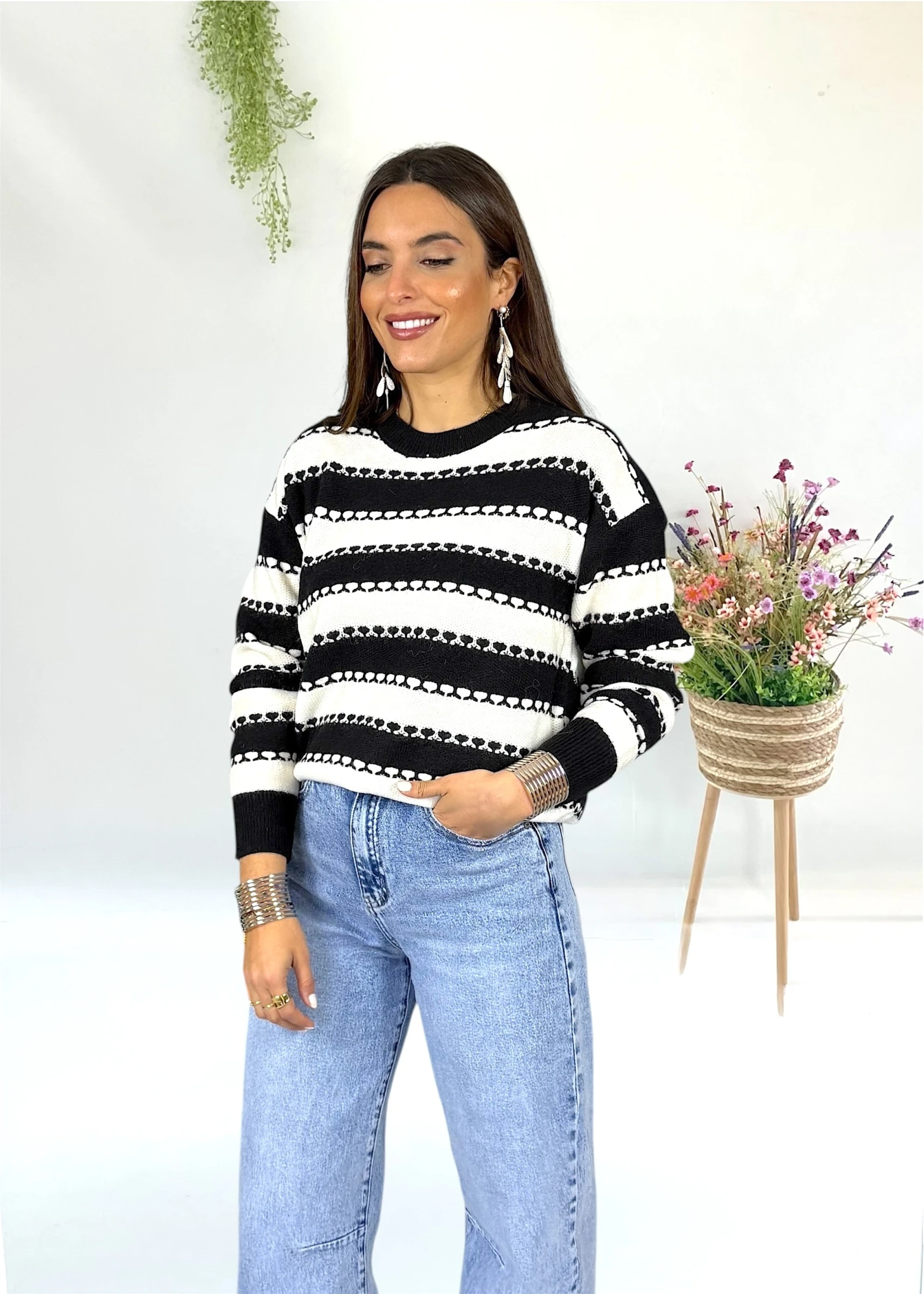 Jersey de rayas en blanco y negro confeccionado en punto muy suave y agradable al tacto. Corte recto y cómodo, perfecto para tu día a día. Su diseño atemporal lo convierte en una prenda fácil de combinar.