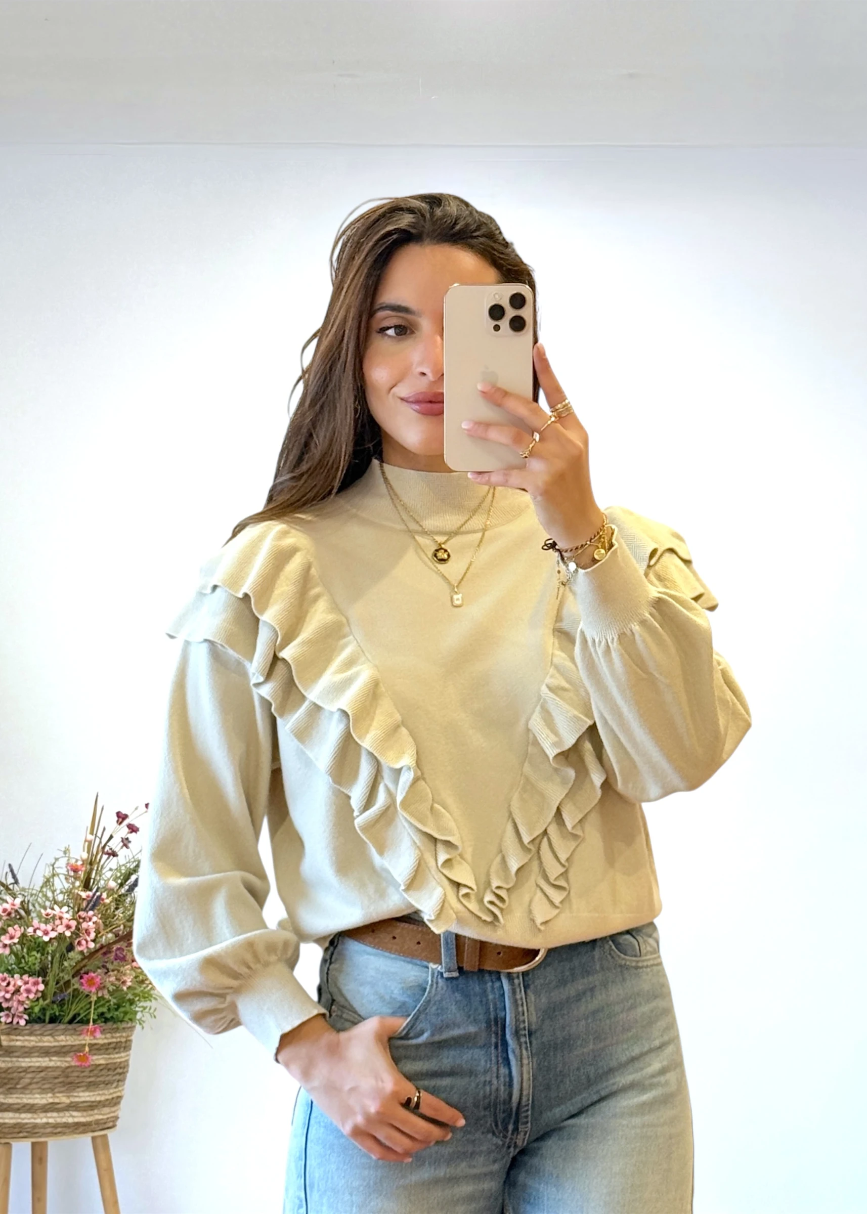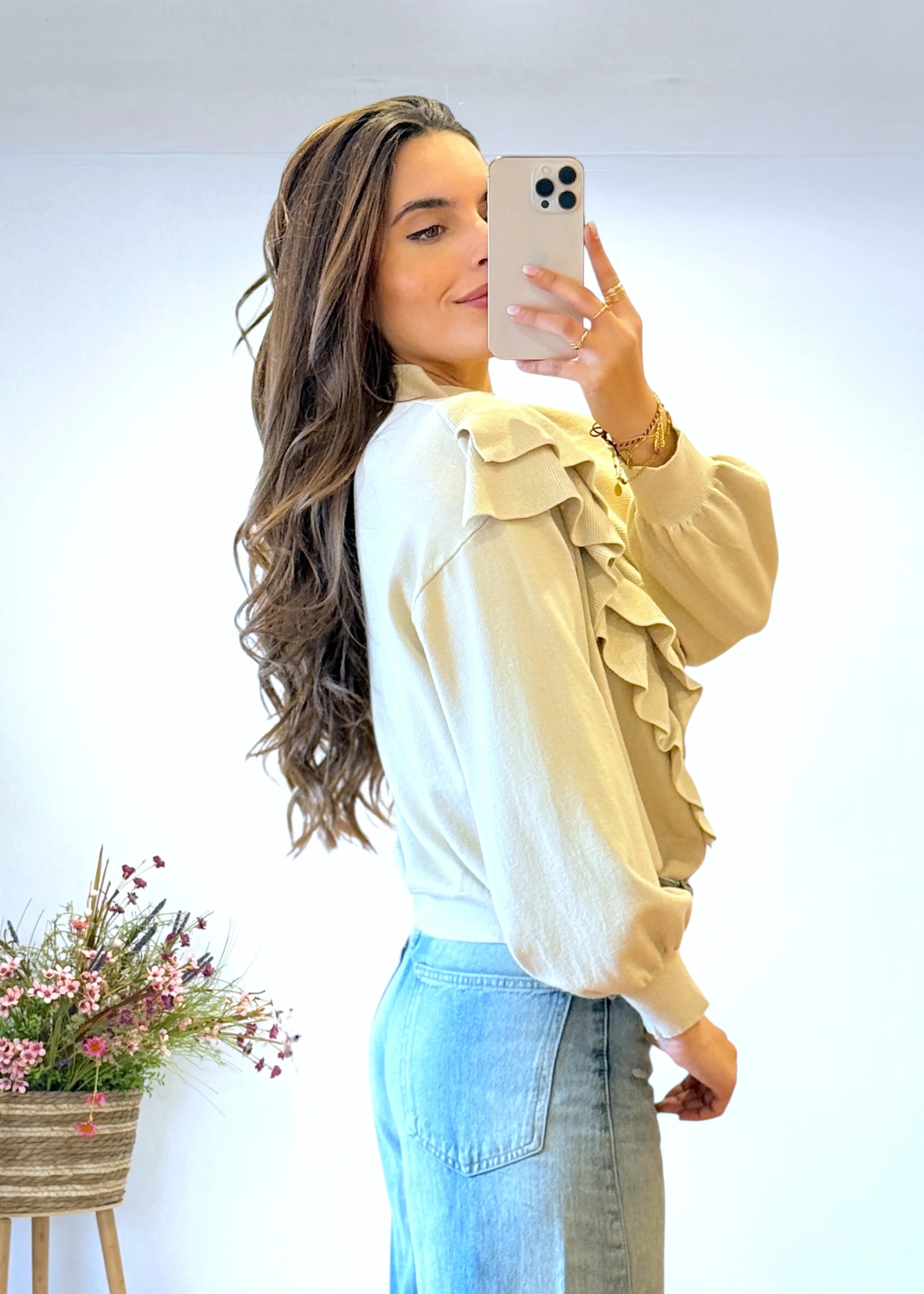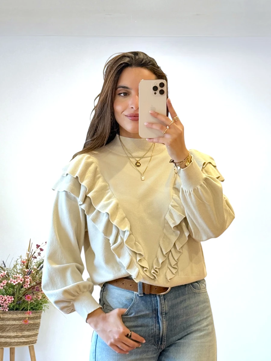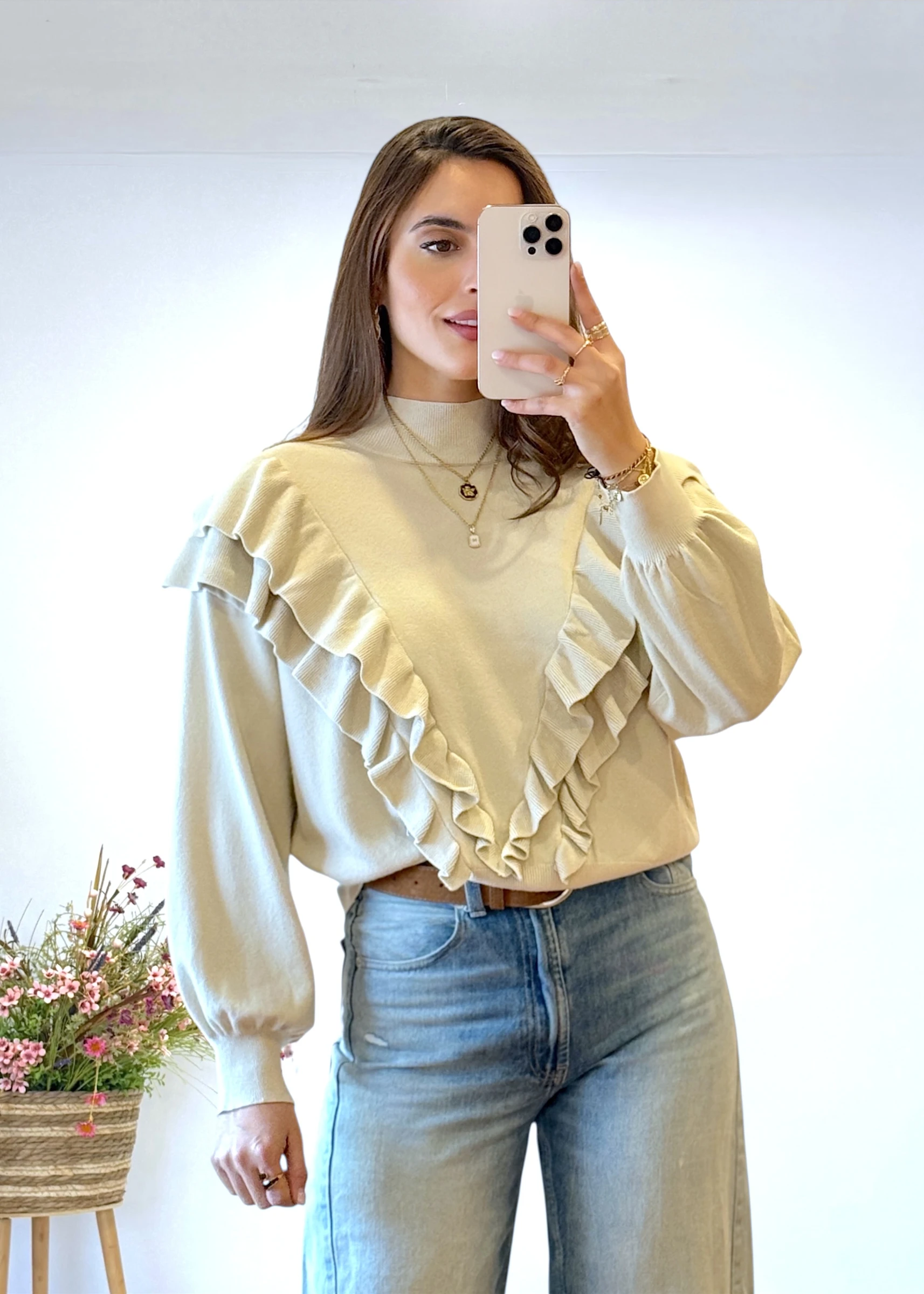Jersey de punto con diseño romántico, destaca por su detalle de volantes en forma de V en la parte frontal y sus mangas abullonadas. Un modelo versátil y favorecedor que aporta un toque muy femenino a tus looks de temporada.