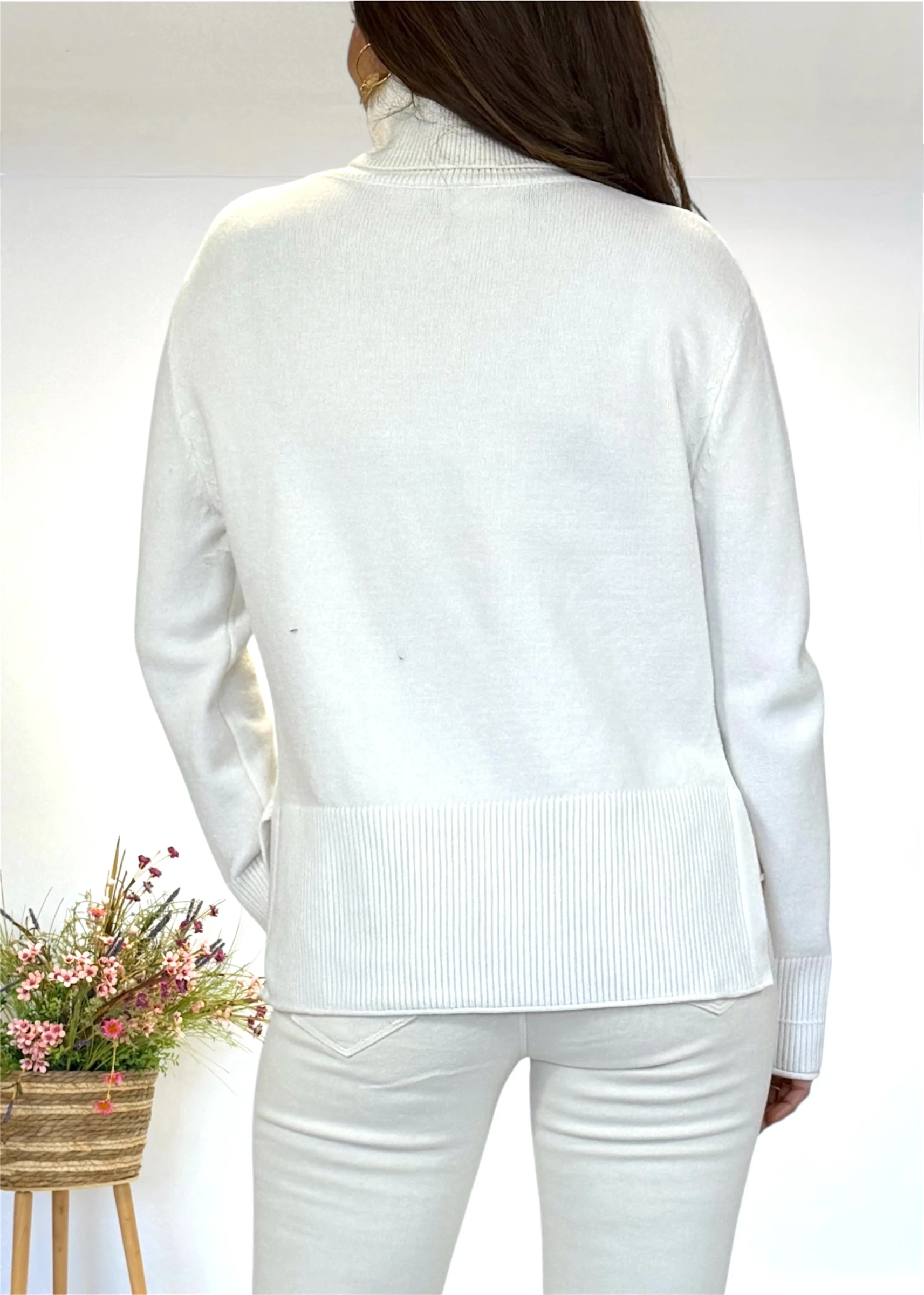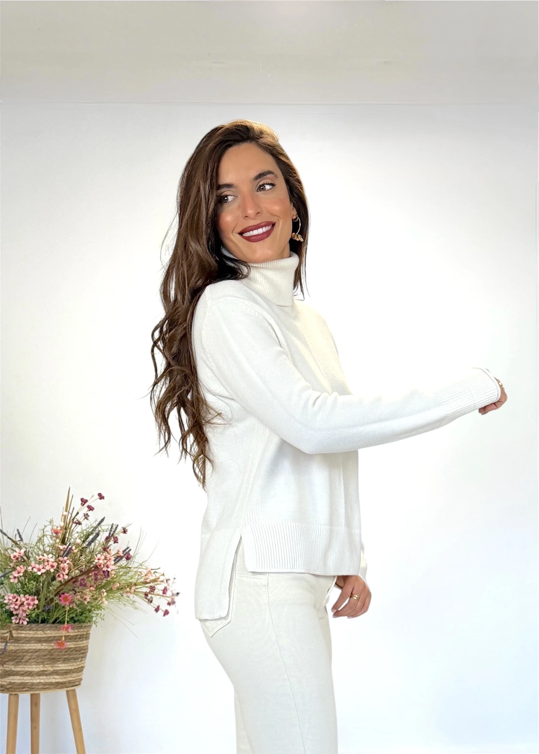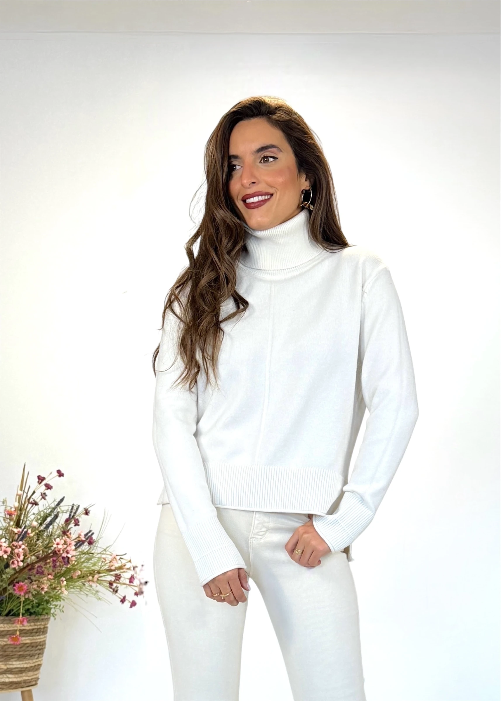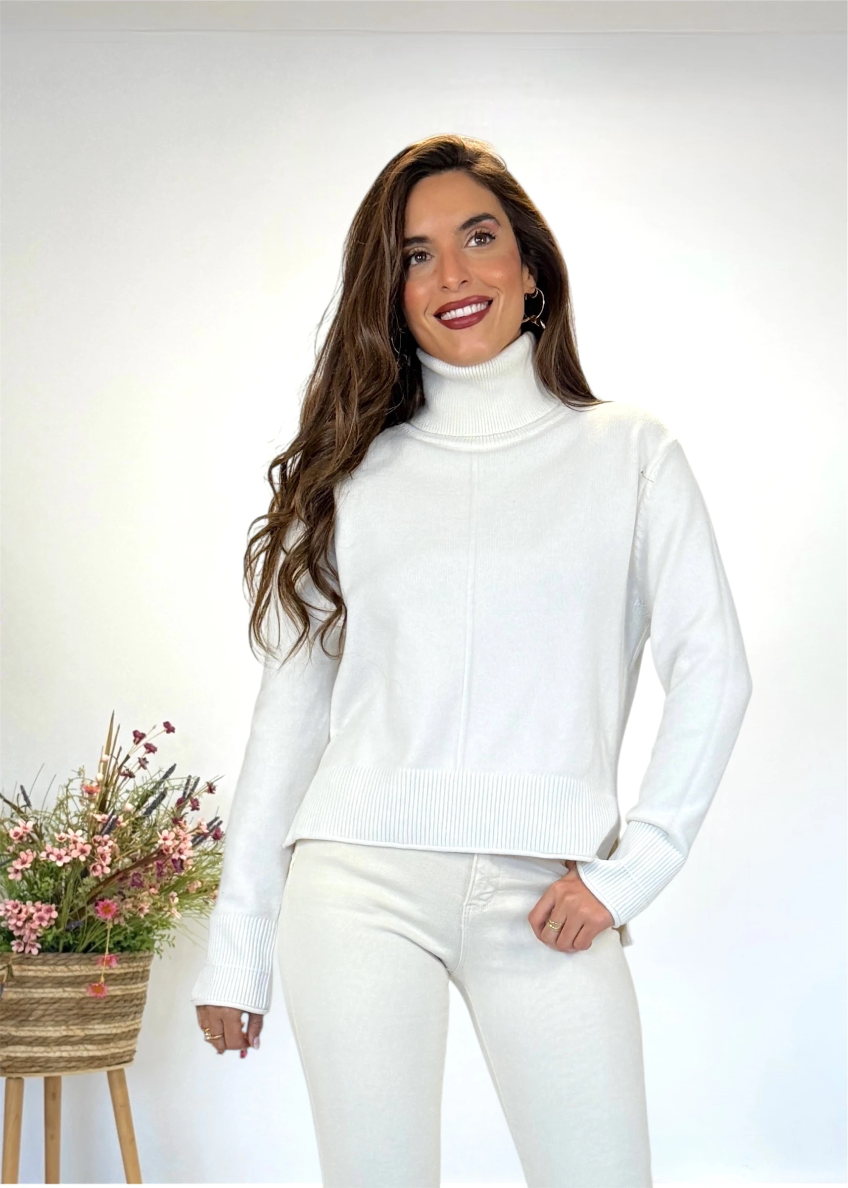 Su cuello vuelto tiene cuerpo pero resulta suave al contacto y no oprime, mientras que el bajo asimétrico con doble acabado en canalé añade un detalle técnico y actual.