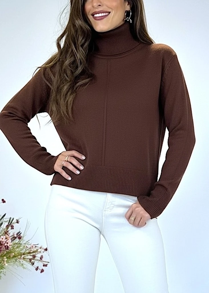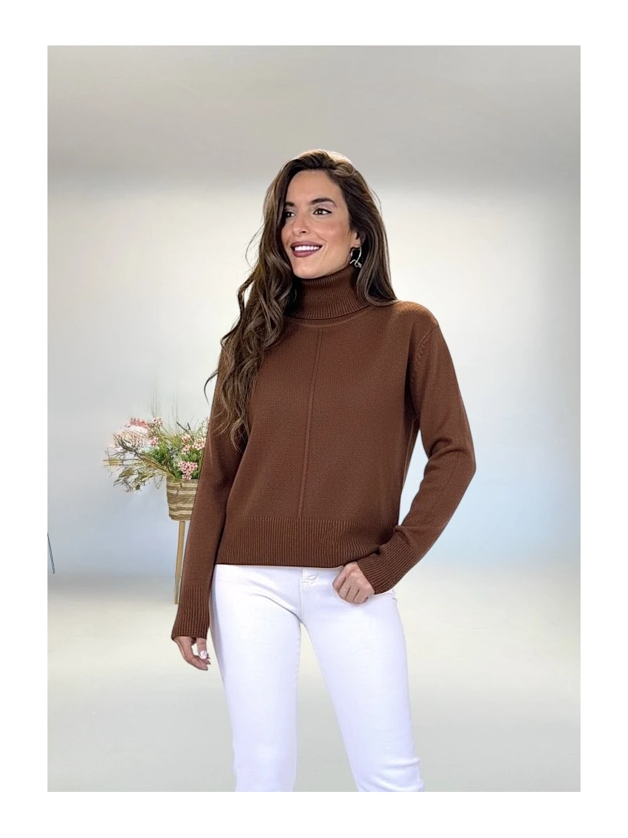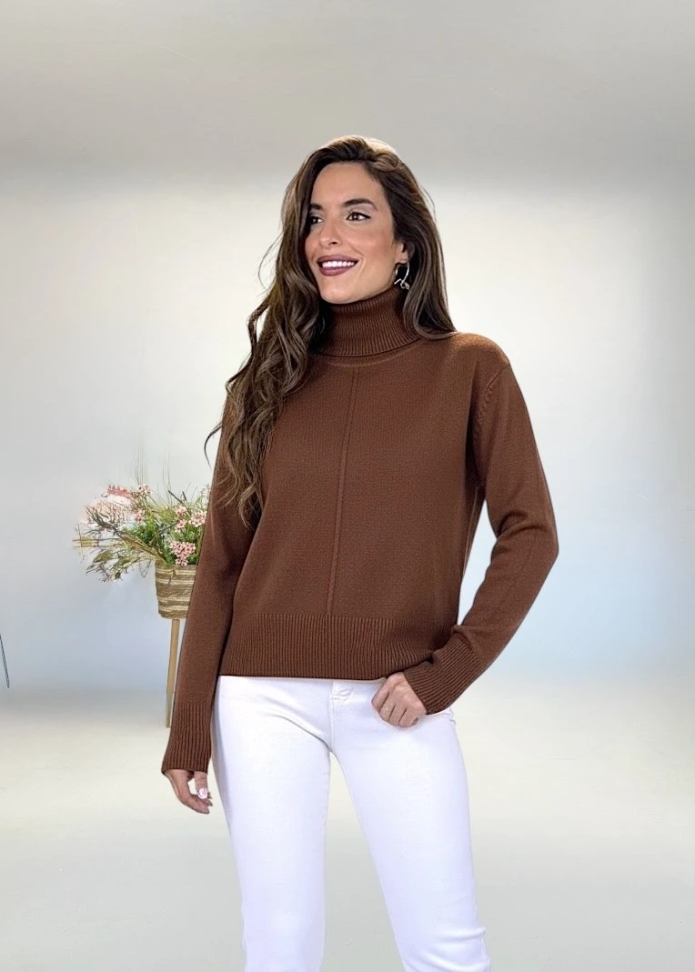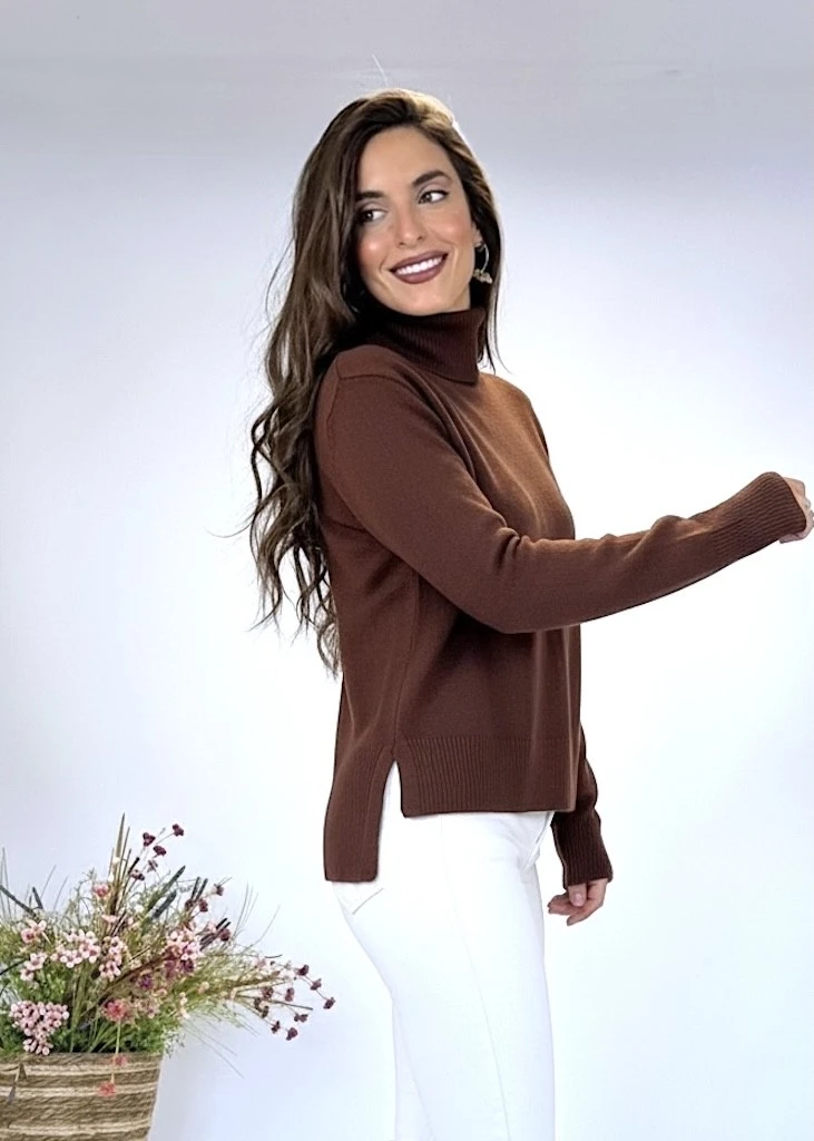 Jersey marron de corte recto con cuello vuelto suave y bajo asimétrico. Diseño recto, suelto y cómodo para el día a día.