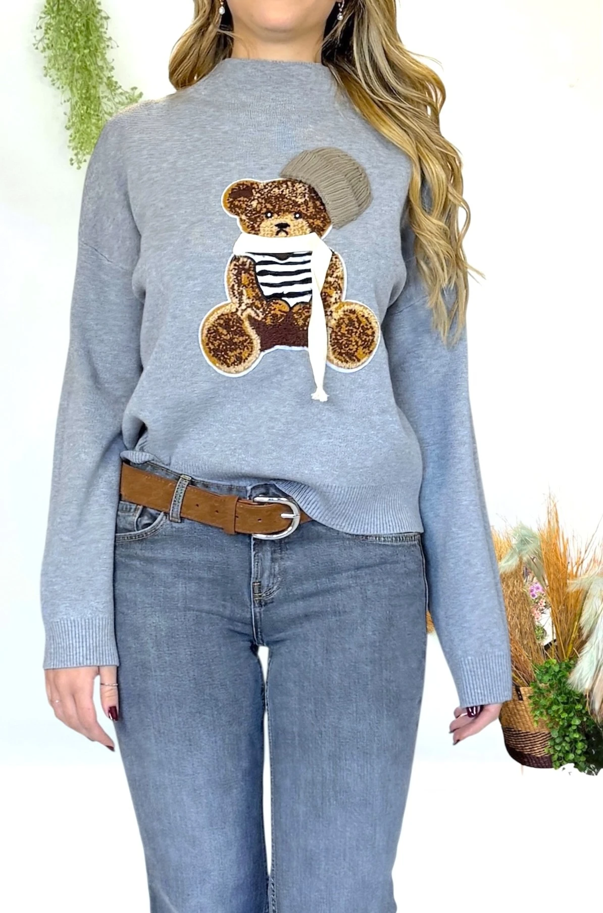 Jersey beige con osito bordado, cálido y con encanto. Un toque divertido y chic para looks casuales con pantalón o falda.
