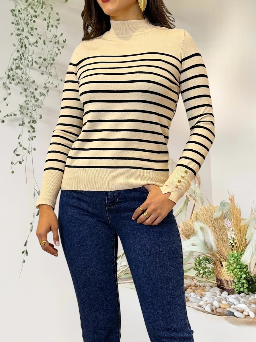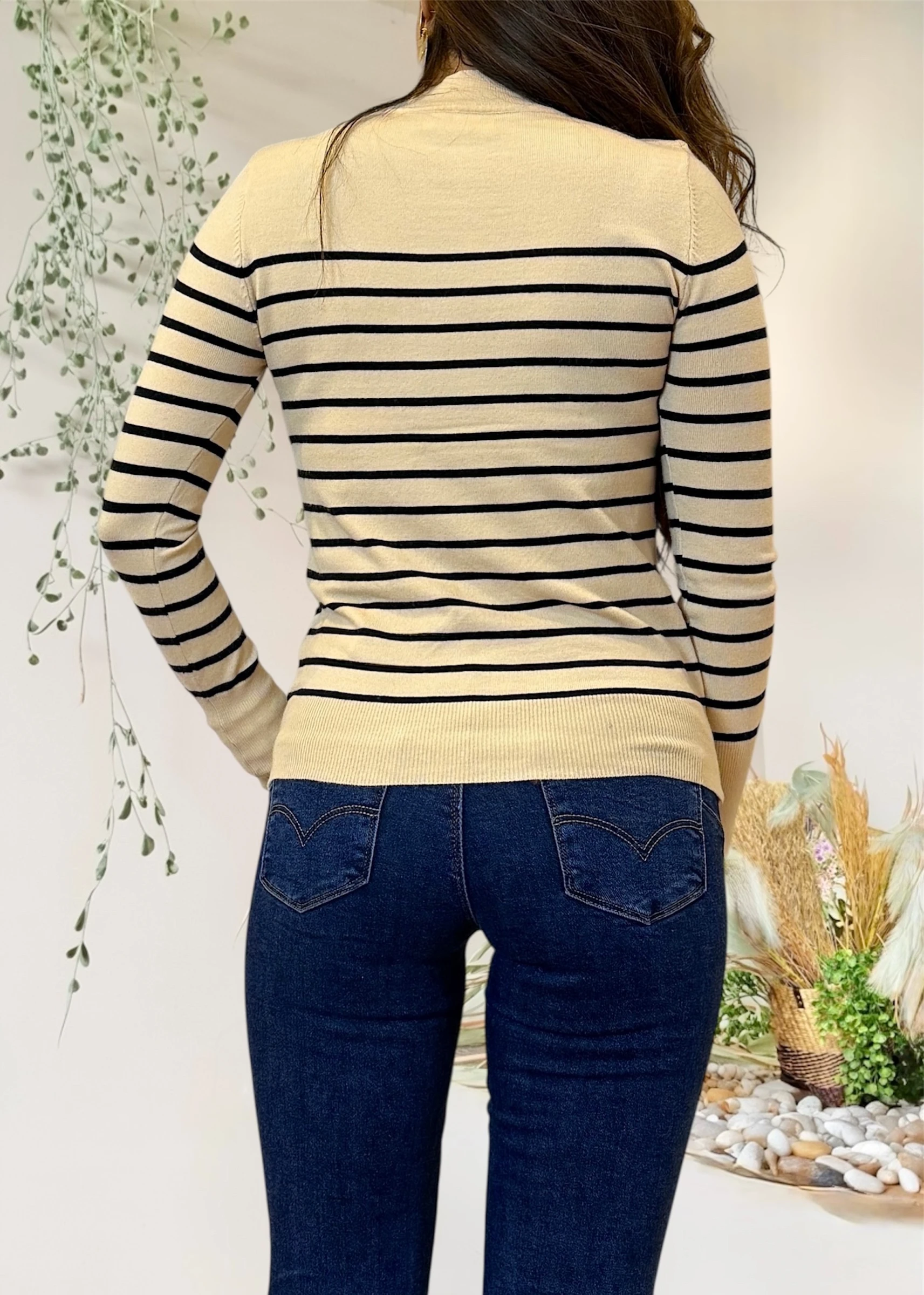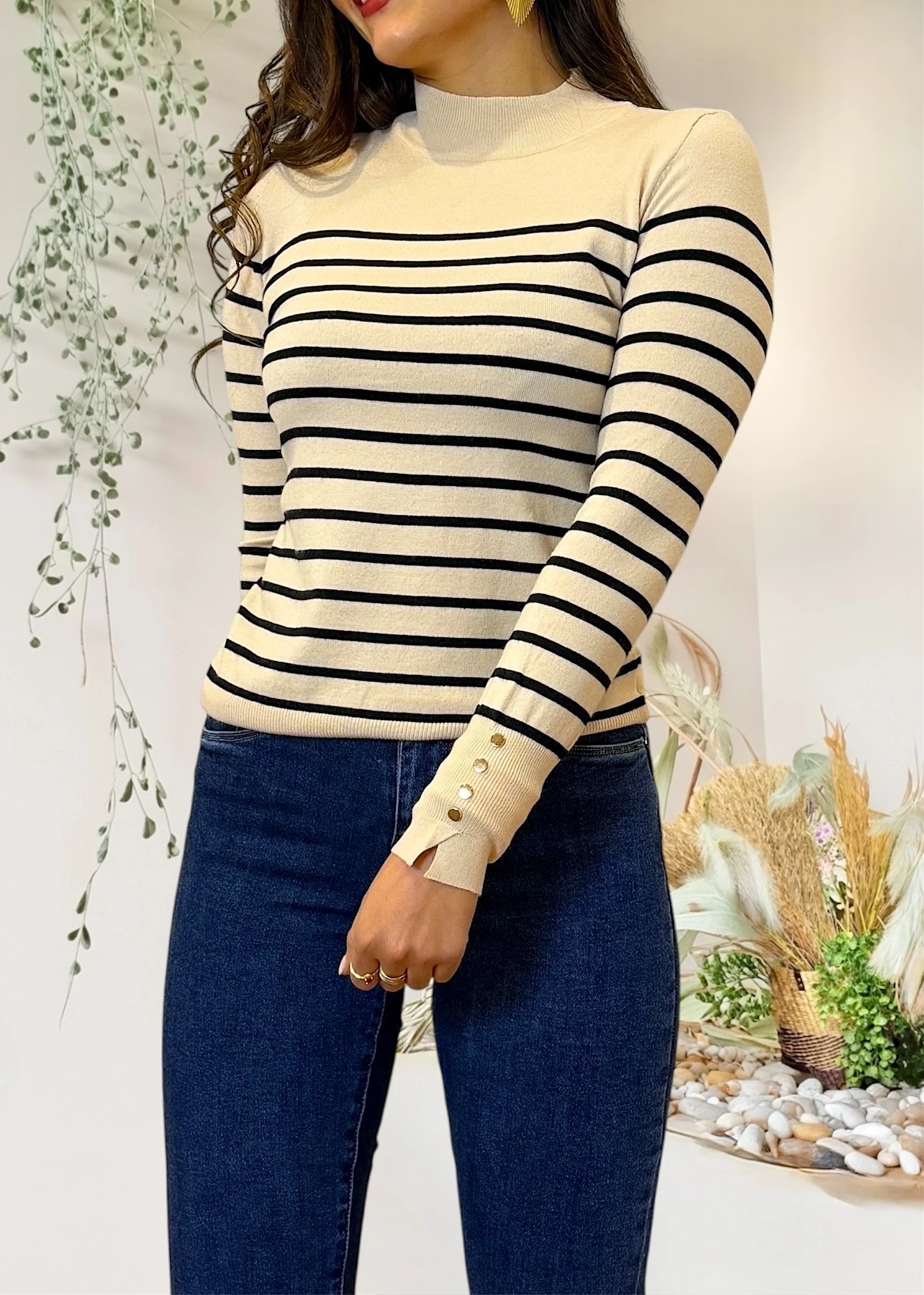 Jersey beige de punto suave con rayas negras, cuello Perkins y puños decorados con botones. Corte cómodo y tejido suave con buena elasticidad.