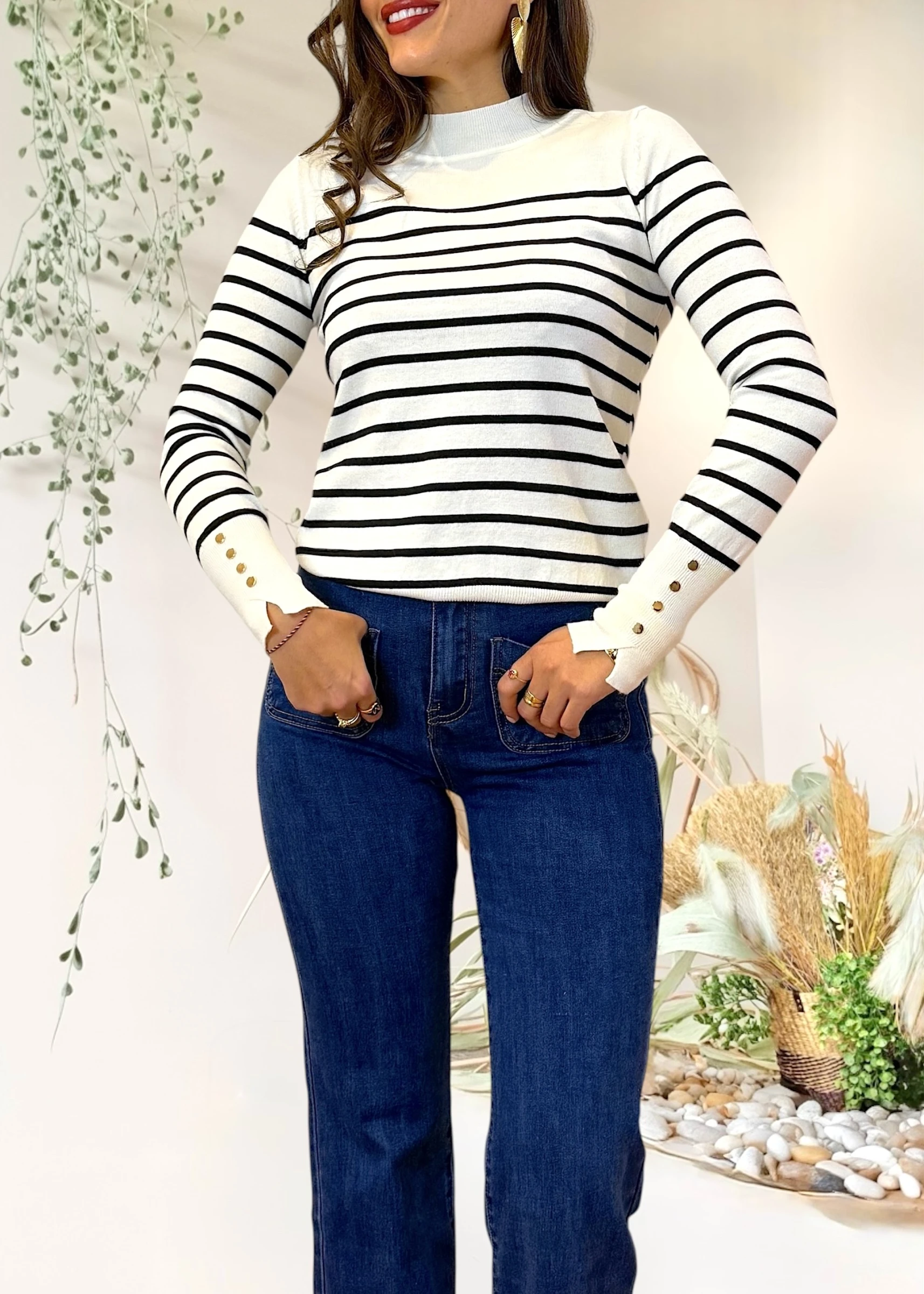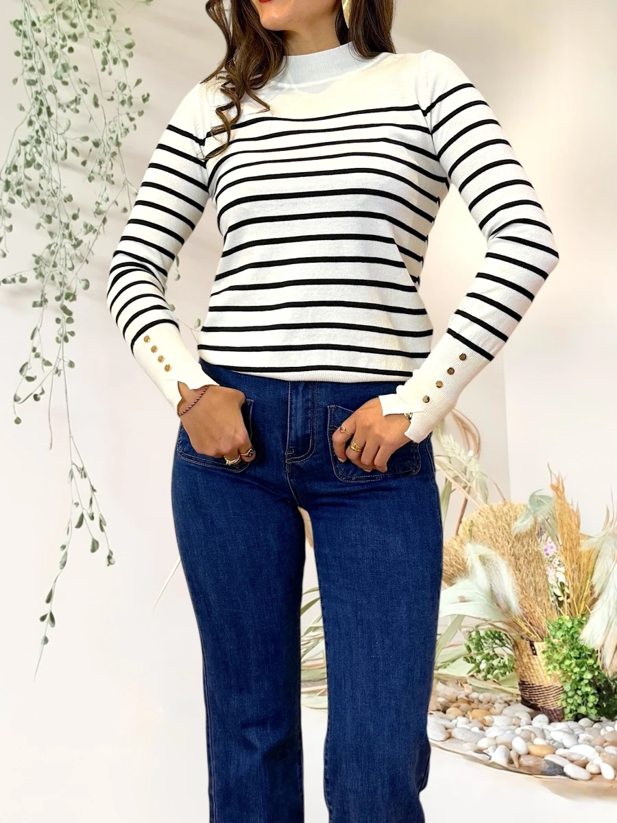 Jersey blanco de punto fino con rayas negras, cuello Perkins y botones en los puños. Tejido suave, elástico y cómodo para uso diario.