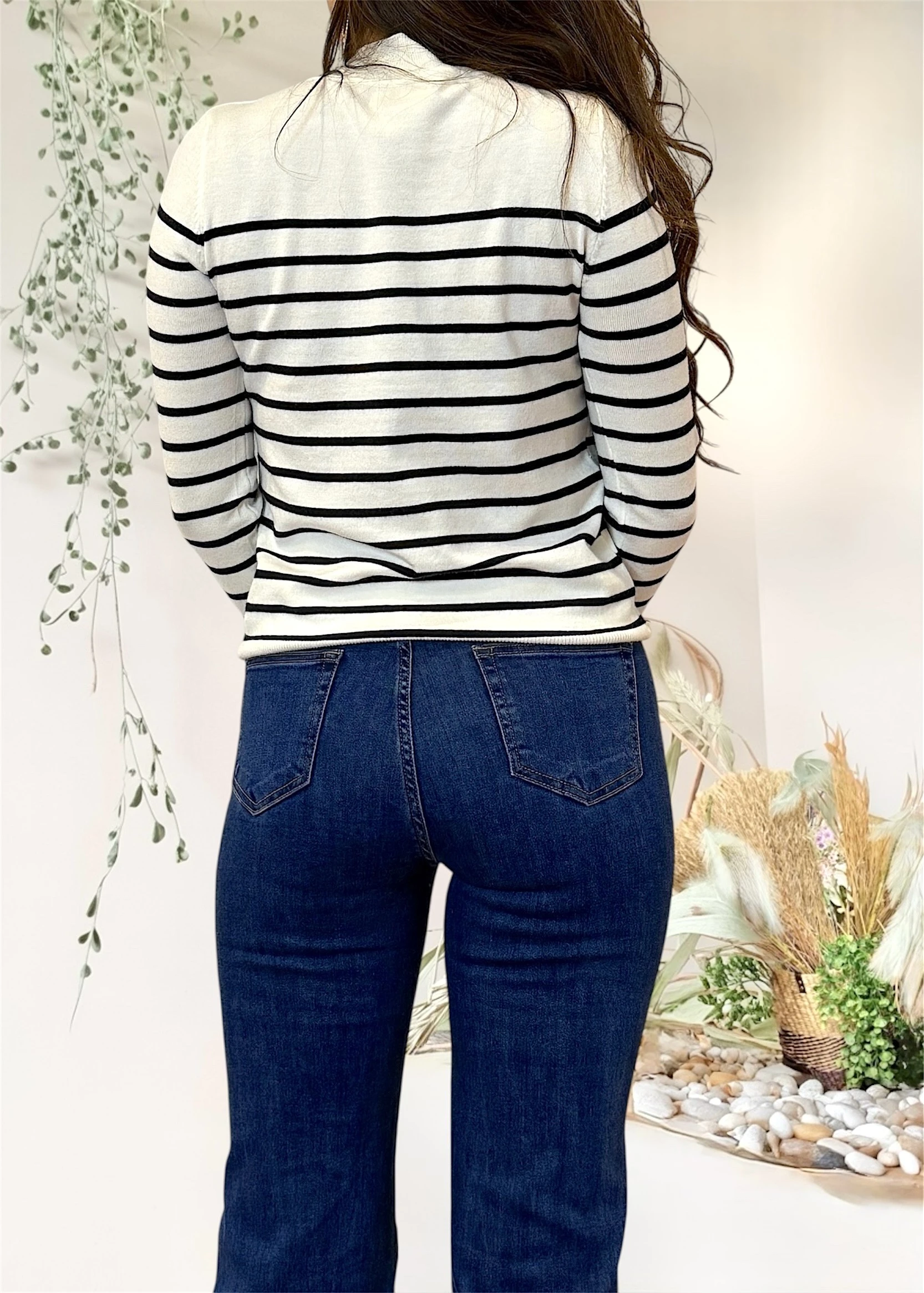 Jersey de punto suave en color blanco con rayas horizontales negras, diseñado para un ajuste cómodo y estructurado.