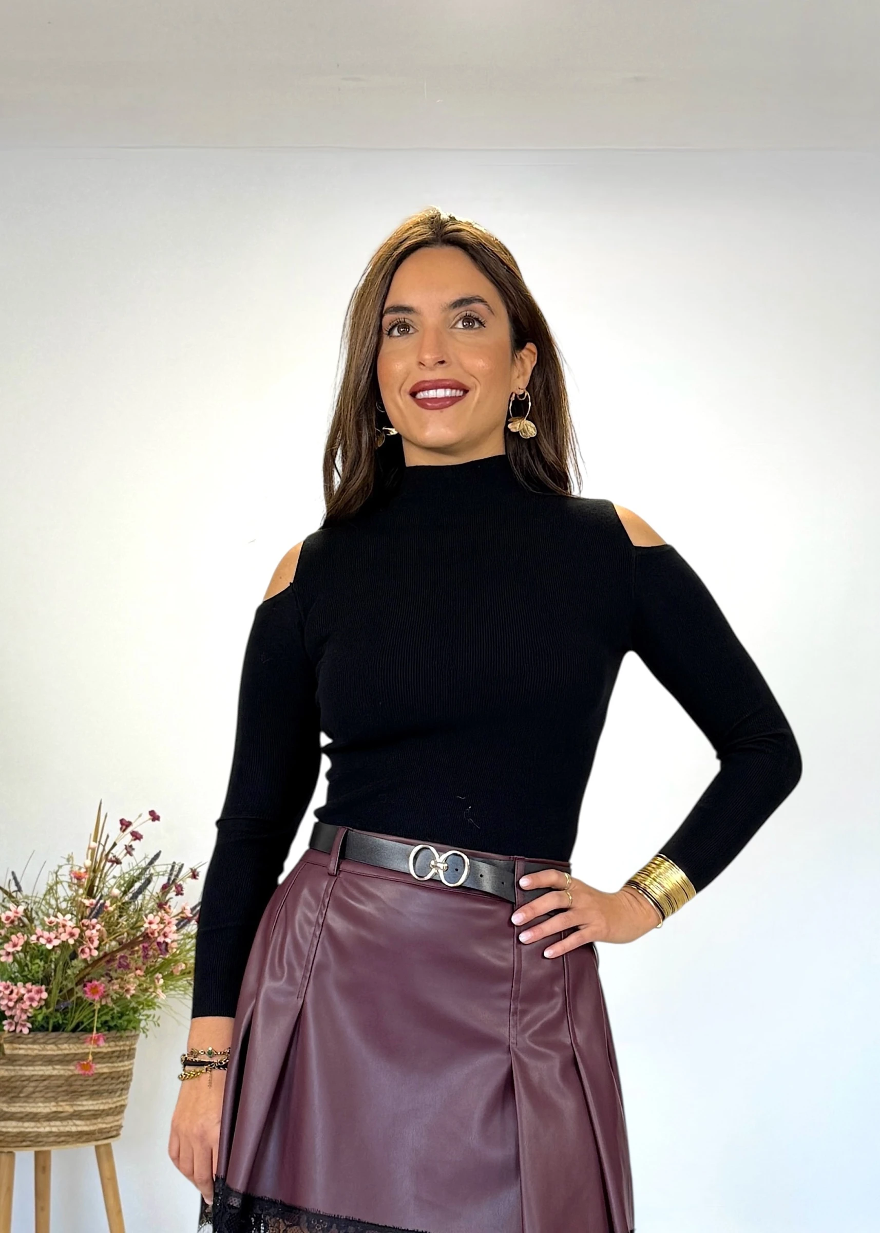 Jersey negro con hombros al aire y cuello perkins. Un toque moderno y femenino para realzar tus looks