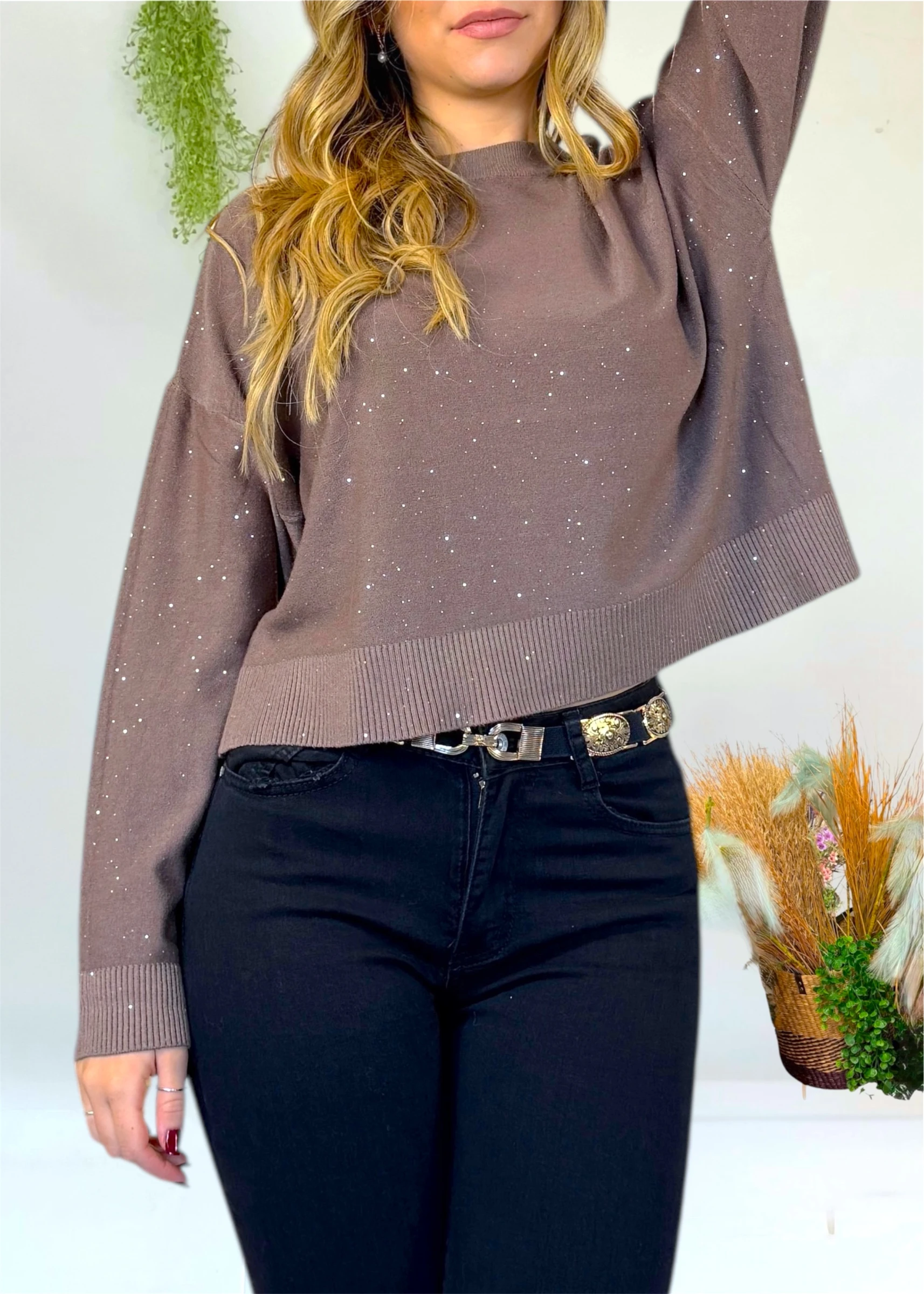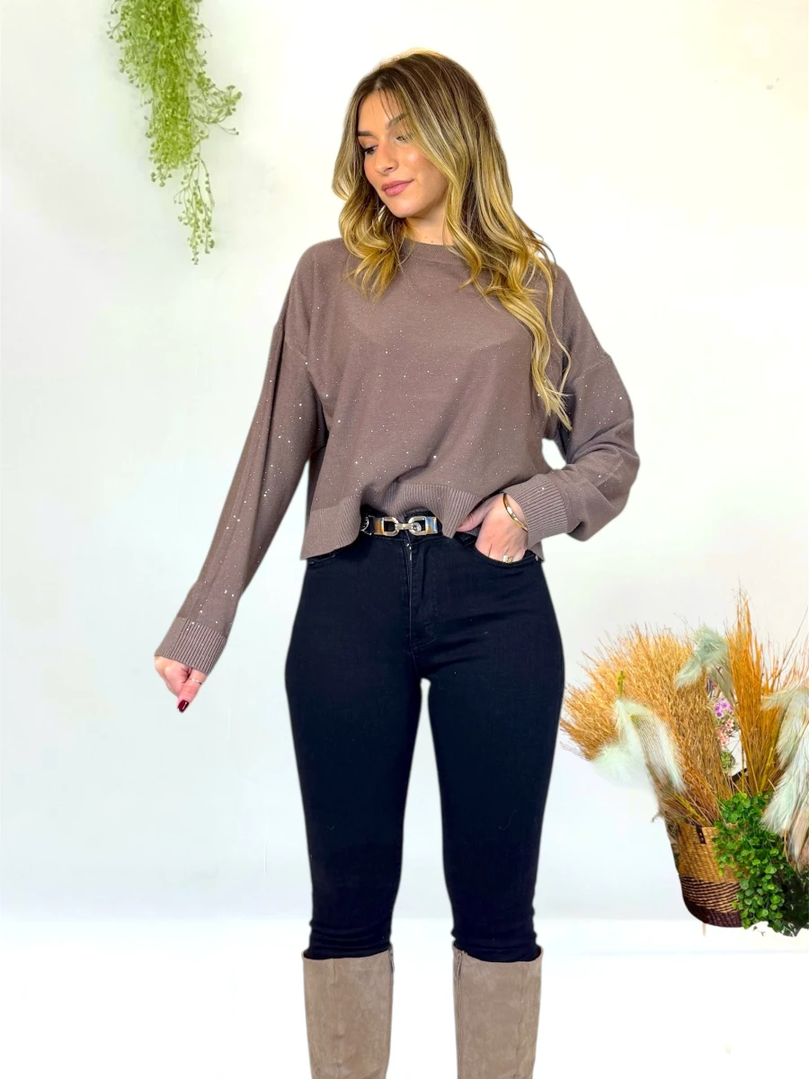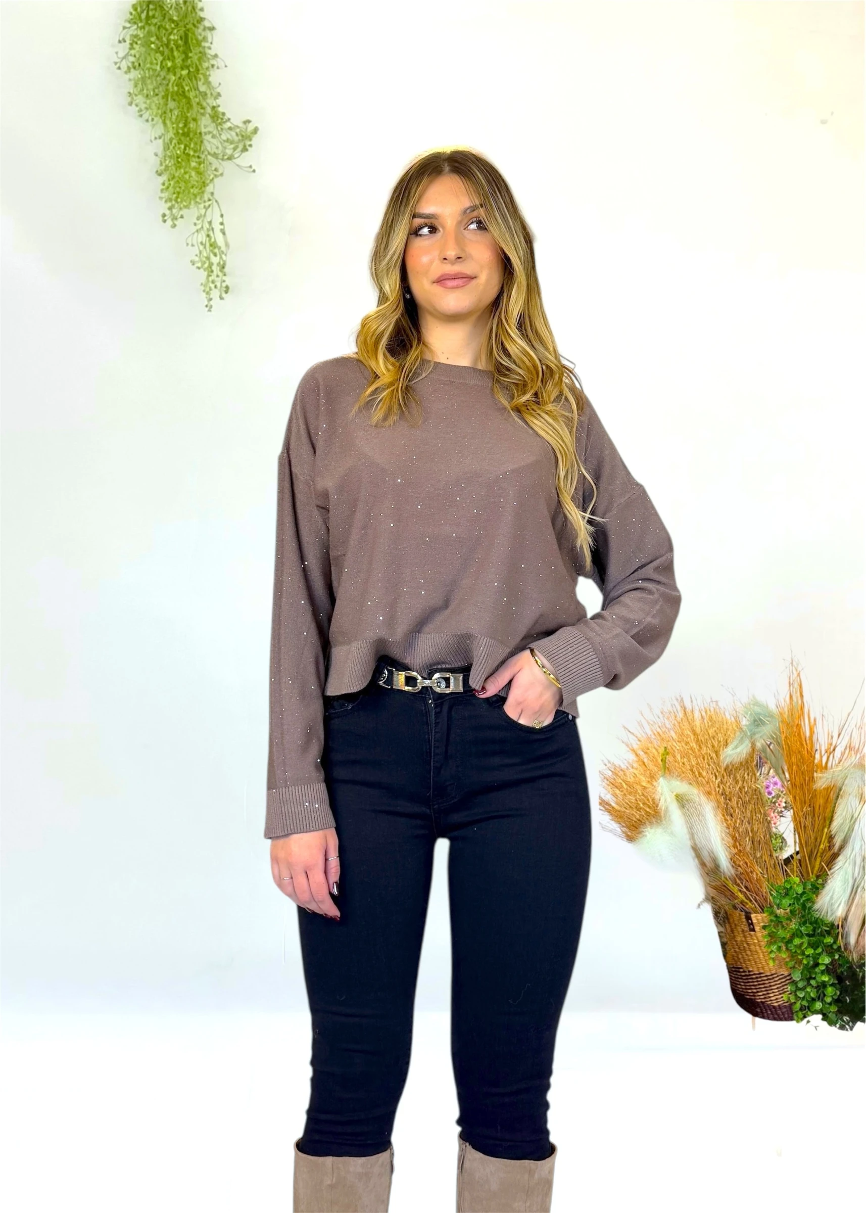 Jersey oversize en punto suave, con pequeños detalles de brillo. Cómodo y chic, ideal para dar un toque especial a tus looks diarios.
