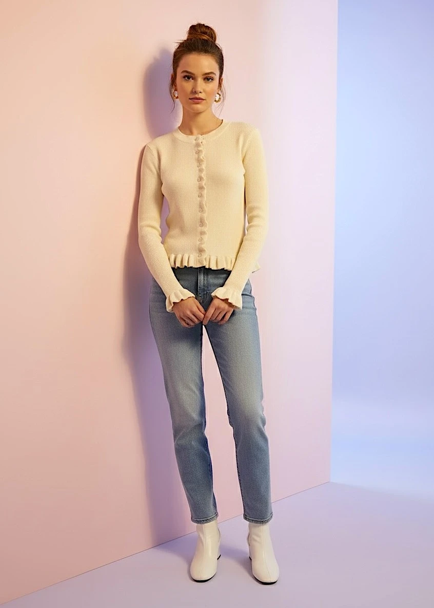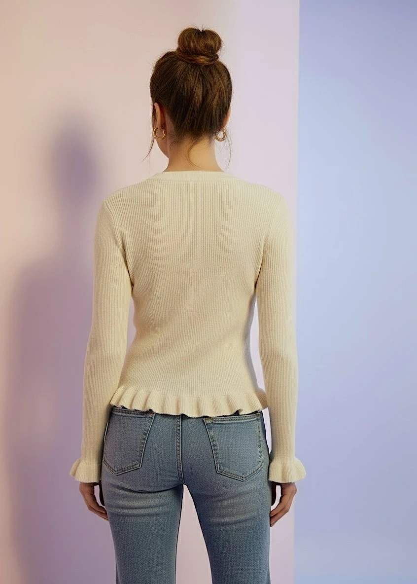Jersey beige con volantes y cierre ondulado. Suave y femenino, perfecto para elevar tus básicos con un toque especial.