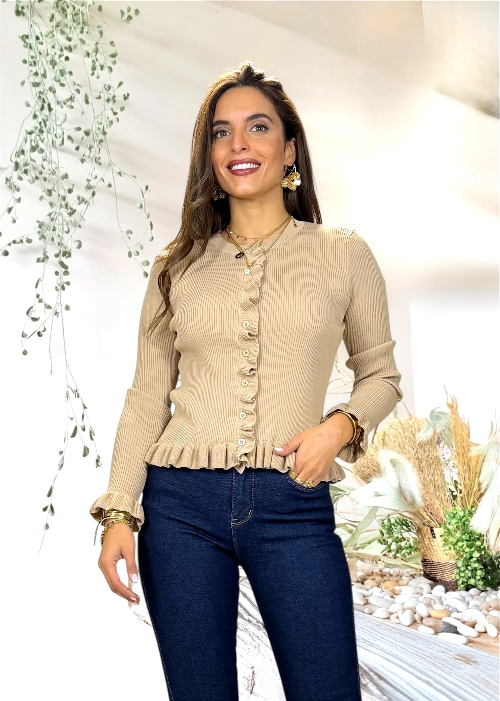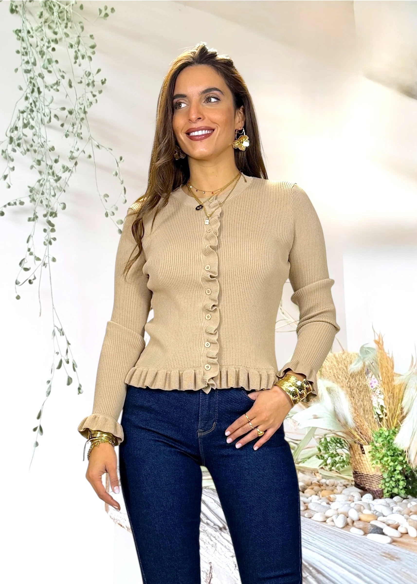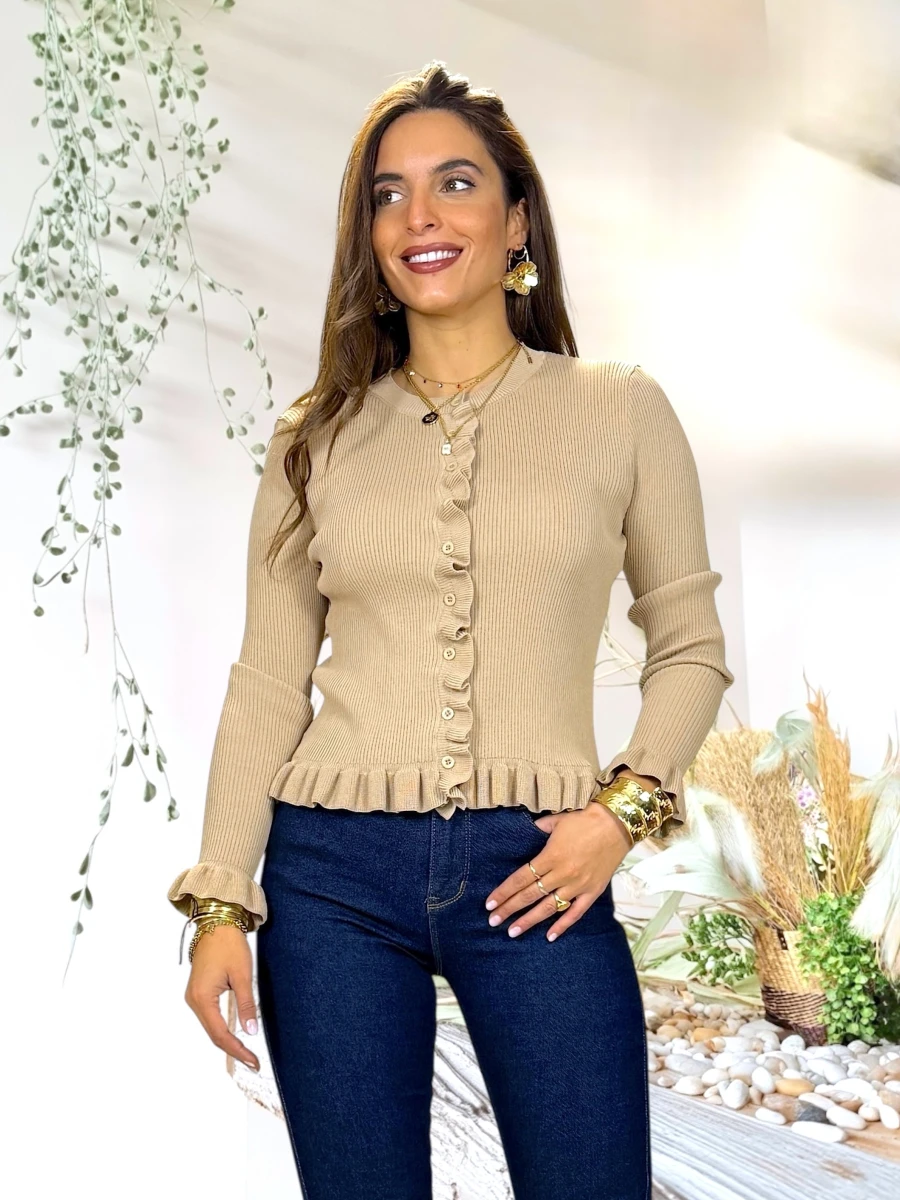 Jersey color camel con volantes y cierre ondulado. Suave y femenino, perfecto para elevar tus básicos con un toque especial.
