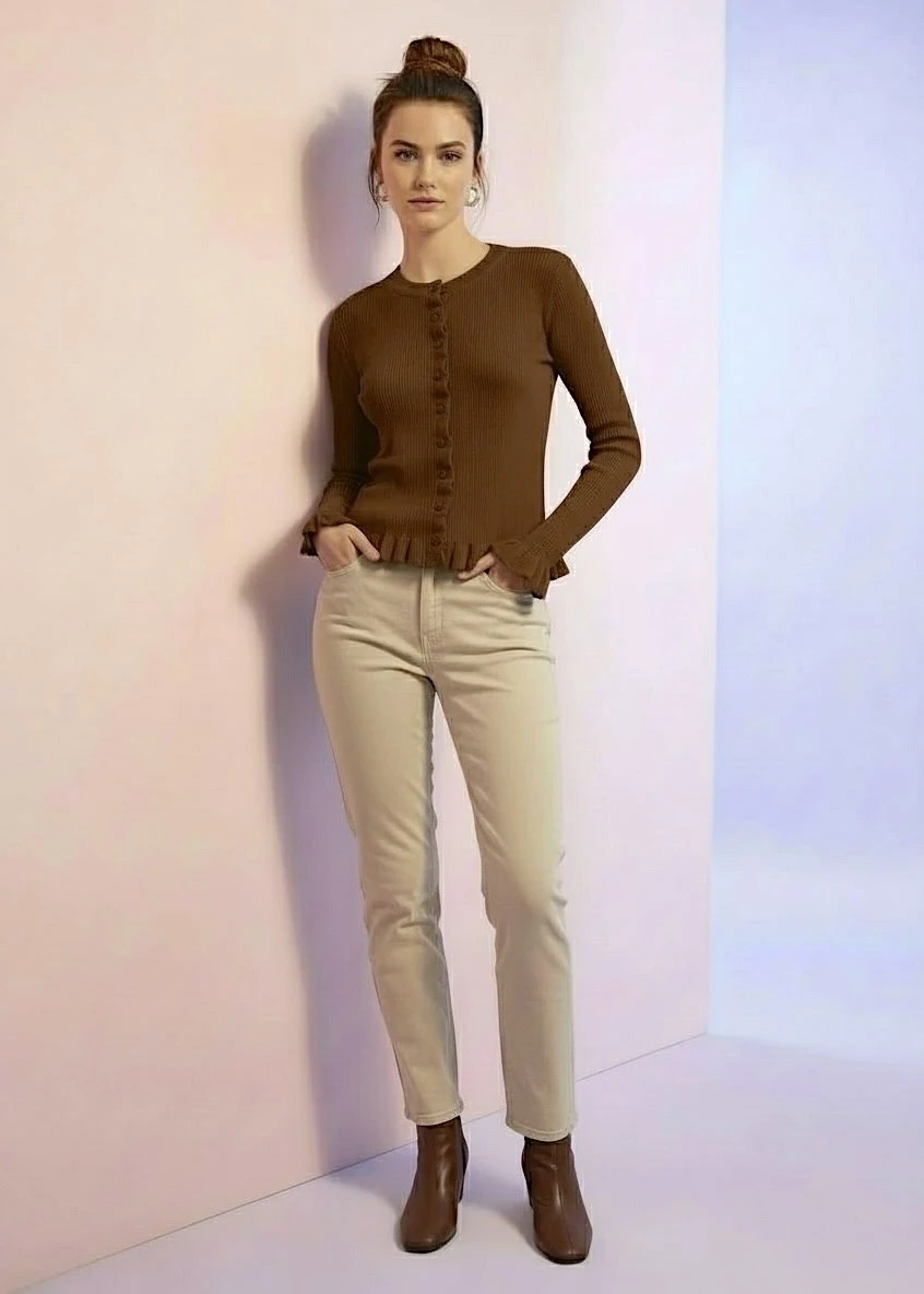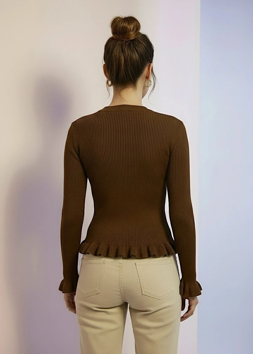 Jersey marron chocolate con volantes y cierre ondulado. Suave y femenino, perfecto para elevar tus básicos con un toque especial.