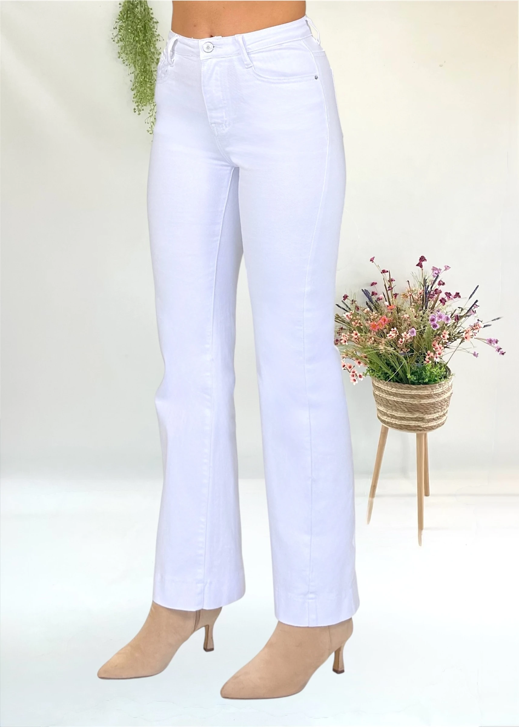 Pantalón blanco de corte recto y tejido elástico que estiliza la silueta. Un básico luminoso, cómodo y versátil para tu día a dia