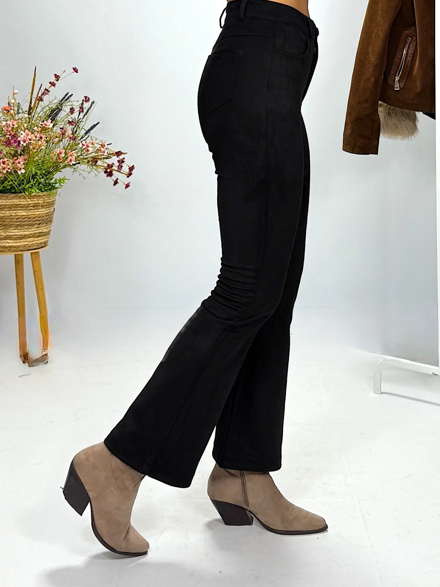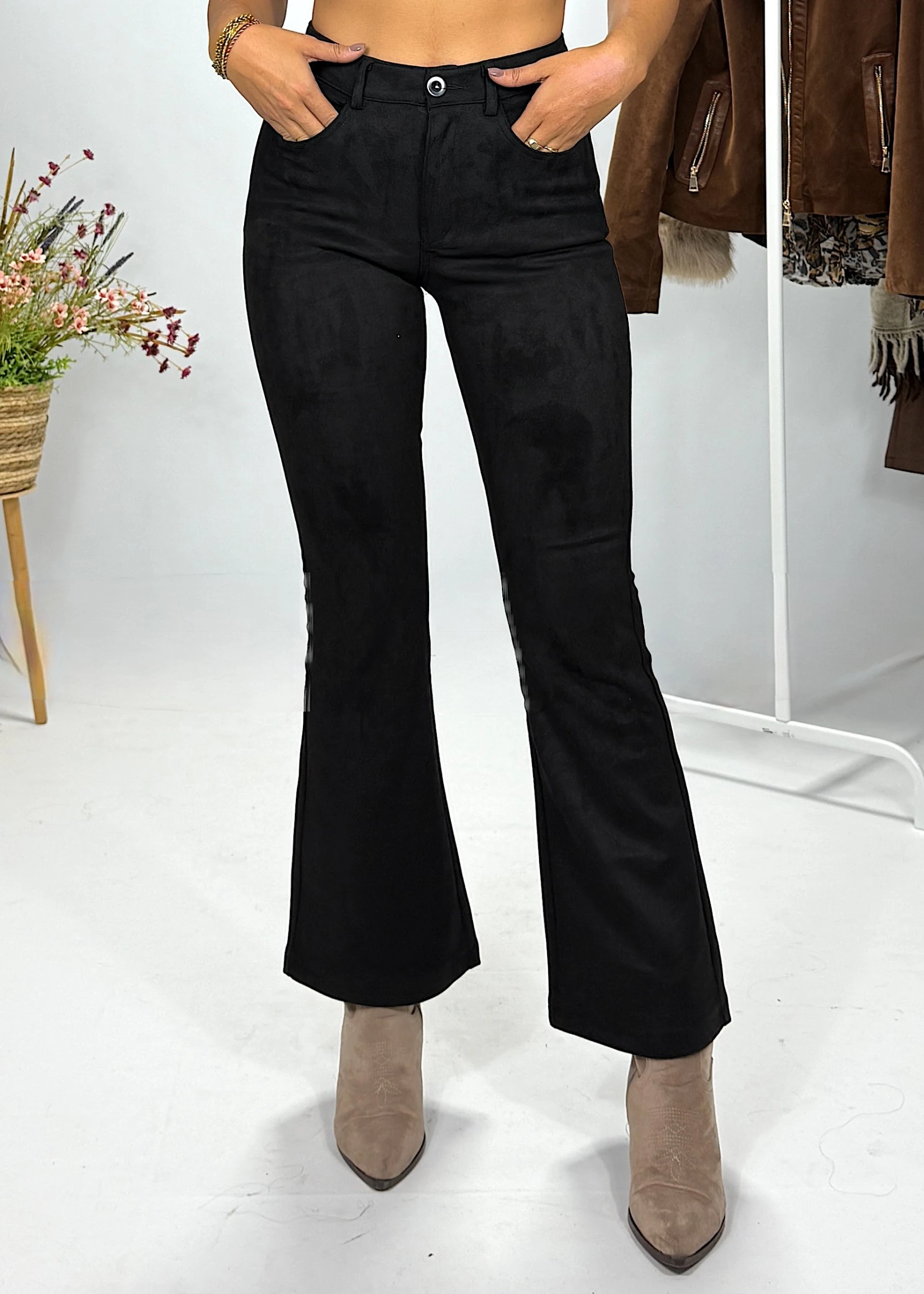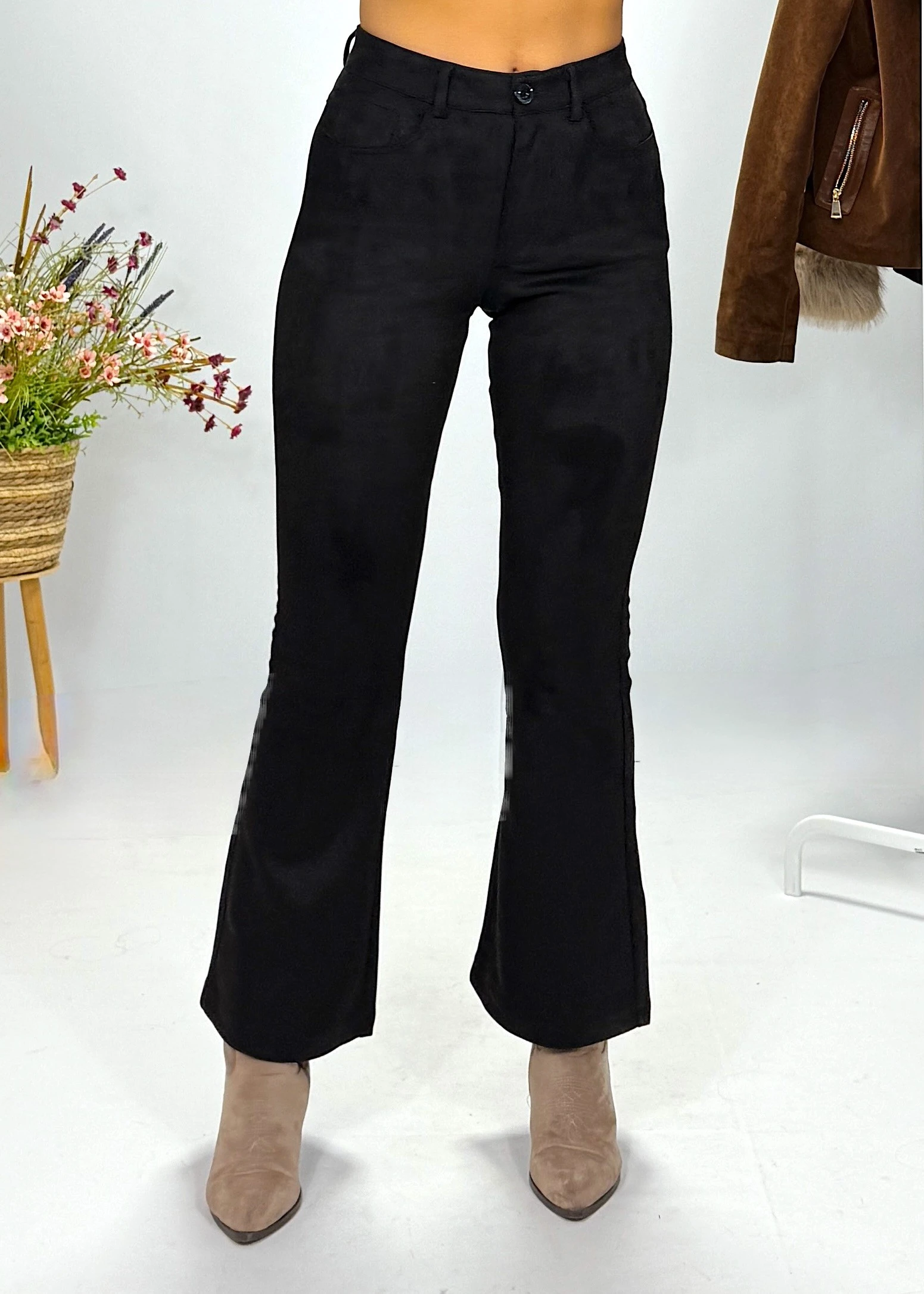 Pantalón de antelina en color negro con final de camal acampanado, ideal para looks de entretiempo o de temporada.