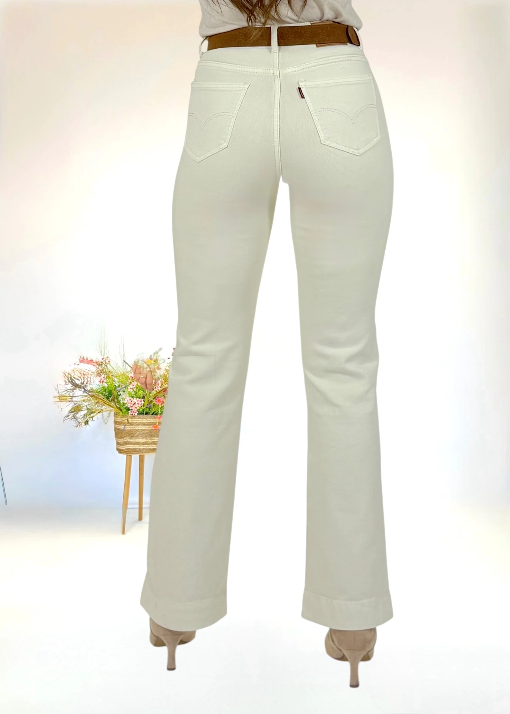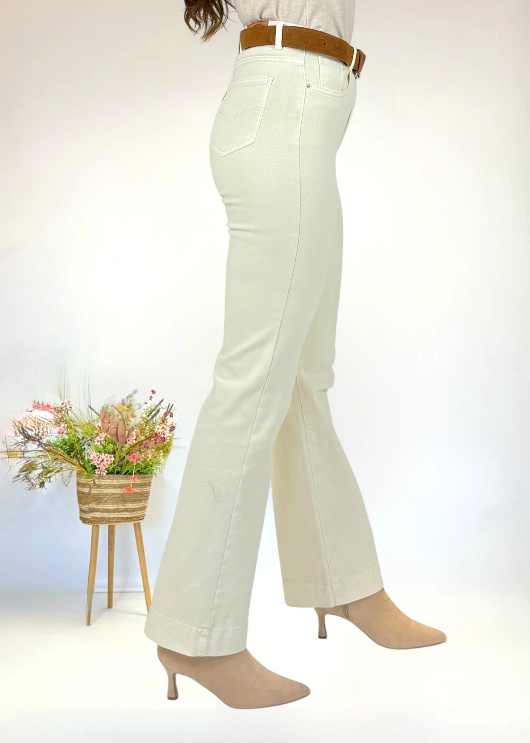 Pantalón en color beige con corte ligeramente acampanado. Un básico ideal para looks casuales o más arreglados según lo combines. Tiro medio-alto, favorece la figura sin perder comodidad.