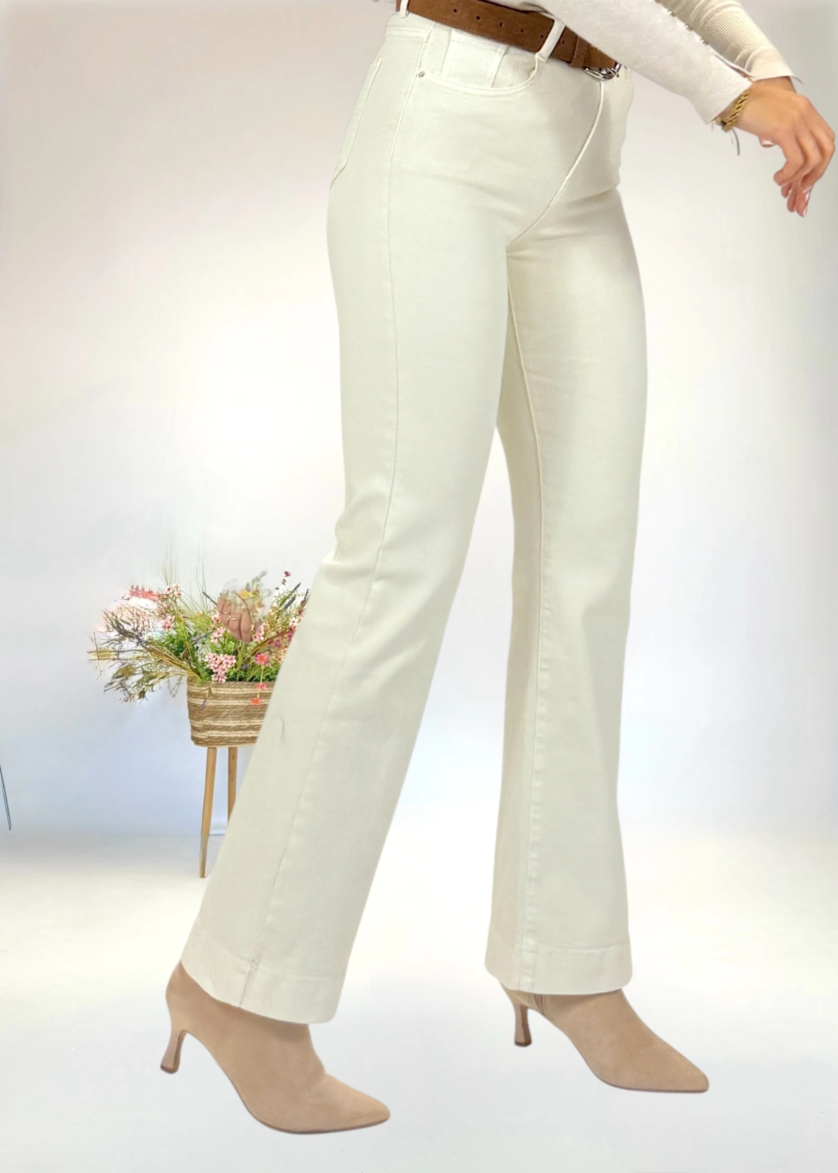 Pantalón beige ligeramente acampanado, cómodo y versátil. Disponible en tallas 36 a 42. La modelo mide 1,71 m y lleva la talla 36.