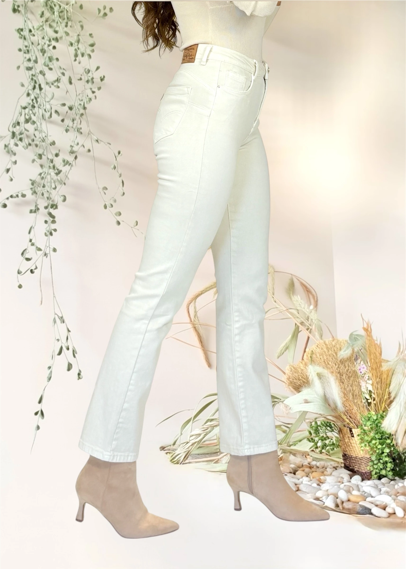 Vaquero blanco roto de tiro medio y pierna recta. Favorece la figura y combina con todo, un básico atemporal con ajuste cómodo.