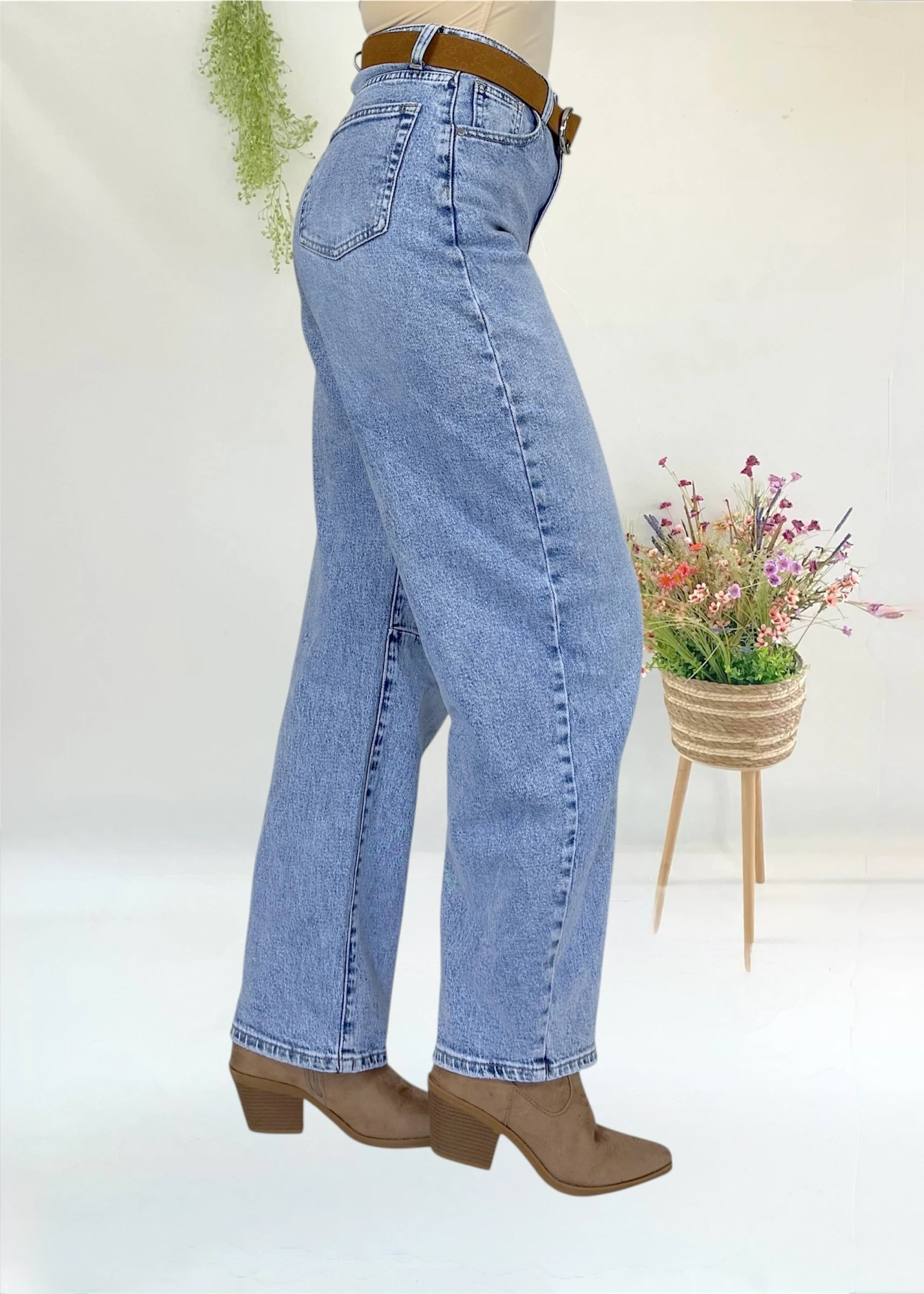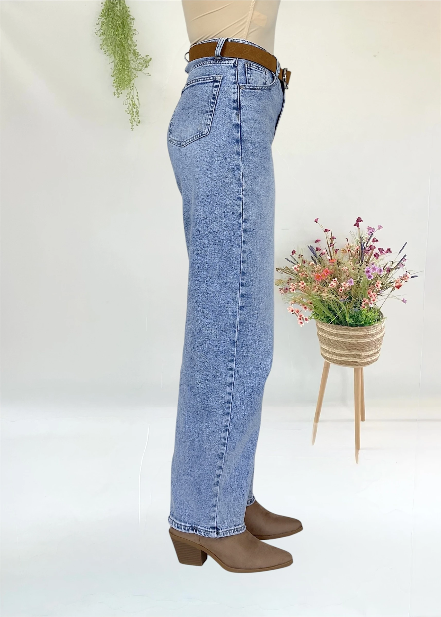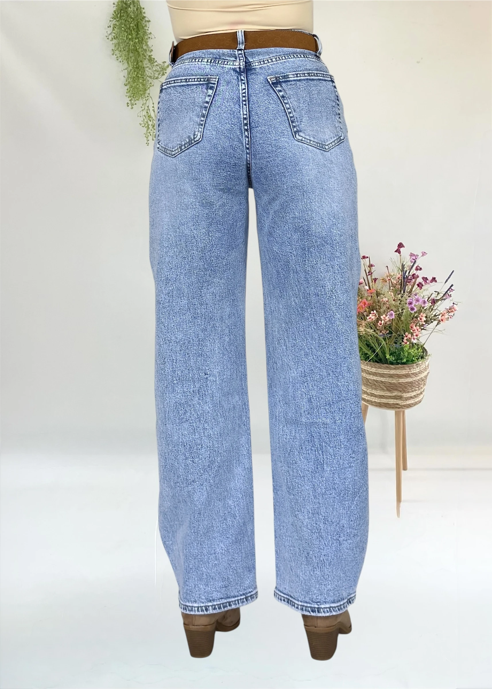 Pantalón vaquero de tiro alto, ligeramente elástico y lavado claro. Ideal para un look cómodo y estilizado.