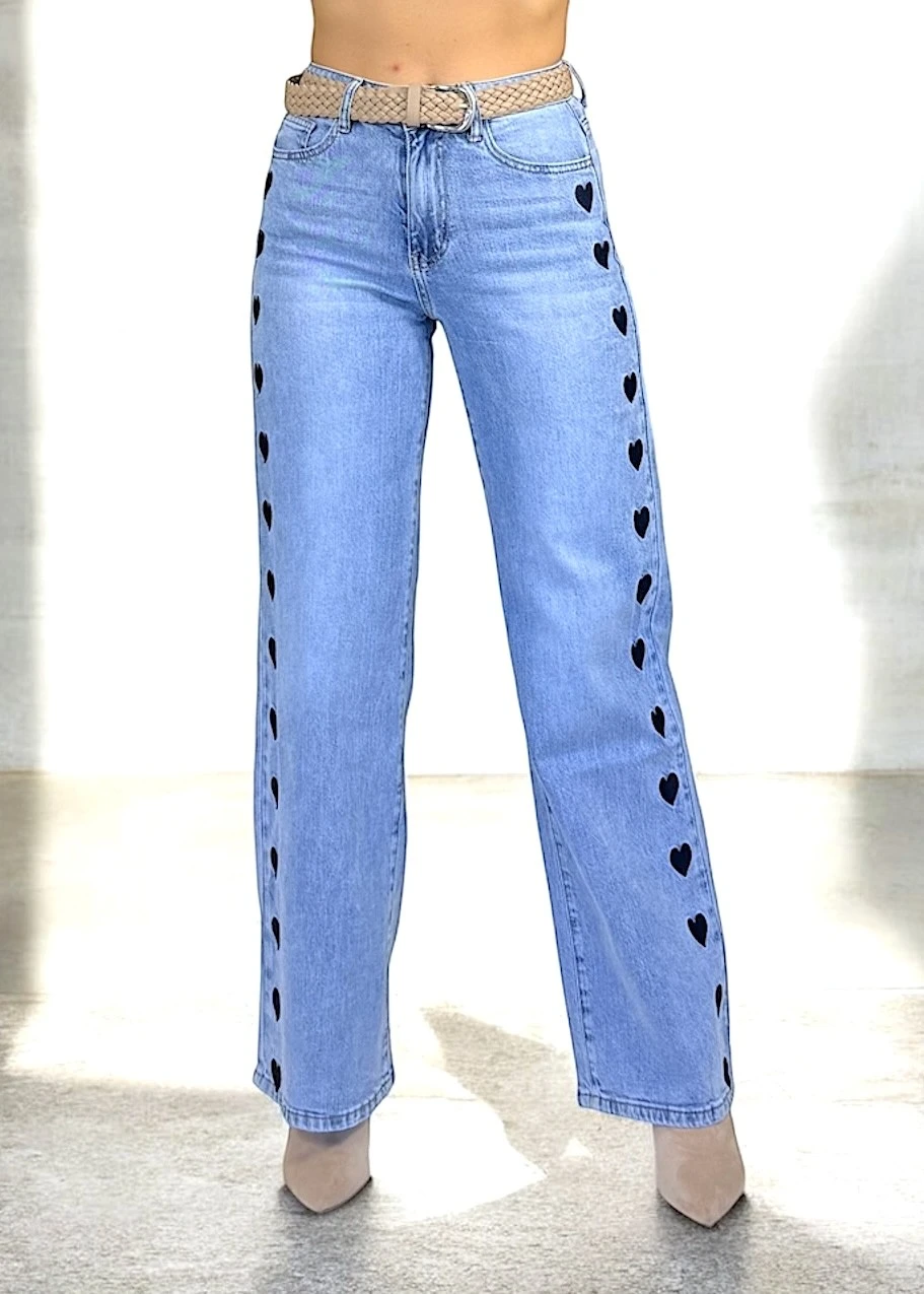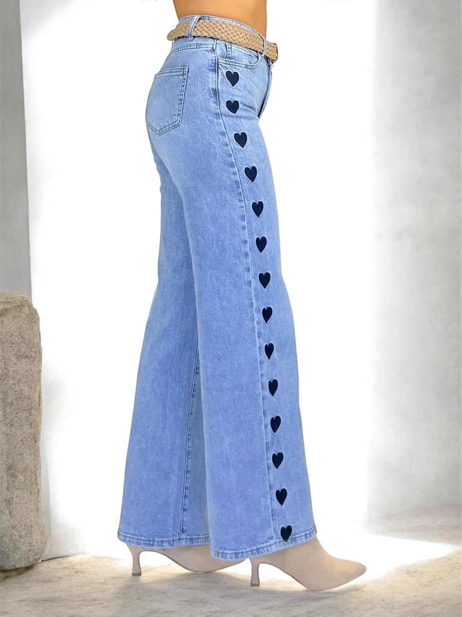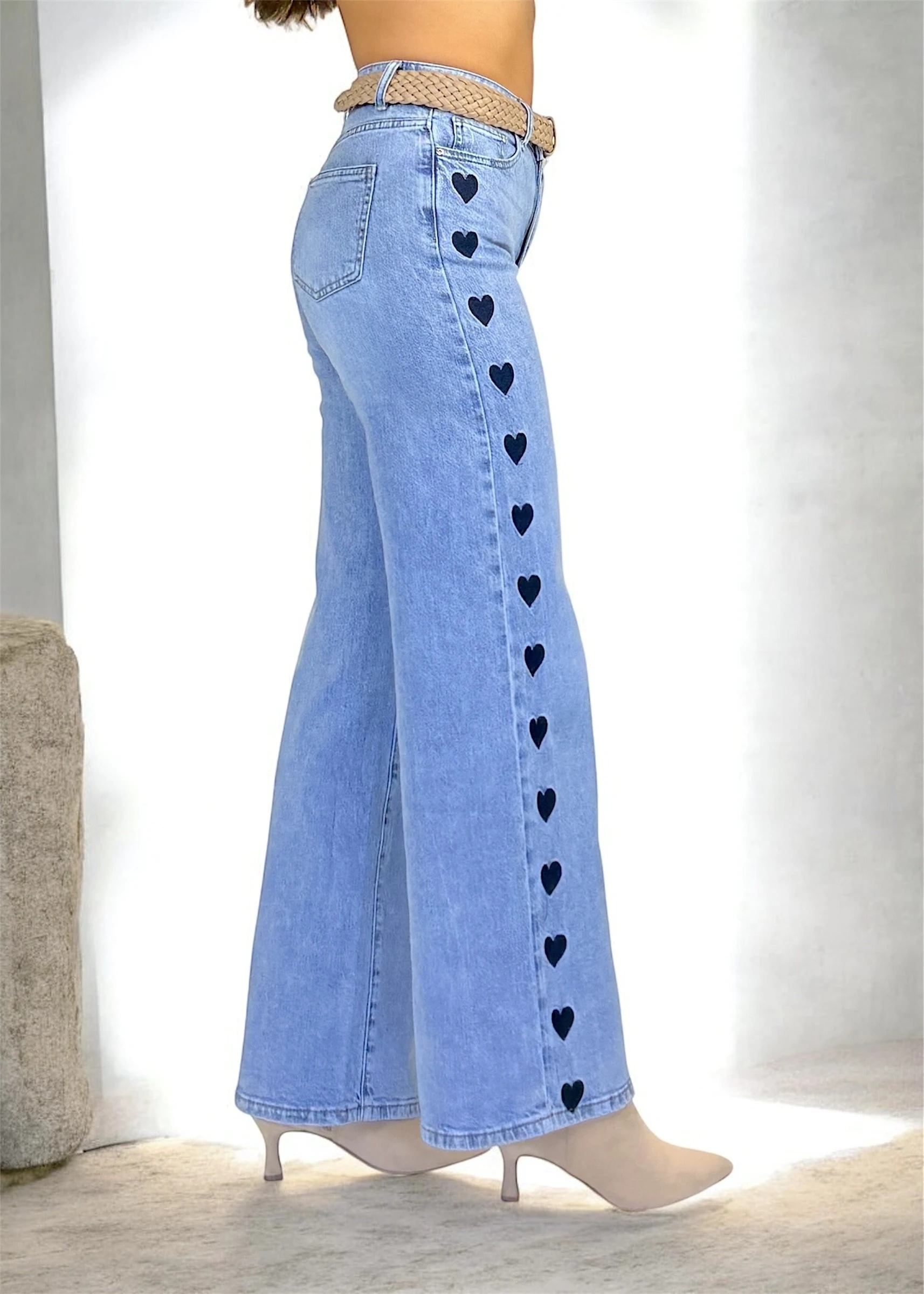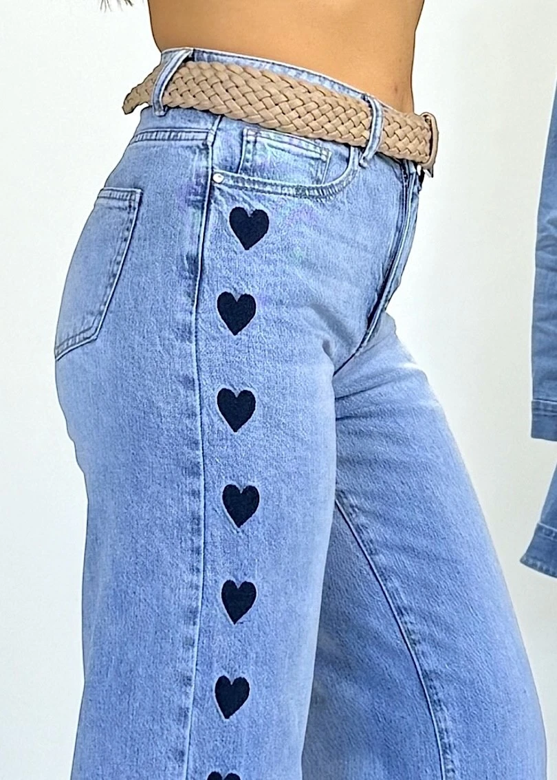 Pantalón vaquero de tiro alto, con corazones bordados en los laterales. Ligeramente elástico y lavado claro.