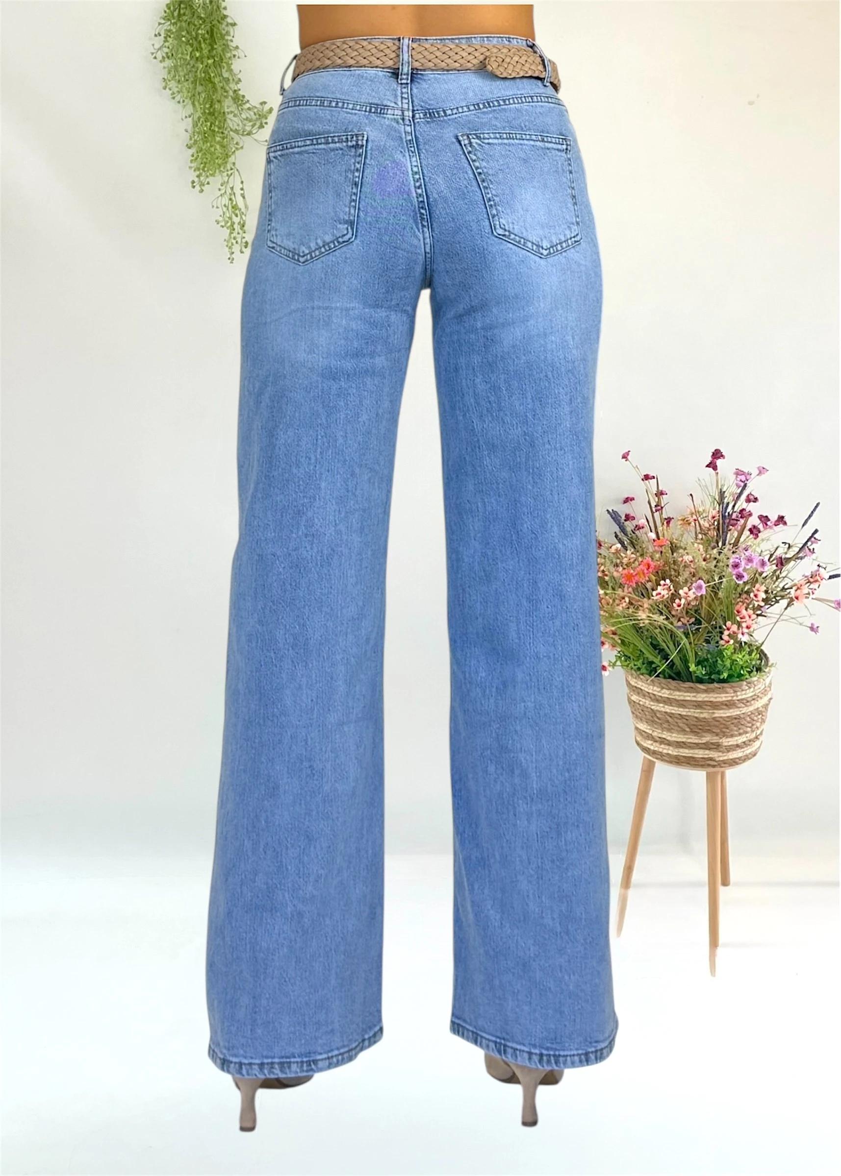 Pantalón vaquero de tiro alto con corte recto y pierna semi ancha. Confeccionado en tejido denim suave y ligeramente elástico, perfecto para un ajuste cómodo.
