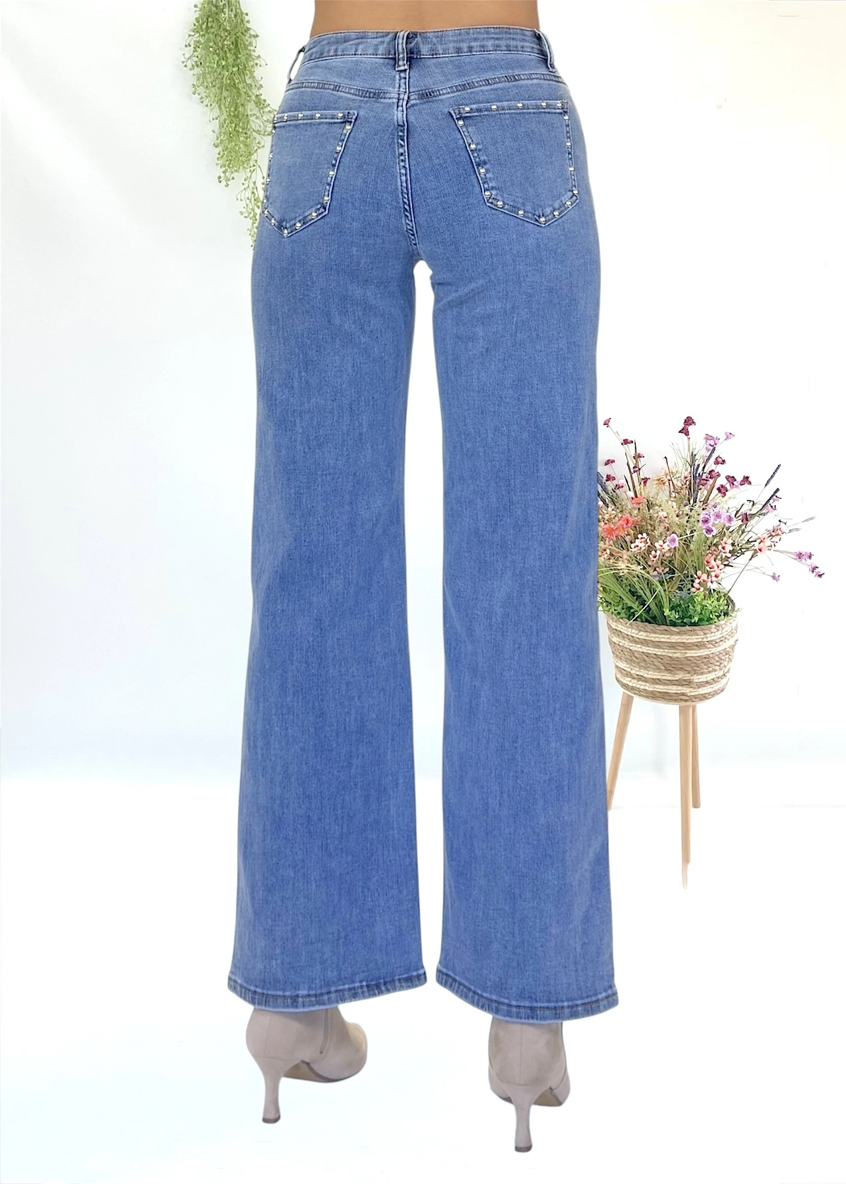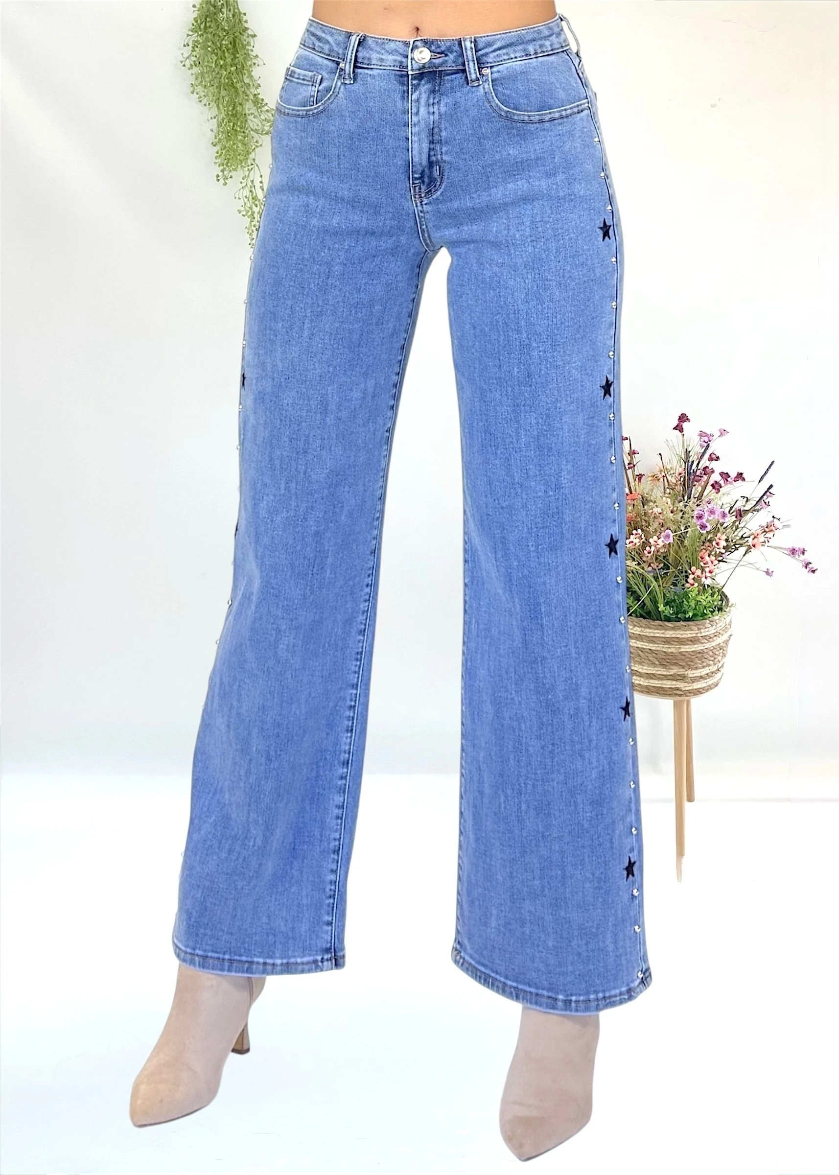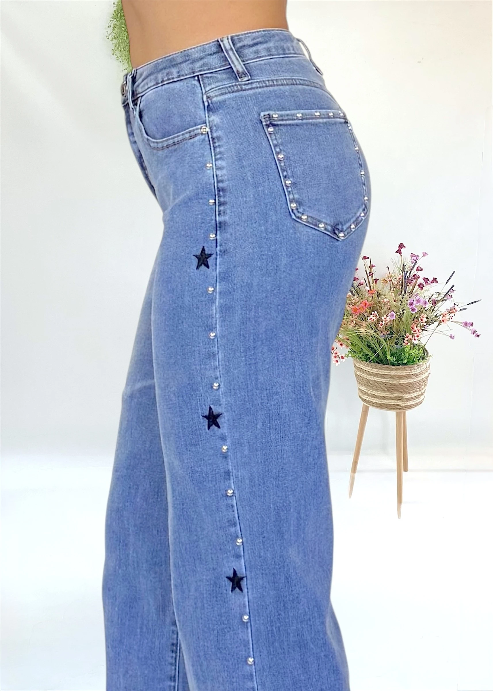 Pantalón vaquero de tiro medio, con estrelas bordadas en los laterales y decorado con tachas metálicas