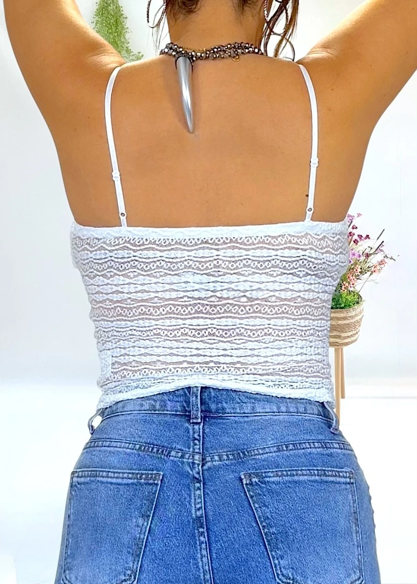 Top blanco de encaje elástico con tirantes regulables y detalle metálico en el escote. Ajusta y realza con un aire actual que favorece a todas