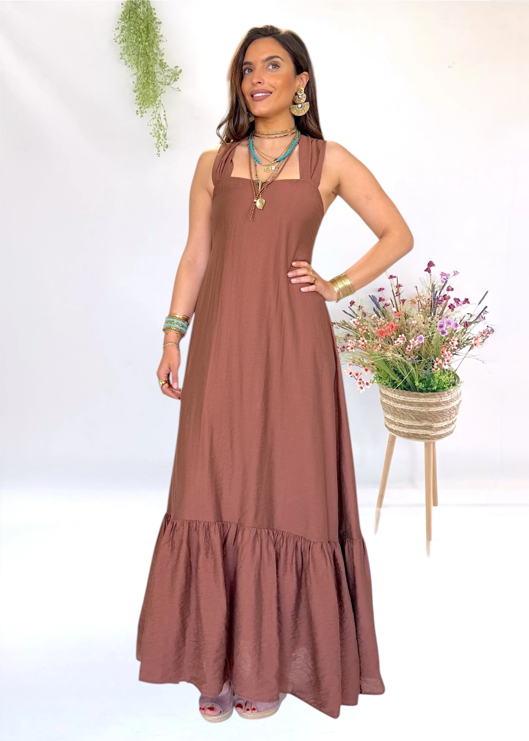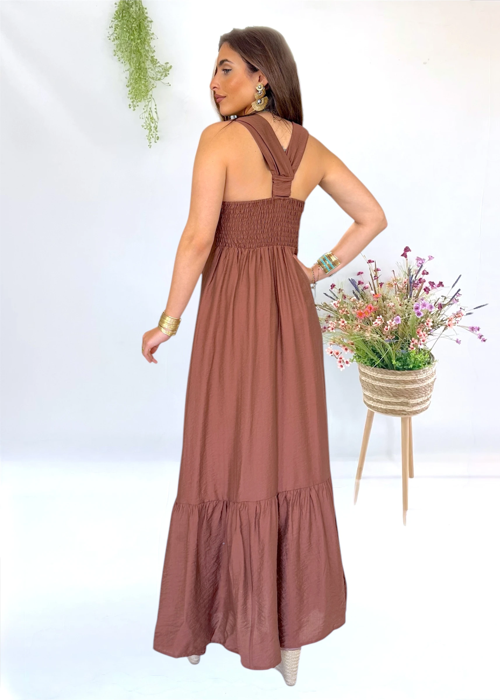 Vestido largo marrón con espalda especial y tirantes anchos. Fluido, elegante y muy favorecedor, con esencia natural y estilo boho 🤎✨