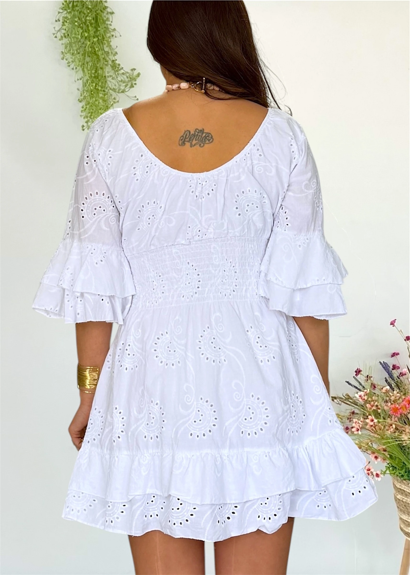 Vestido blanco bordado con volantes y escote en pico 🤍 un básico con rollazo que siempre queda bien ✨