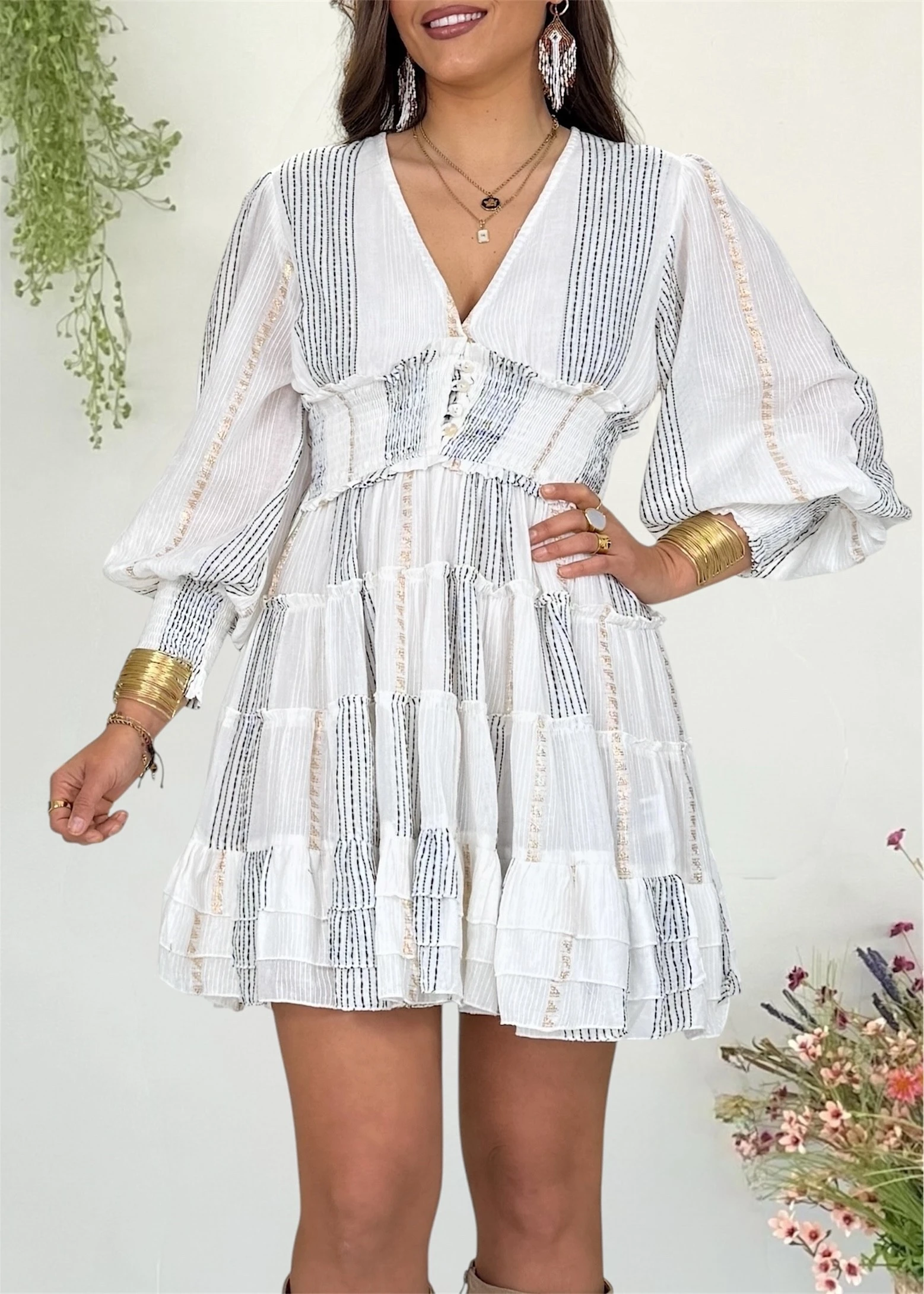 Vestido boho blanco con escote pico y cintura nido de abeja que realza la figura. Ligero, con mangas abullonadas y movimiento fluido.