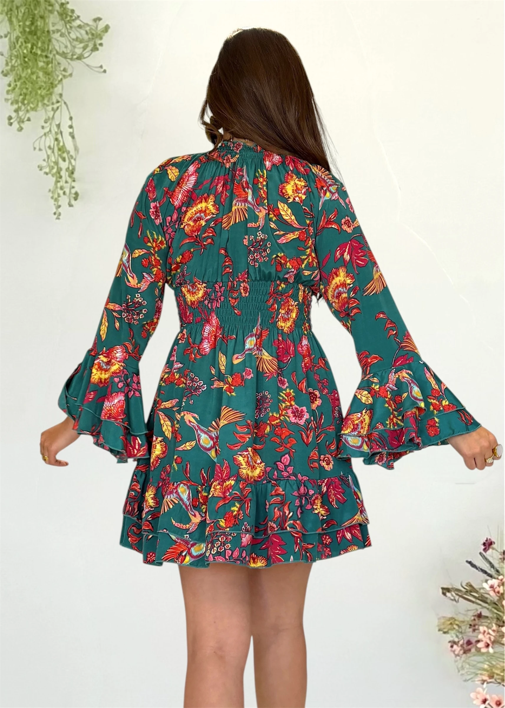 Vestido corto estampado con fondo verde esmeralda de Trilce mangas acampanadas. Fluido, femenino y con un aire exótico 🌺✨