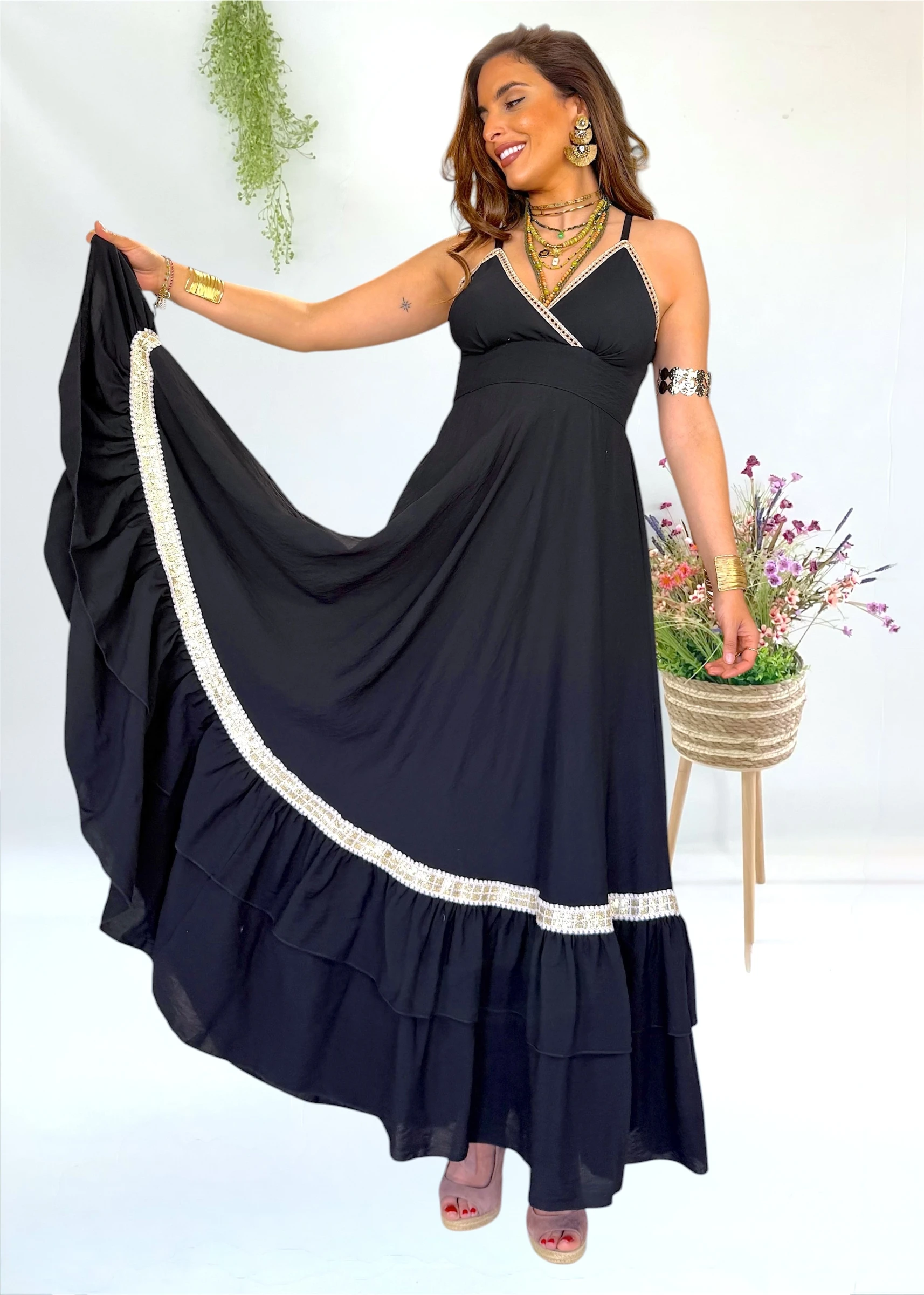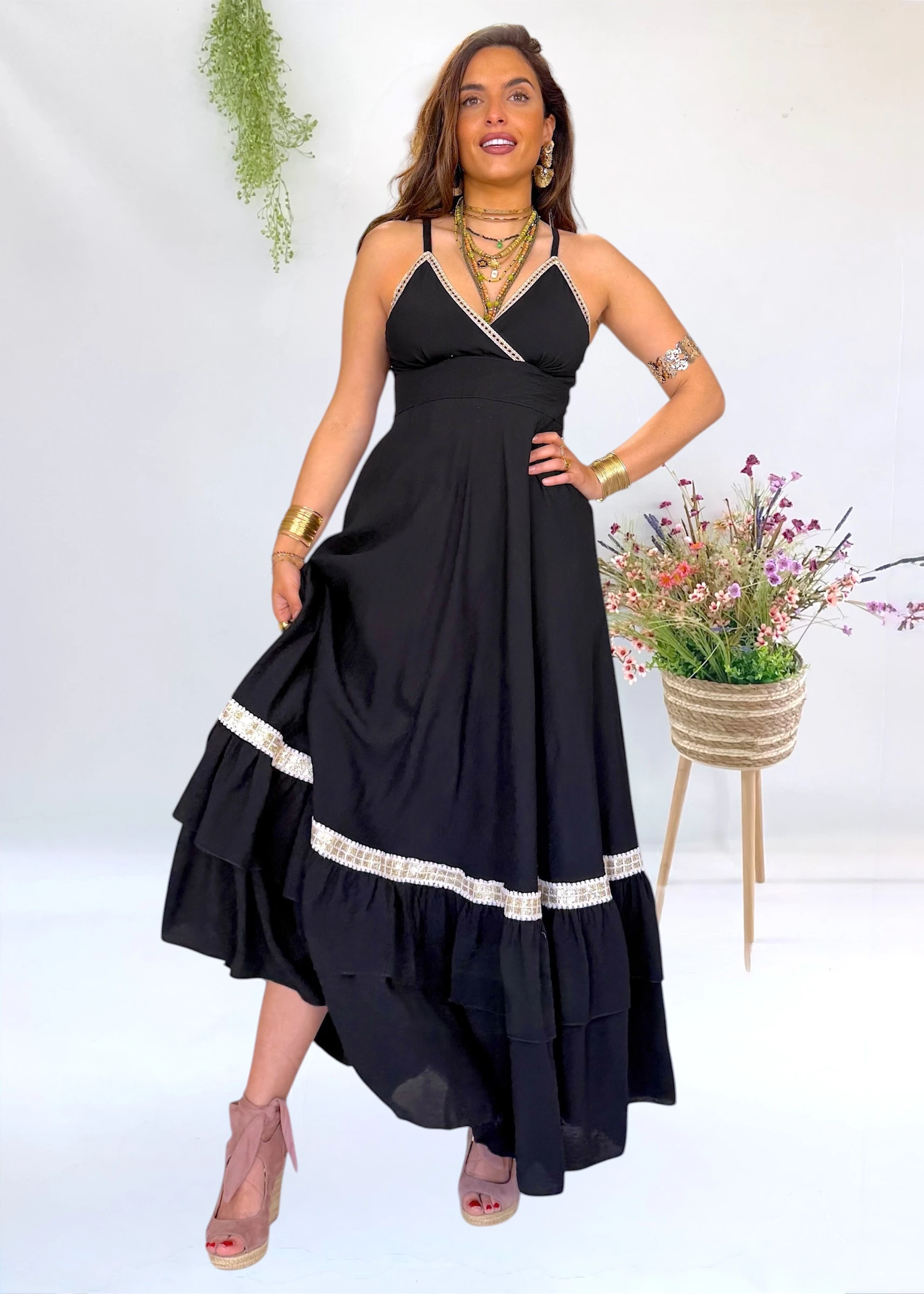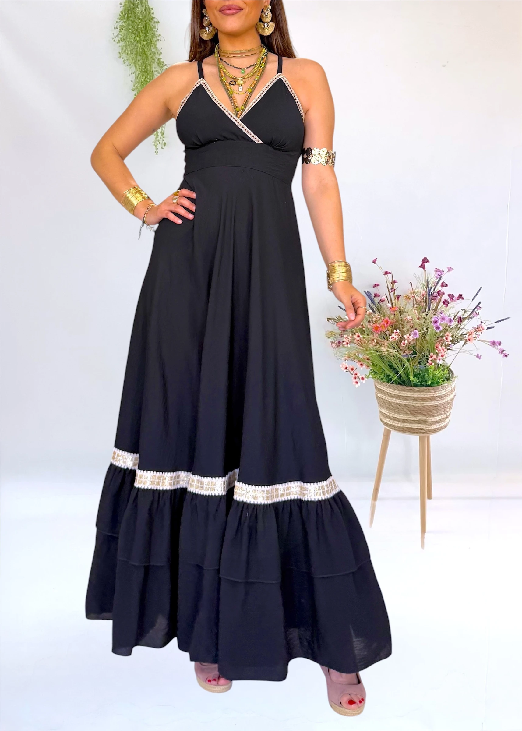 Vestido largo negro de la firma Trilce, diseño y moda española, con escote cruzado y espalda elástica. Ligero, y con un aire natural muy especial 🌿✨