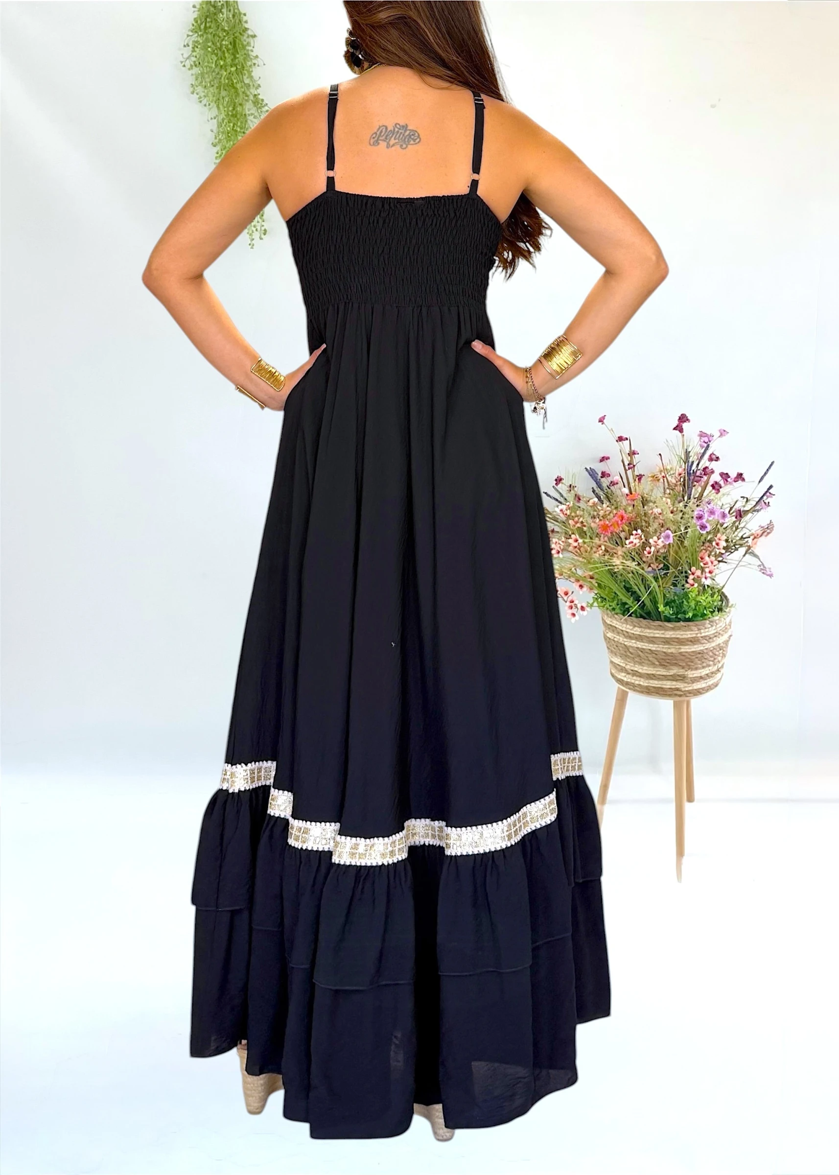 Vestido largo negro de la firma Trilce, diseño y moda española que combina frescura, elegancia y un aire natural muy favorecedor.