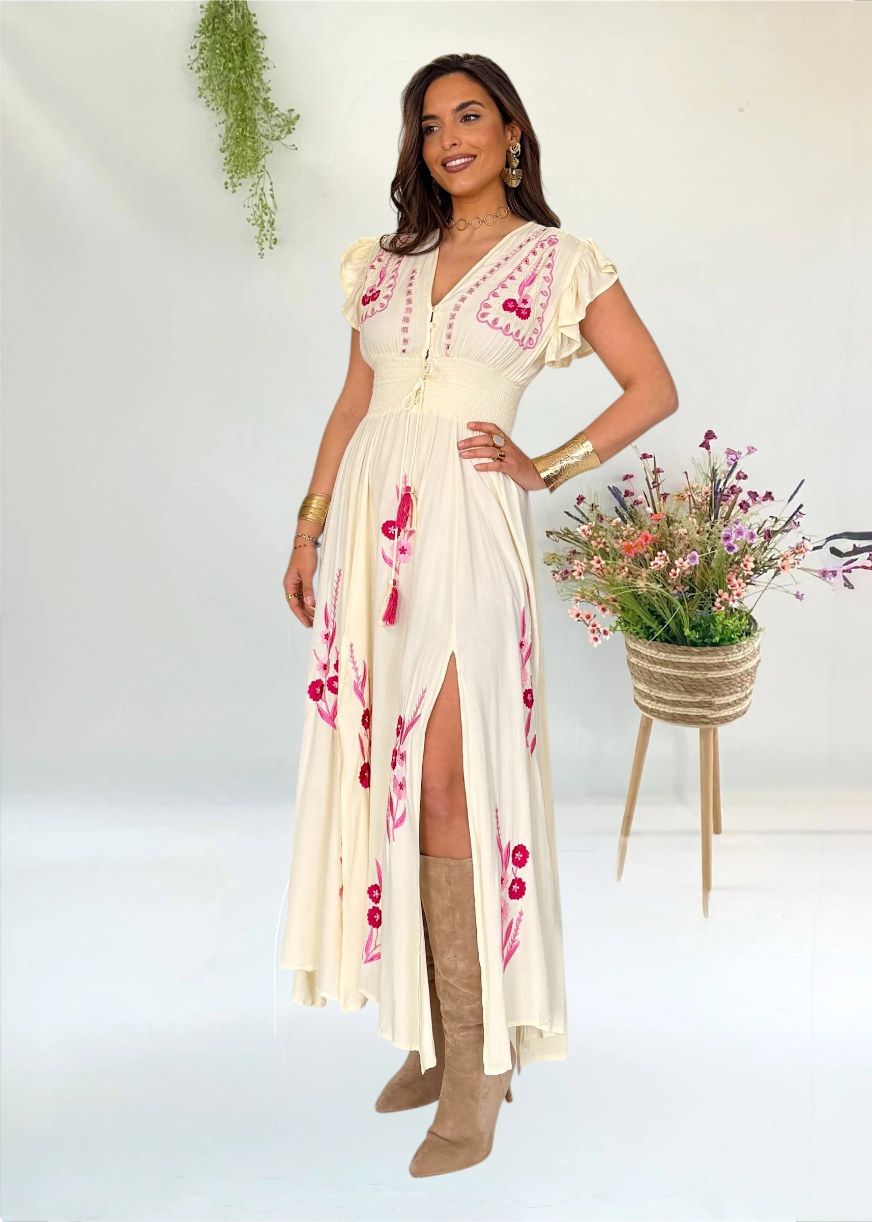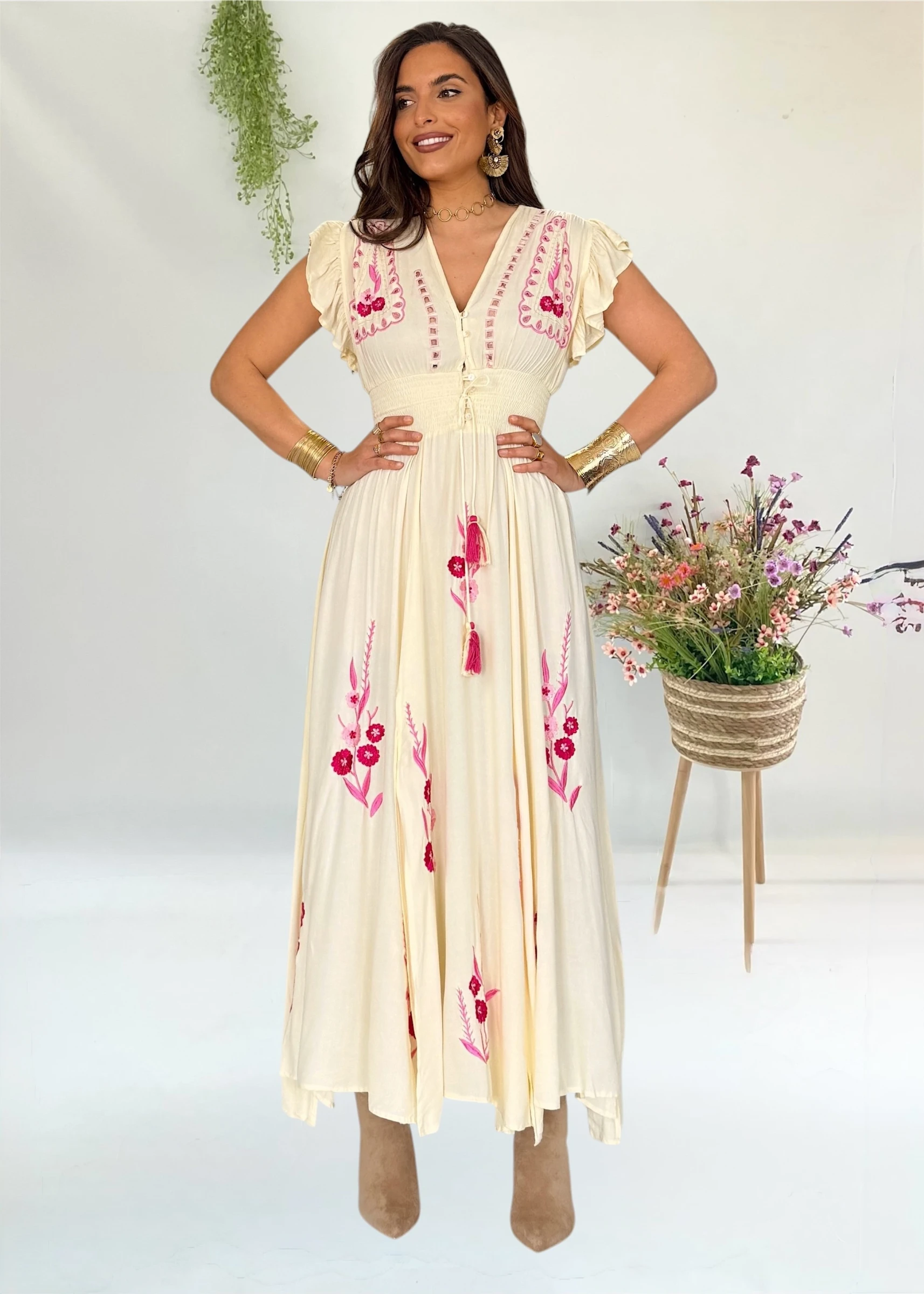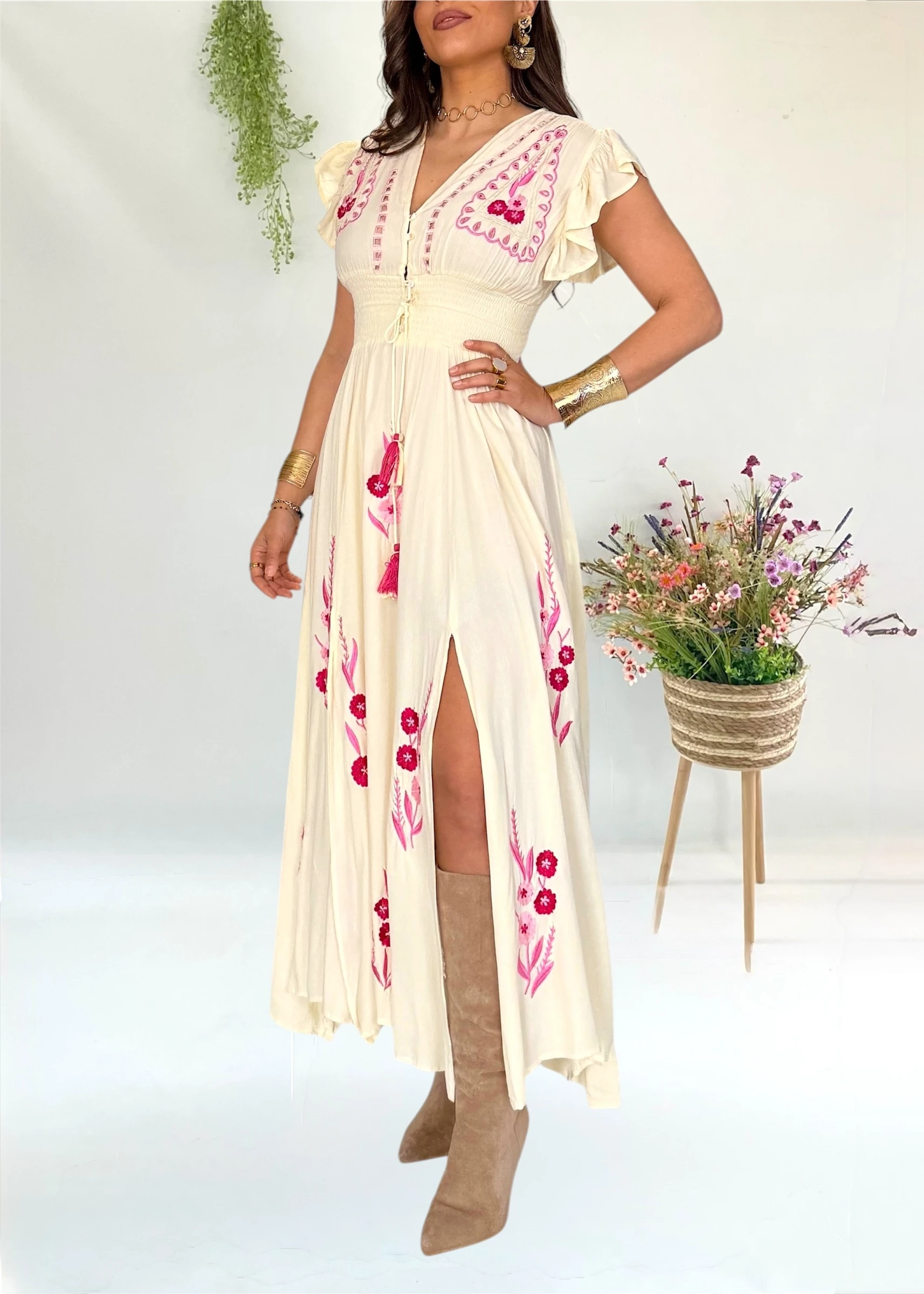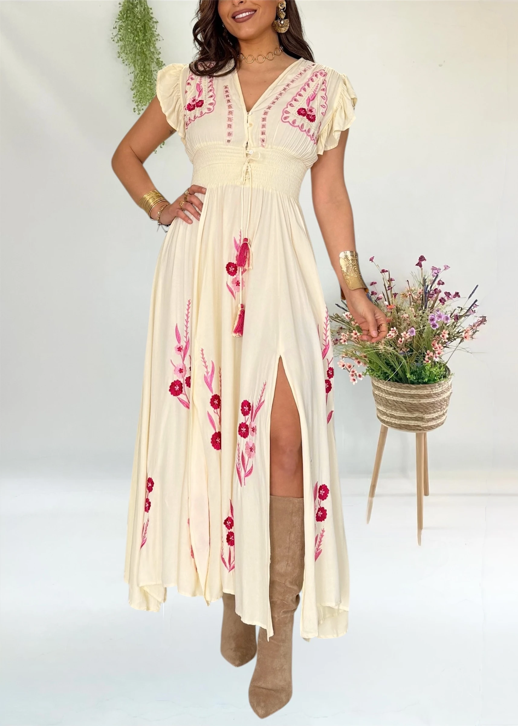 Vestido boho amarillo mantequeilla con bordados en fucsia y abertura frontal