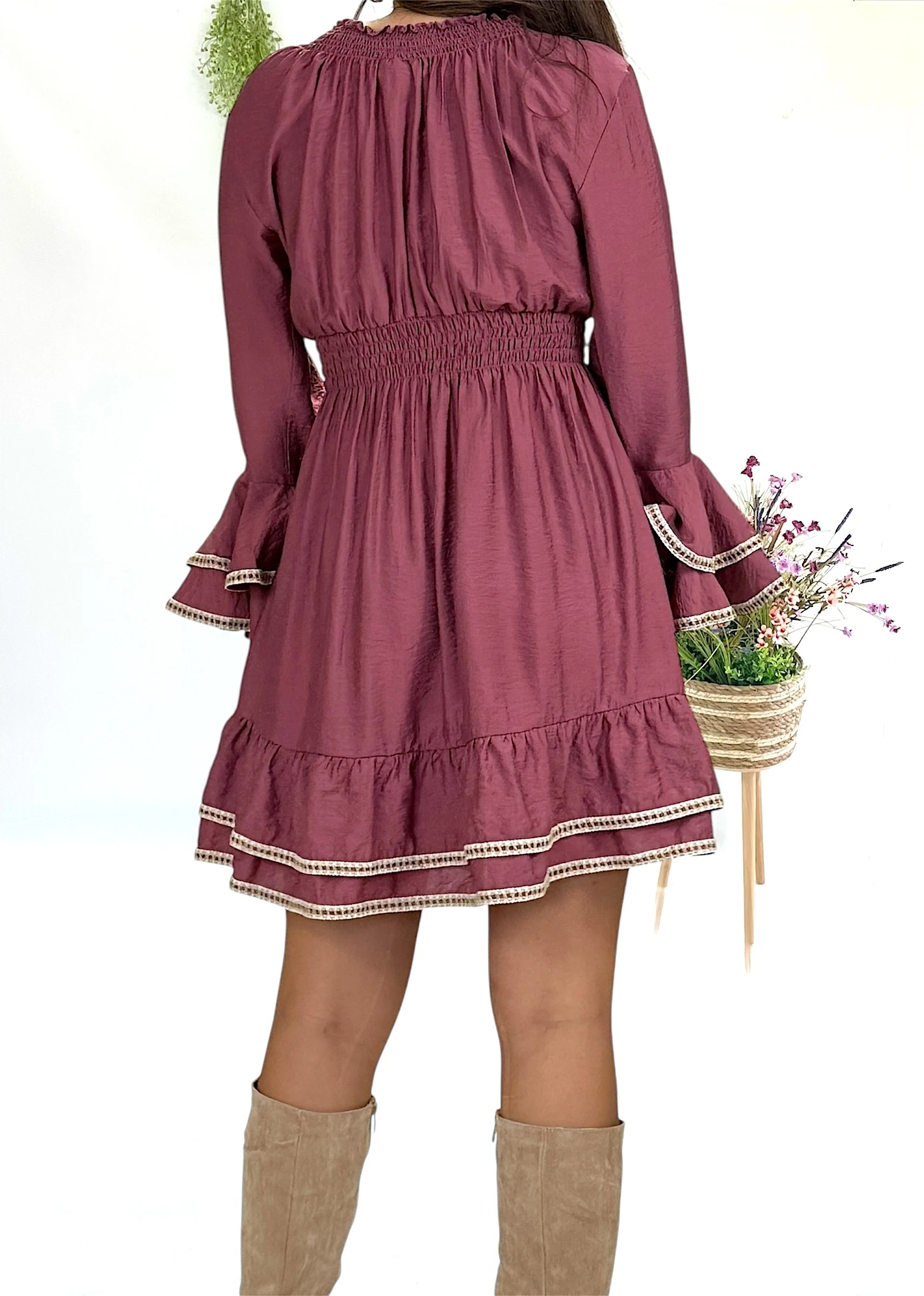 Vestido color borgoña de la firma Trilce, diseño y moda española. Lleva doble volante en las mangas y en el bajo, decorado con cintas en tonos beige.