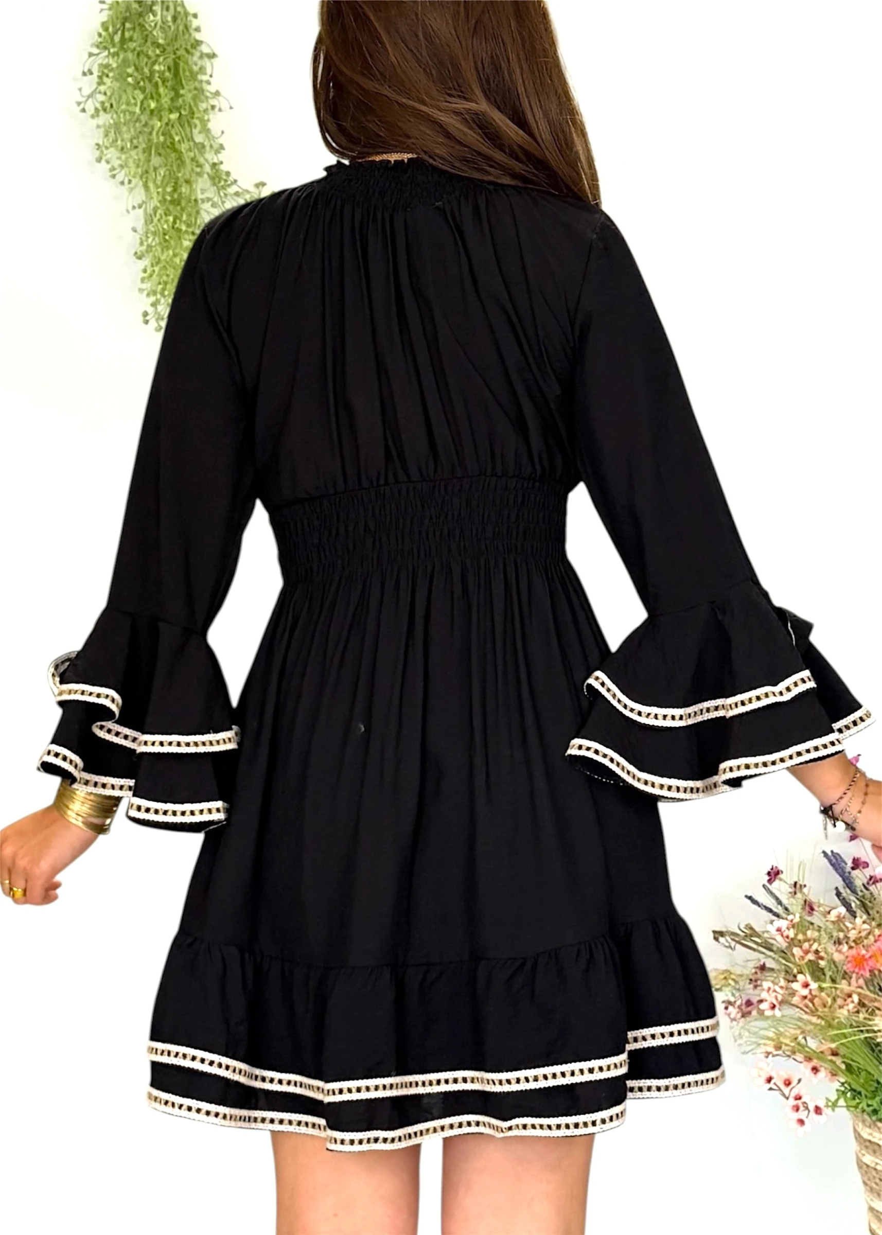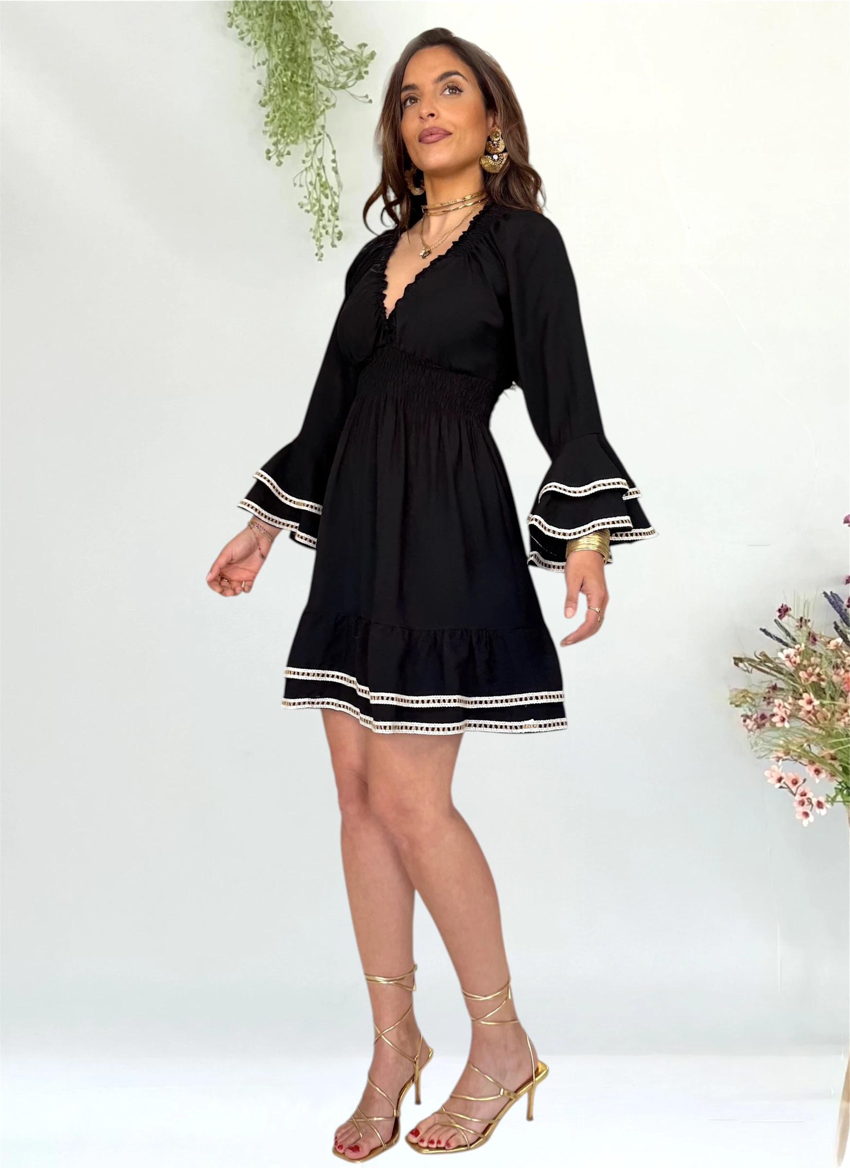 Vestido negro con mangas acampanadas y detalles en contraste 🌹 fluido, estiloso y con un movimiento que enamora ✨