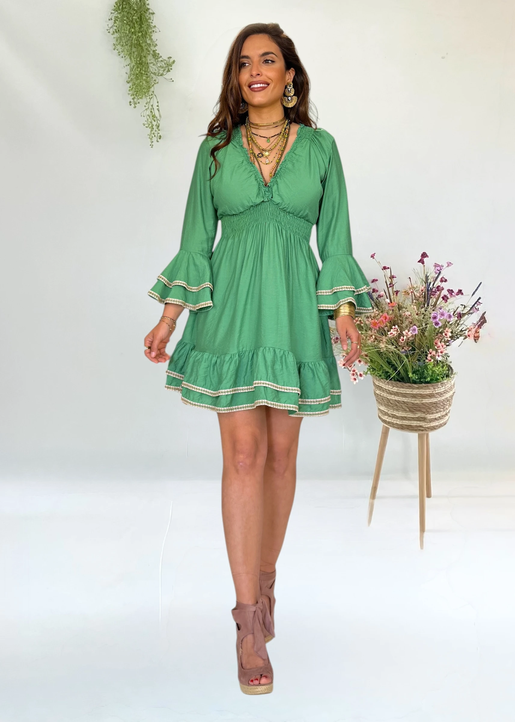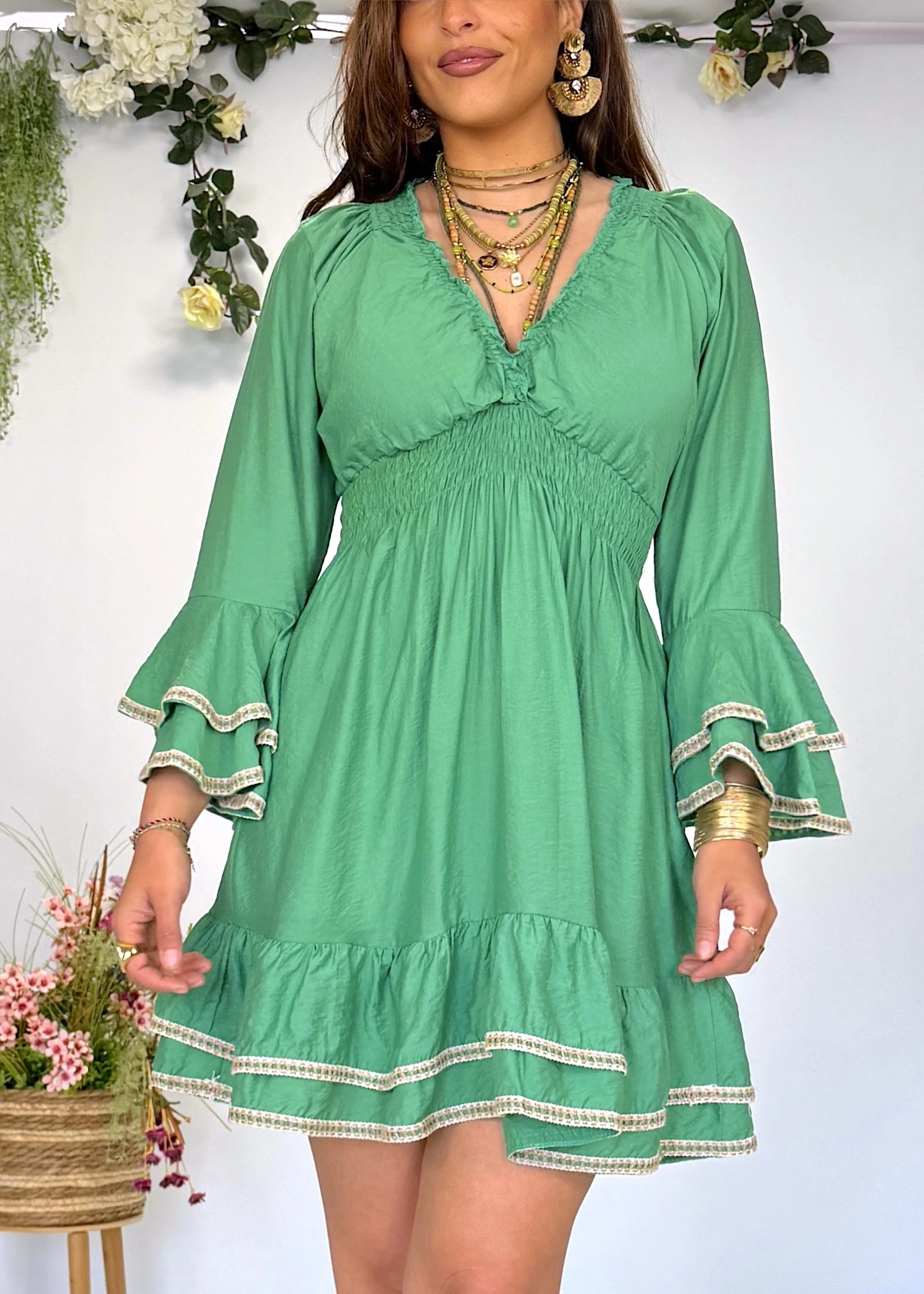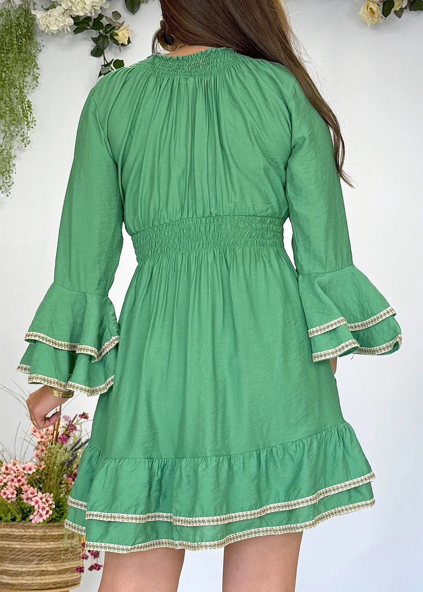 Vestido verde con mangas acampanadas y detalles en contraste 💚 fluido, estiloso y con un movimiento que enamora ✨