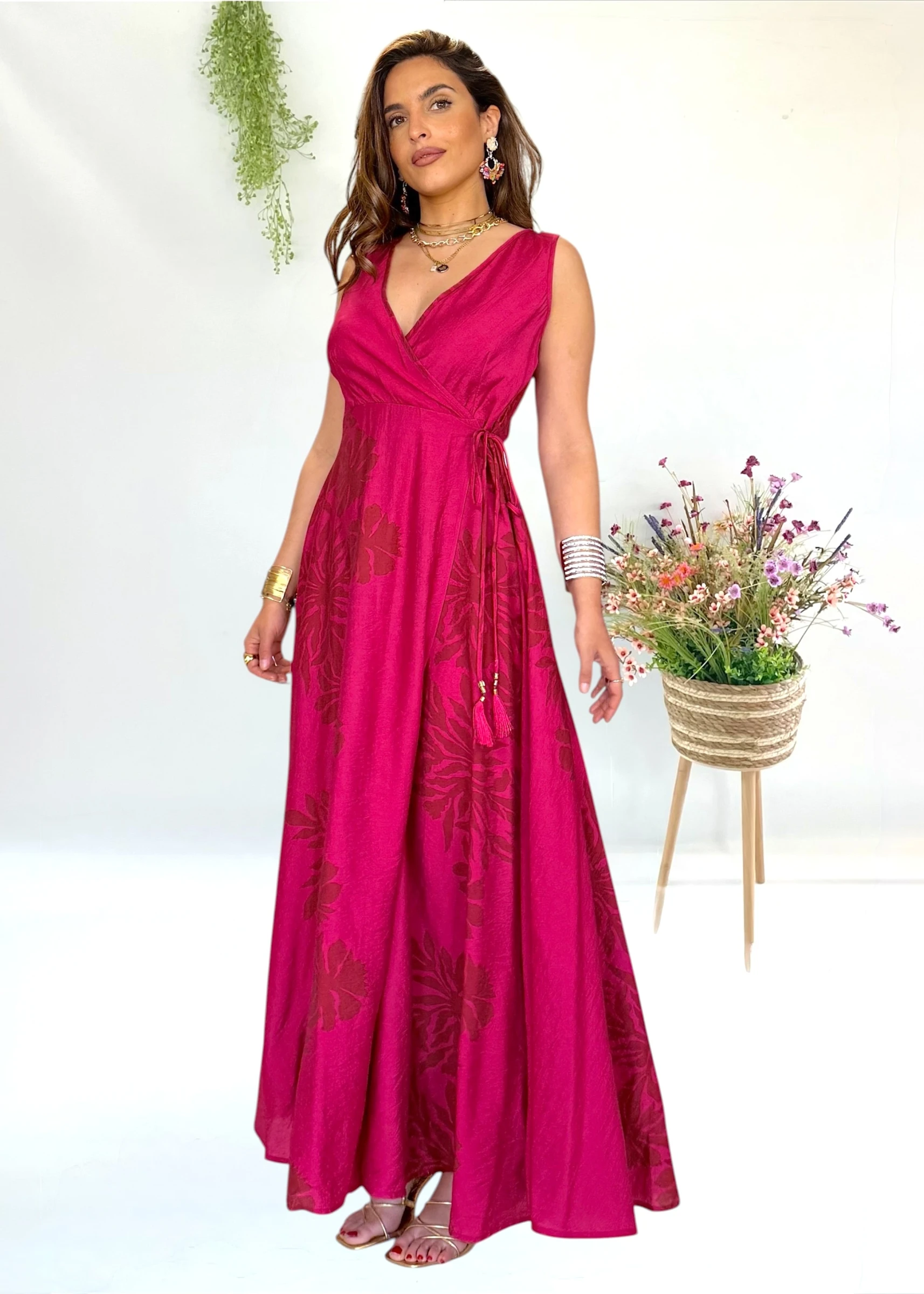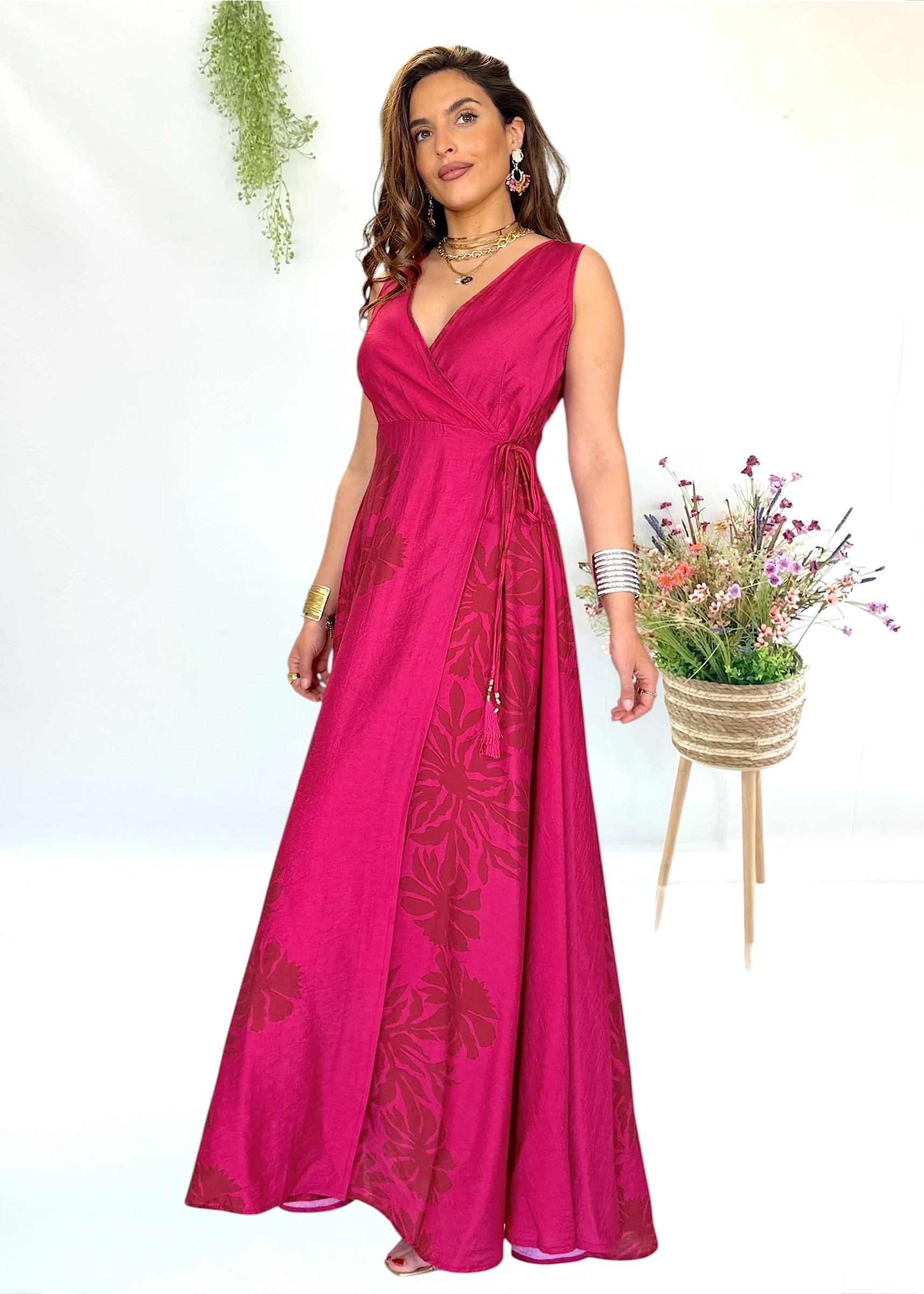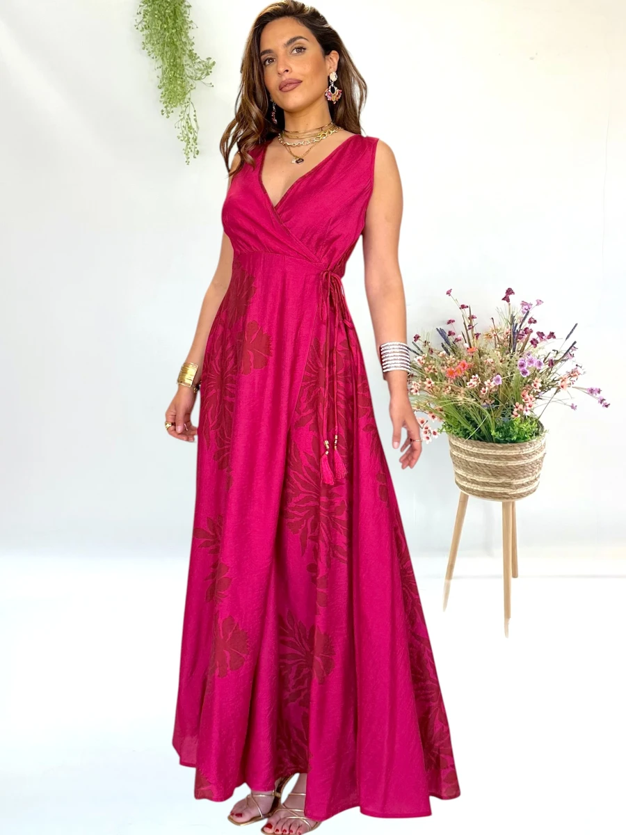 Vestido largo cruzado color buganvilla con caída fluida y abertura que solo se abre si quieres lucir pierna.