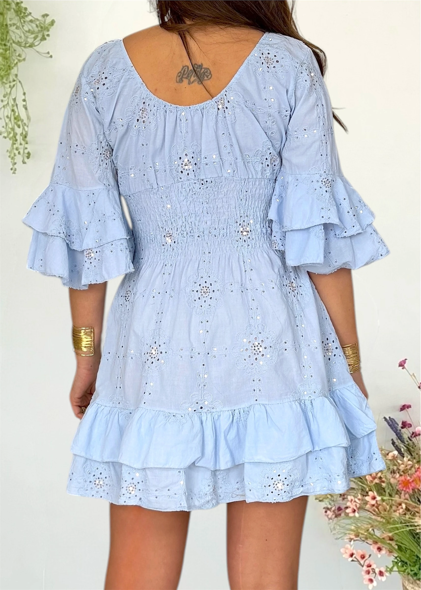 Vestido azul con bordados y volantes 🩵 luminoso, dulce y con un brillo sutil que lo hace aún más especial ✨