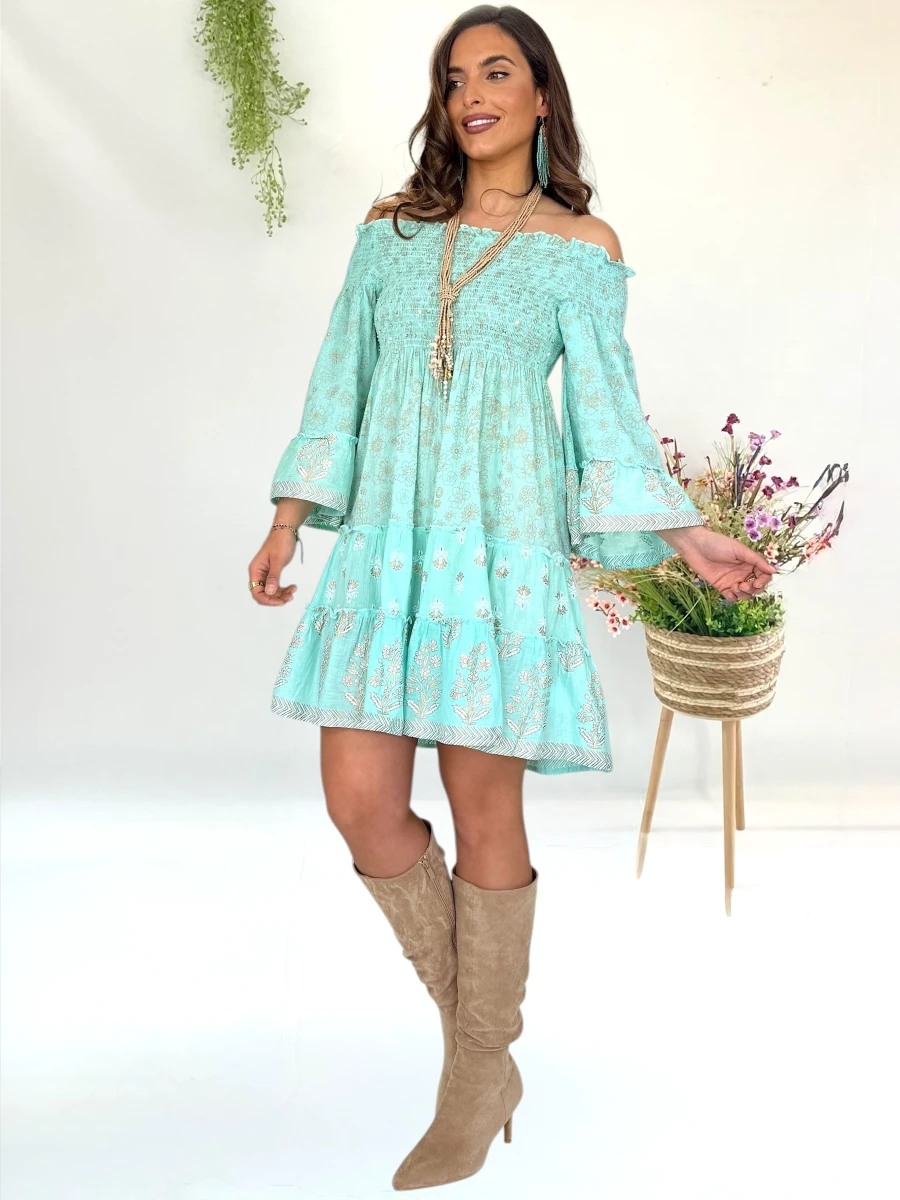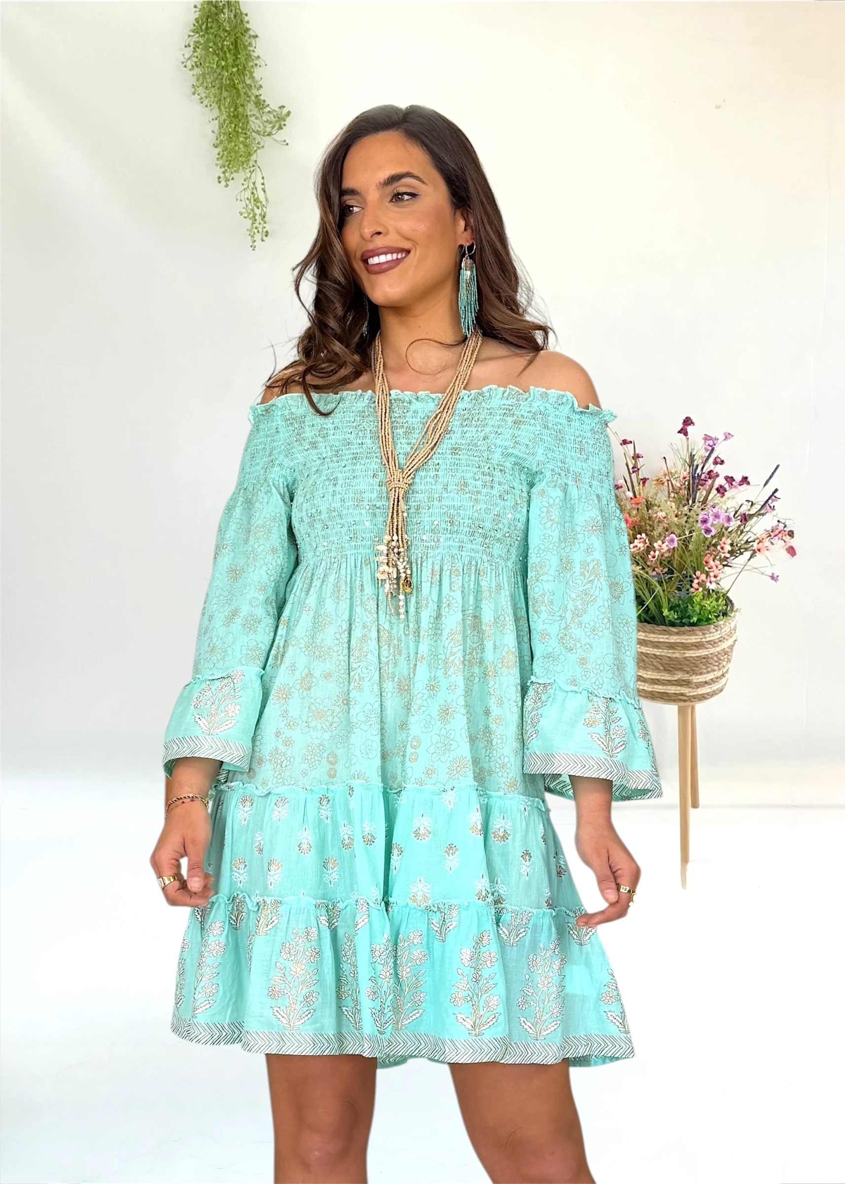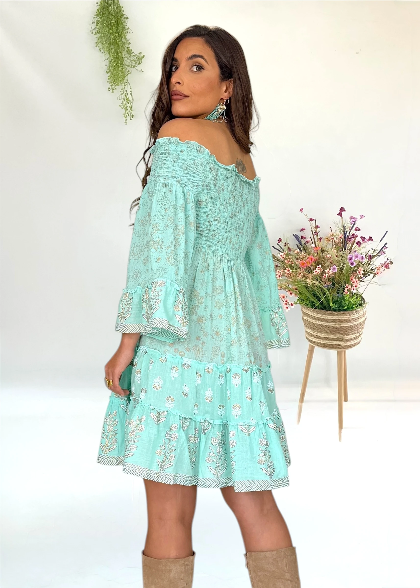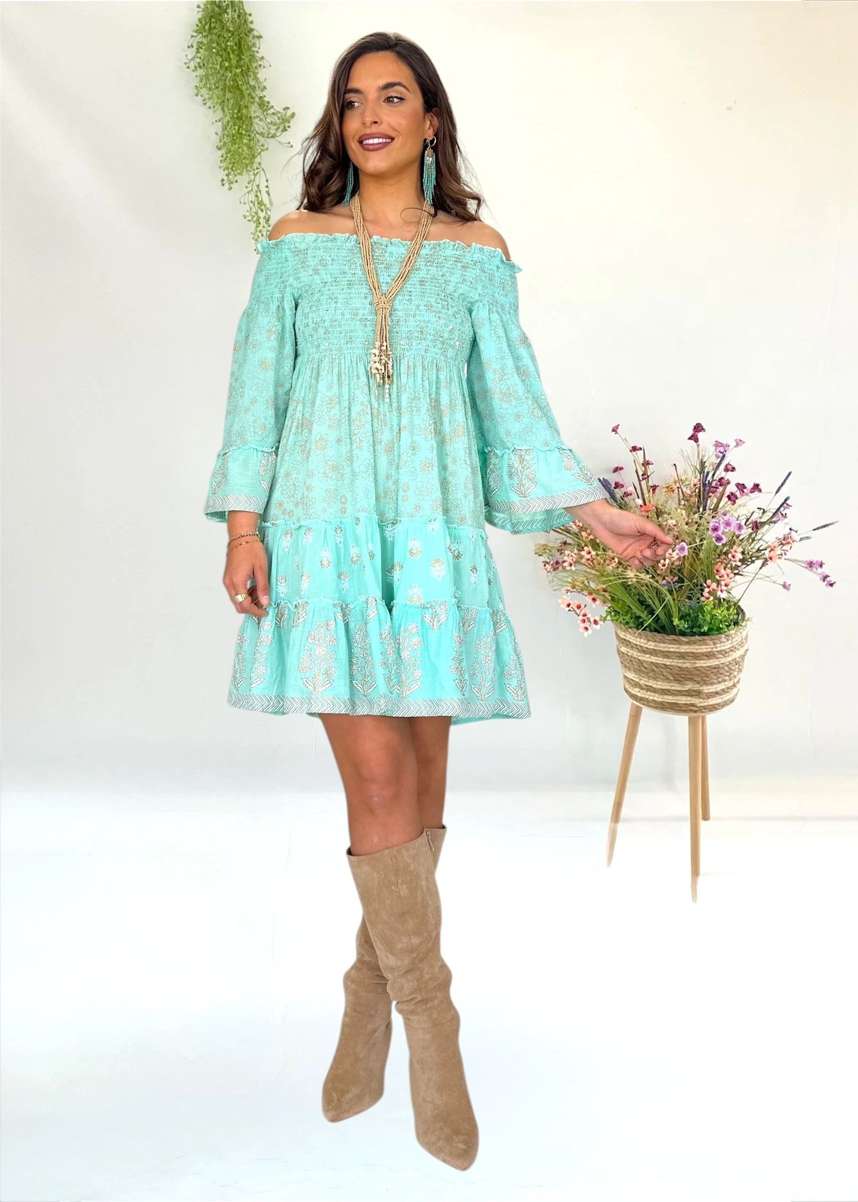 Este vestido en color aguamarina es pura frescura y estilo 💚. Su diseño fluido con bordados sutiles aporta ese aire boho tan especial que no pasa desapercibido.