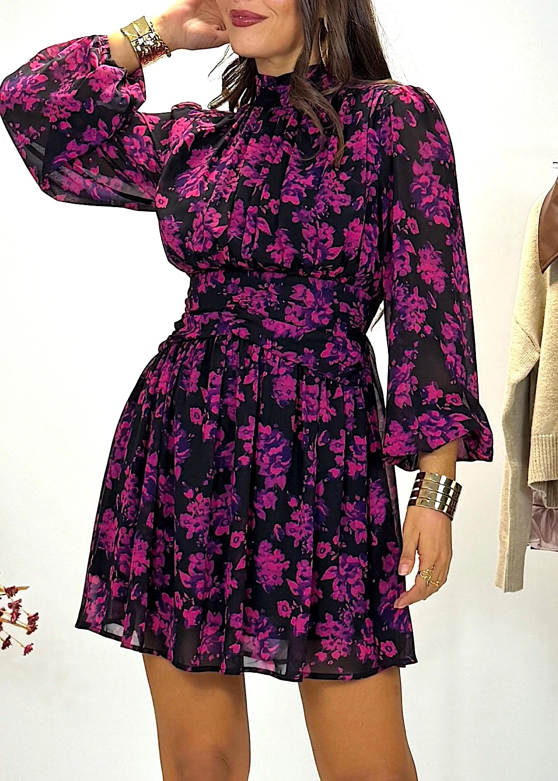 El fajín delantero realza la cintura, mientras que el elástico en la espalda ofrece un ajuste cómodo. Las mangas terminadas en puño elástico aportan un toque romántico. Forrado