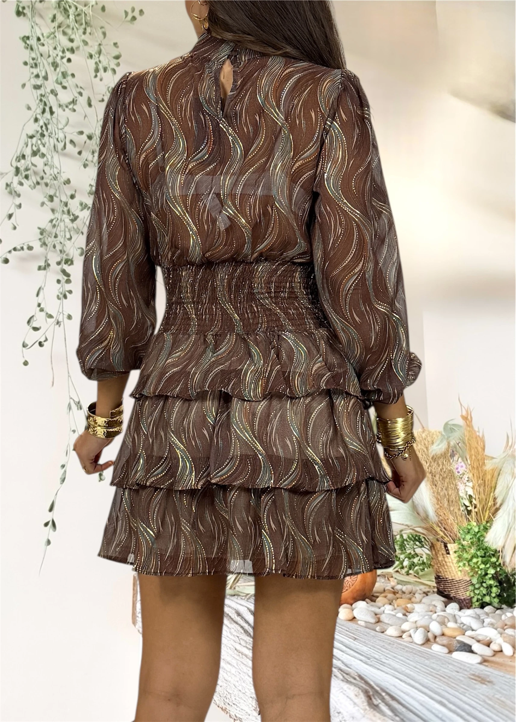 Vestido de gasa estampado fondo marrón y verde con pequeños detalles en dorado suave con mangas abullonadas y falda de volantes, una prenda femenina y favorecedora que combina movimiento y estilo.