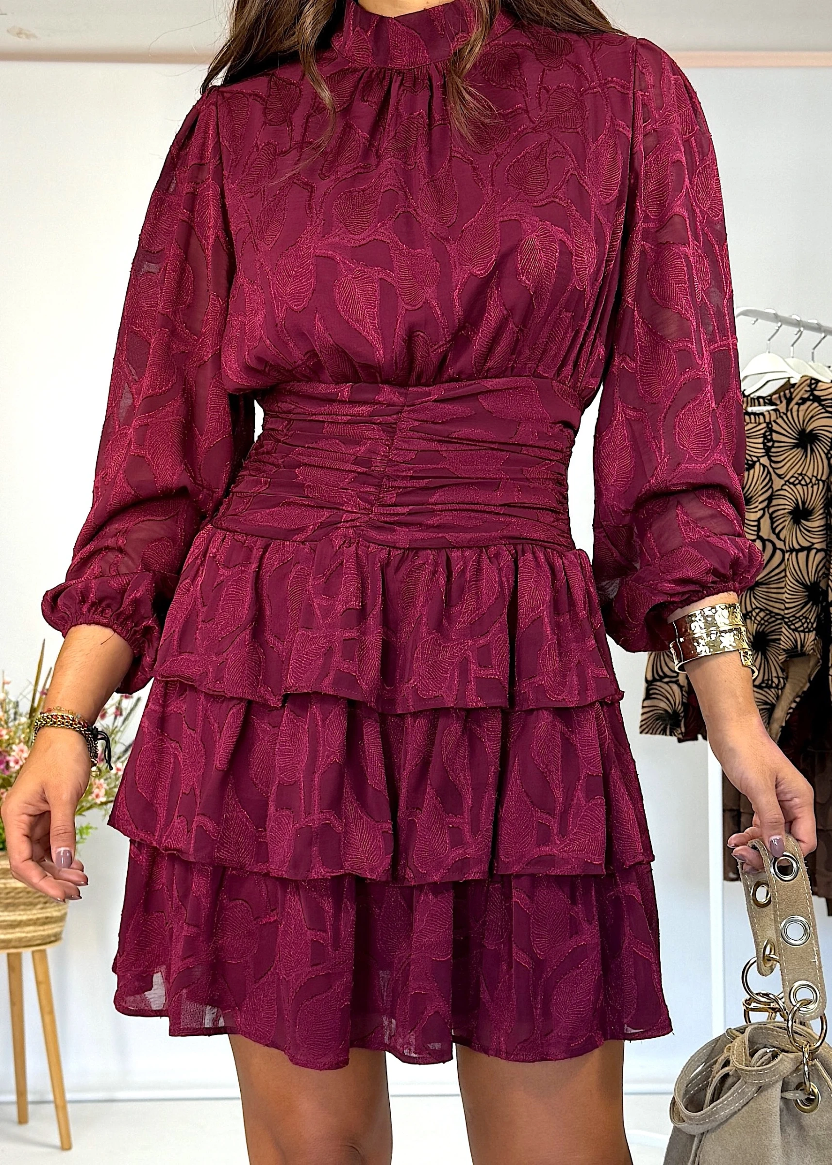 Vestido granate de gasa con mangas abullonadas y falda de volantes, una prenda femenina y favorecedora que combina movimiento y estilo.