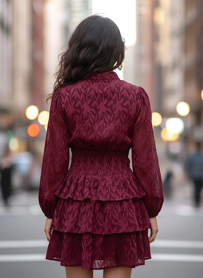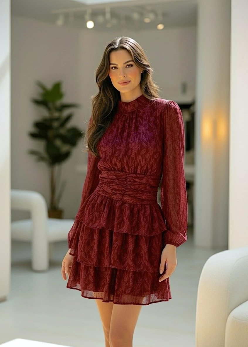 Vestido granate de gasa con mangas abullonadas y falda de volantes, una prenda femenina y favorecedora que combina movimiento y estilo.